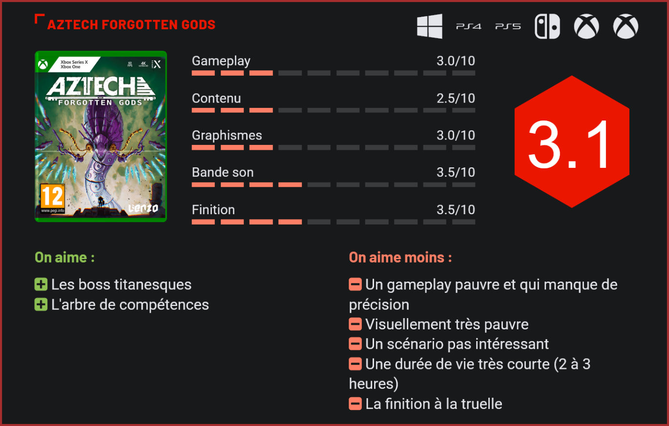 Le petit studio mexicain Lienzo s’est fait connaitre avec le sympathique Mulaka, un jeu d’action-aventure qui proposait de s’imprégner de la culture Tarahumara. Plus ambitieux, son nouveau projet avait tapé dans l’œil de pas mal de joueurs… Changement radical de ton pour le nouveau projet du studio Lienzo. Exit l’action-aventure, place cette fois-ci à un jeu d’aventure en monde ouvert, plus ambitieux, qui propose également des phases de combat plus nerveuses, face à des boss gigantesques. Aztech Forgotten Gods avait de quoi impressionner à travers les premières images révélées avec ses boss titanesques. Le résultat n’est toutefois pas à la hauteur de nos attentes… Les quelques boss que vous affronterez sont, en effet, gigantesques. Tout partait pourtant de très bonnes intentions. A commencer par l’univers du jeu, une métropole mésoaméricaine futuriste qui fait office de vaste open-world dans lequel le joueur peut voyager librement. L’histoire d’Aztech nous place dans la peau d’Achtli, une jeune femme aztèque qui va être amenée à affronter les anciens dieux oubliés pour sauver ses proches. On sent ici plusieurs influences : Zelda pour la structure, God of War pour les combats, mais aussi un certain Prototype pour la façon dont notre personnage se déplace dans la ville… Très ambitieux, le projet ne montre toutefois jamais son réel potentiel. On le sent, les développeurs ont été beaucoup trop ambitieux et n’ont pas déployé assez de moyens pour ce projet. Niveau sonore, pas de thème qui résonne dans l’esprit, ni de doublages d’ailleurs. Il faudra se contenter de quelques lignes de dialogue pour suivre l’intrigue. Celle-ci n’est elle aussi guère vraiment travaillée. On débarque dans un univers sans trop savoir qui l’on est ni où on se trouve exactement, et on suit les balises qui apparaissent à l’écran pour progresser à travers l’intrigue. L’histoire n’a pas vraiment de rebondissements et l’écriture est si peu intéressante qu’on en vient vite à zapper tous les dialogues pour aller droit à l’essentiel. Vous serez amené à résoudre l’une ou l’autre énigme. Côté gameplay, Aztech a également tendance à partir dans toutes les directions sans trop savoir comment s’y prendre. En intérieur par exemple, on est pratiquement face à un walking simulator, lent et sans aucun intérêt. En extérieur, on virevolte entre les pyramides grâce à son gant à propulsion, relativement fun à utiliser, mais à l’autonomie désastreuse (en début d’aventure). Le monde ouvert qui nous est offert est vide, ne contient que quelques petites activités secondaires sans grand intérêt (des courses aussi pénibles que peu nombreuses, des combats qui auraient très bien pu être directement intégré au jeu), et manque surtout de la moindre subtilité. Vous ne pourrez pas prendre ici le volant de véhicule, interagir avec des PNJ ni participer à la moindre activité. En réalité, le monde ouvert qui nous est proposé ici ne sert strictement à rien… si ce n’est à interrompre des phases de combat. Car entre deux allers-retours, il faudra fracasser des ennemis qui n’opposeront aucune résistance, avant de pouvoir enfin affronter les boss titanesques aperçus dans le trailer du jeu. Et là aussi, c’est la déception. Les commandes de jeu manquent de précision, les “patterns” des boss sont faciles à deviner et le tout est si bugué qu’on en vient vite à complètement déchanter. On le reconnaîtra toutefois : ces gigantesques créatures en jettent. On peut circuler librement dans la mégalopole. Avec ses malheureuses petites heures de temps de jeu, Aztech ne parvient pas à proposer un challenge à la hauteur de nos attentes. L’open world ici proposé est complètement sous-exploité. Il y a certes quelques bonnes idées comme la capacité de notre personnage à voler dans les airs ou le système de combat dynamique qui s’inspire (un peu) de God of War. L’ennui, c’est que pad en main, on s’ennuie ferme. La structure du jeu est médiocre, les séquences narratives ratées, et le seul intérêt réside finalement dans les combats de boss, qui se comptent sur les doigts d’une main. Les textures sont atrocement pauvres. Techniquement, Aztech ne parvient pas non plus à impressionner. Les textures du sol sont atrocement pauvres, l’univers du jeu manque cruellement de vie, les bugs sont nombreux et la plupart des personnages modélisés à la truelle. Seule l’héroïne et quelques ennemis semblent avoir eu droit à une attention particulière. La réalité, c’est que le jeu est loin d’être aussi joli que sur les quelques screenshots montrés par le studio. S’il partait sur de bonnes intentions, ce projet a clairement été victime d’un manque de moyens et de temps. Cela n’a pas empêché le studio de facturer son jeu presque plein pot. Il faudra débourser 29,99€ pour en faire l’acquisition sur le support de son choix. Un tarif beaucoup trop élevé une fois encore pour un titre qui se boucle en moins de 3 heures et sur lequel vous ne reviendrez sans doute jamais. C’est d’autant plus dommage, que sur le papier, le projet était sans doute prometteur. Conclusion Après le sympathique Mulaka, le studio mexicain Lienzo semble avoir eu les yeux plus gros que le ventre pour sa nouvelle production. S’il était prometteur sur le papier, Aztech Forgotten Gods est loin d’être le jeu d’action/aventure dont on rêvait. Lienzo a été beaucoup trop ambitieux avec ce projet. Au niveau de sa structure tout d’abord. Le titre est présenté comme un open-world. L’univers du jeu est toutefois pauvre et son open-world ne sert finalement pas à grand chose si ce n’est à entrecouper les combats de longs allers-retours. Lienzo pioche également son inspiration à gauche et à droite. Du côté de God of War pour ses combats, et d’un Prototype pour les déplacements d