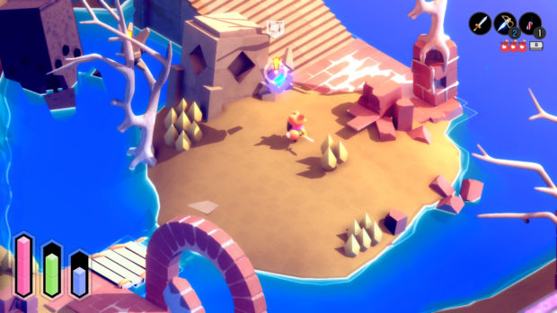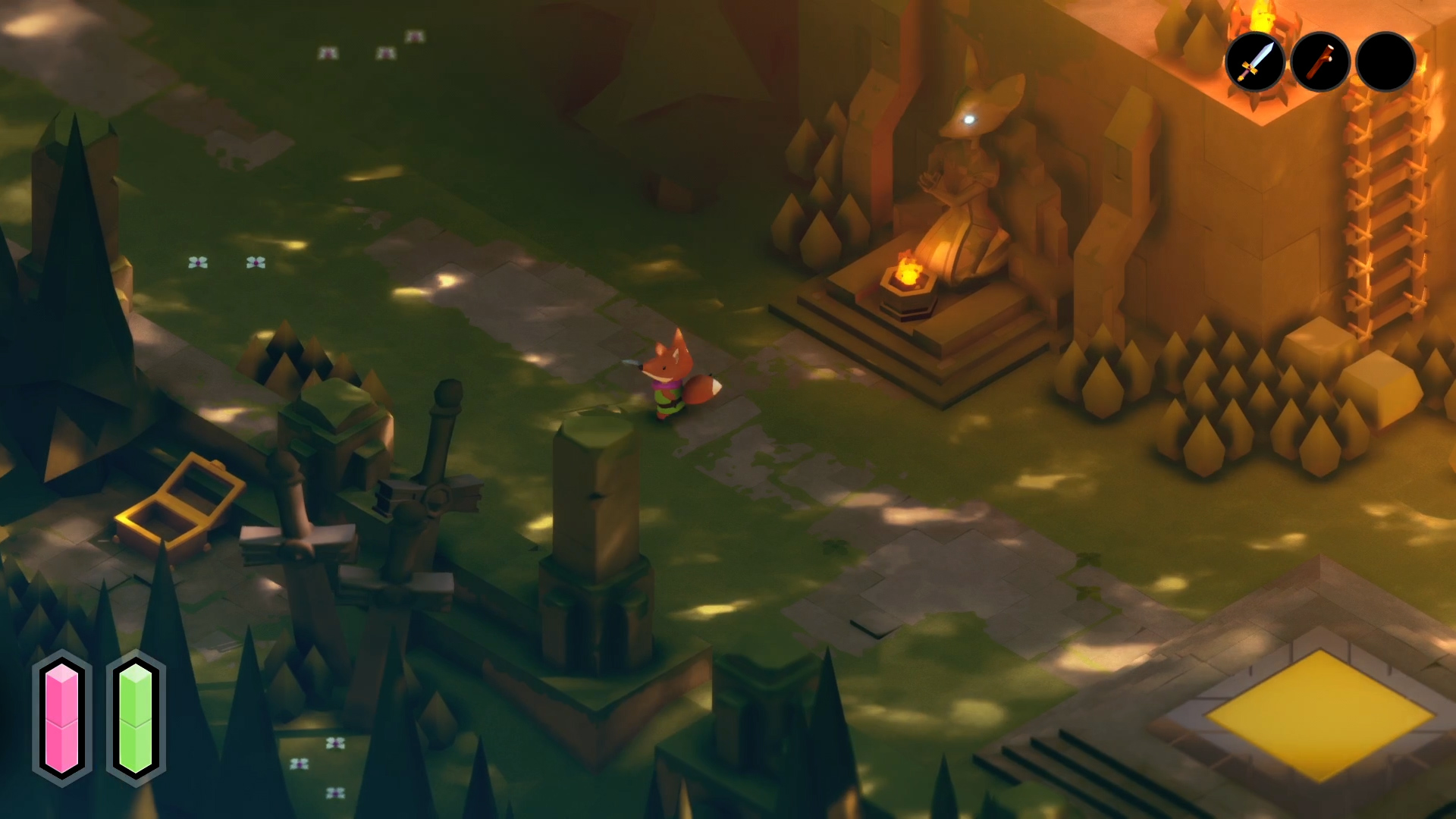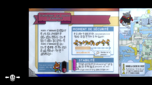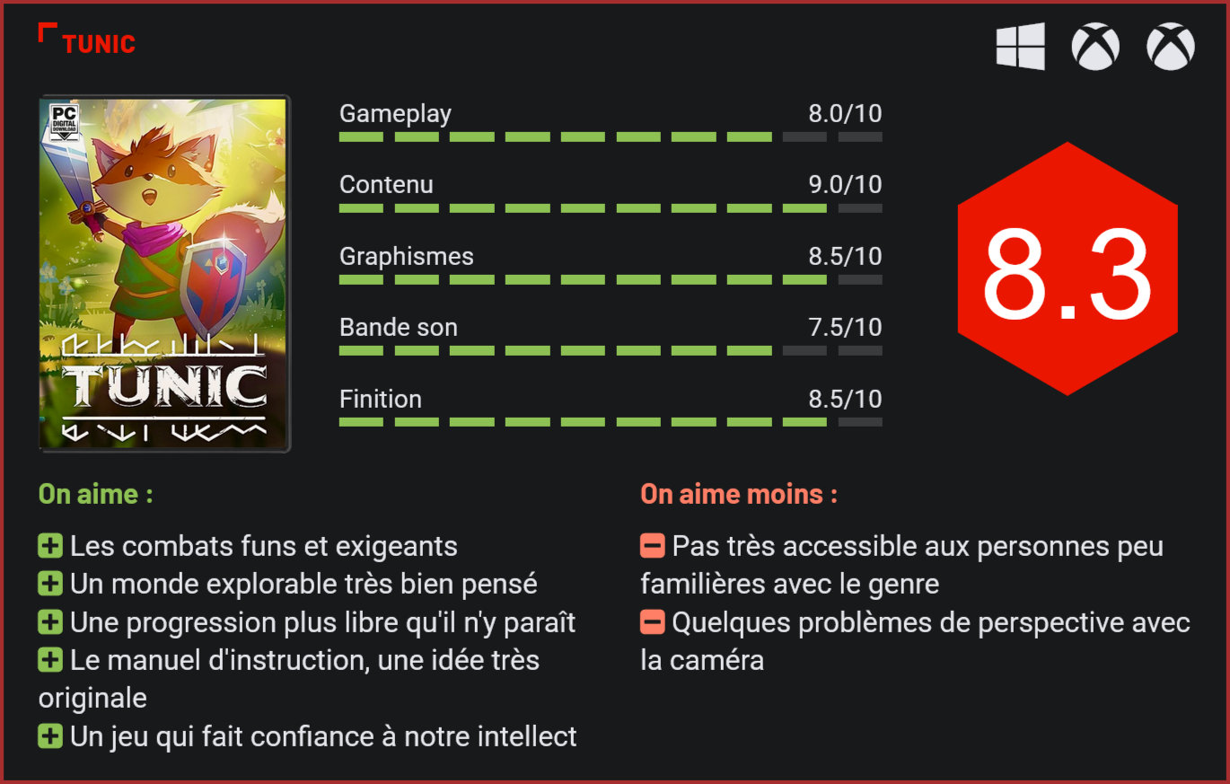 Le projet est attendu depuis plusieurs années par les fans de jeux indépendants, Tunic est un Zelda-like au style graphique particulièrement charmant. Mais ce n’est pas là sa seule qualité puisque le titre se montre très convaincant sur bien d’autres aspects. Tunic débarque sur consoles Xbox et sur PC plusieurs années après son annonce. S’il a tout de même été aidé par différents artistes et par l’éditeur Finji, le titre a été majoritairement conçu par Andrew Shouldice, un développeur indépendant canadien qui travaillait avant ça dans le studio Silverback Productions. Celui-ci s’est lancé il y a plusieurs années dans le développement d’un jeu à lui tout seul, une bien belle histoire puisque le résultat s’avère de très bonne qualité. Le titre s’inspire évidemment de The Legend of Zelda, mais pas que. Tunic raconte les aventures d’un petit renard anthropomorphe qui découvre un nouveau monde qu’il va explorer. Celui-ci va alors devoir découvrir différents lieux chargés d’histoire et marcher dans les pas d’un héros ayant combattu le mal par le passé. Le scénario de Tunic est particulièrement léger et peu compréhensible au premier abord. Des détails sur l’univers et des informations nous sont données au fil du jeu, notre quête va surtout nous emmener dans différents lieux à la recherche de trois artefacts mystérieux. Le scénario n’est véritablement qu’un prétexte à l’aventure. Tunic est un jeu d’action et d’aventure qui se joue avec une caméra isométrique. La dégaine de notre personnage et l’aspect général du jeu font évidemment penser à certains épisodes de The Legend of Zelda, Tunic offre également un mélange d’action et de réflexion. Notre personnage peut manier différentes armes, faire des roulades, utiliser de la magie et des objets, on obtient vite un bouclier permettant de se défendre et le gameplay repose aussi sur une jauge d’endurance qui nous rend très vulnérable quand elle est vide. Le titre propose en fait des mécaniques qui le rapproche des Souls-like. Sans pour autant atteindre la difficulté d’un jeu From Software, Tunic propose tout de même un peu de challenge, et notre mort va laisser un fantôme qui détient un peu de notre argent qu’il faut aller récupérer. Certains ennemis et boss demandent un peu de patience et de persévérance. Le gameplay est très agréable, les combats sont fluides même si la caméra peut parfois nous induire en erreur à cause de la perspective. Les combats peuvent parfois être corsés. L’un des véritables points forts du titre réside dans son monde explorable qui, s’il paraît cloisonné au premier abord, offre plus de liberté qu’il n’y paraît. Tunic propose un level design particulièrement bien pensé. Le monde se divise en de grands environnements qui mènent vers tout un tas de zones plus modestes. On y trouve de nombreux coffres permettant d’amasser des objets, des fragments de potions pour se soigner, des effets passifs à équiper… On y trouve également des objets qui, en échange d’argent, peuvent servir d’offrandes aux statues de sauvegarde afin de rendre notre personnage plus résistant et plus fort. Tunic fonctionne un peu comme un jeu Metroid en nous donnant de nouveaux outils pour explorer différemment des endroits déjà parcourus. À la différence qu’il n’est pas souvent question ici d’objets qui nous permettent de faire de nouvelles choses, mais plutôt de connaissances des compétences de notre personnage. Celui-ci peut effectuer toute une palette d’actions et le jeu oublie volontairement de nous en informer. Pour comprendre toutes ces mécaniques, il faut trouver des pages de ce qui ressemble beaucoup à un manuel d’instruction, un manuel très détaillé avec des illustrations, des cartes et des astuces, une idée originale et un véritable hommage aux manuels que les jeux proposaient à une certaine époque. Ces instructions sont primordiales pour comprendre comment Tunic fonctionne, mais la majorité des textes sont écrits dans la langue imaginaire du titre. On comprend en fait de nombreuses mécaniques du jeu par déduction et grâce à nos habitudes en tant que joueuses et joueurs. Toutes ces connaissances qui nous sont révélées au fil du jeu permettent à Tunic d’avoir une progression plutôt libre, nous laissant explorer les différentes zones dans un ordre qui dépend de nos découvertes. Tunic attend que les joueuses et les joueurs comprennent de nombreuses mécaniques par eux-mêmes, sans nous tenir la main et en faisant appel à notre intellect et à notre curiosité. Le jeu propose d’ailleurs de très nombreux secrets et beaucoup de passages cachés par la perspective, ce qui récompense beaucoup si vous fouillez les environnements de fond en comble. Cet aspect du jeu ne plaira pas à tout le monde, mais si vous aimez vous perdre, fouiller chaque recoin de la carte et vous creuser les méninges pour comprendre quoi faire, Tunic propose une approche intelligente et originale pour ce genre de titres. Le manuel d’instruction regorge de détails. Si on se souvient de lui lors de ses présentations ces dernières années, c’est évidemment grâce à sa direction artistique charmante. Les décors sont parfois réalisés dans un style “low poly” qui donne un côté mignon à l’ensemble, le titre arrive à proposer des décors magnifiques et très colorés grâce à ses lumières maîtrisées. La bande-son se montre également très convaincante, elle est généralement plutôt calme et envoûtante, ce qui donne une ambiance apaisante au titre. Mais malgré sa direction artistique toute mignonne et son inspiration des classiques de Nintendo, Tunic n’est pas un jeu qui se montre particulièrement accessible à tous. Si la difficulté des combats peut être ignorée grâce aux modes “sans échecs” ou “aucune restriction d’endurance” trouvable dans les