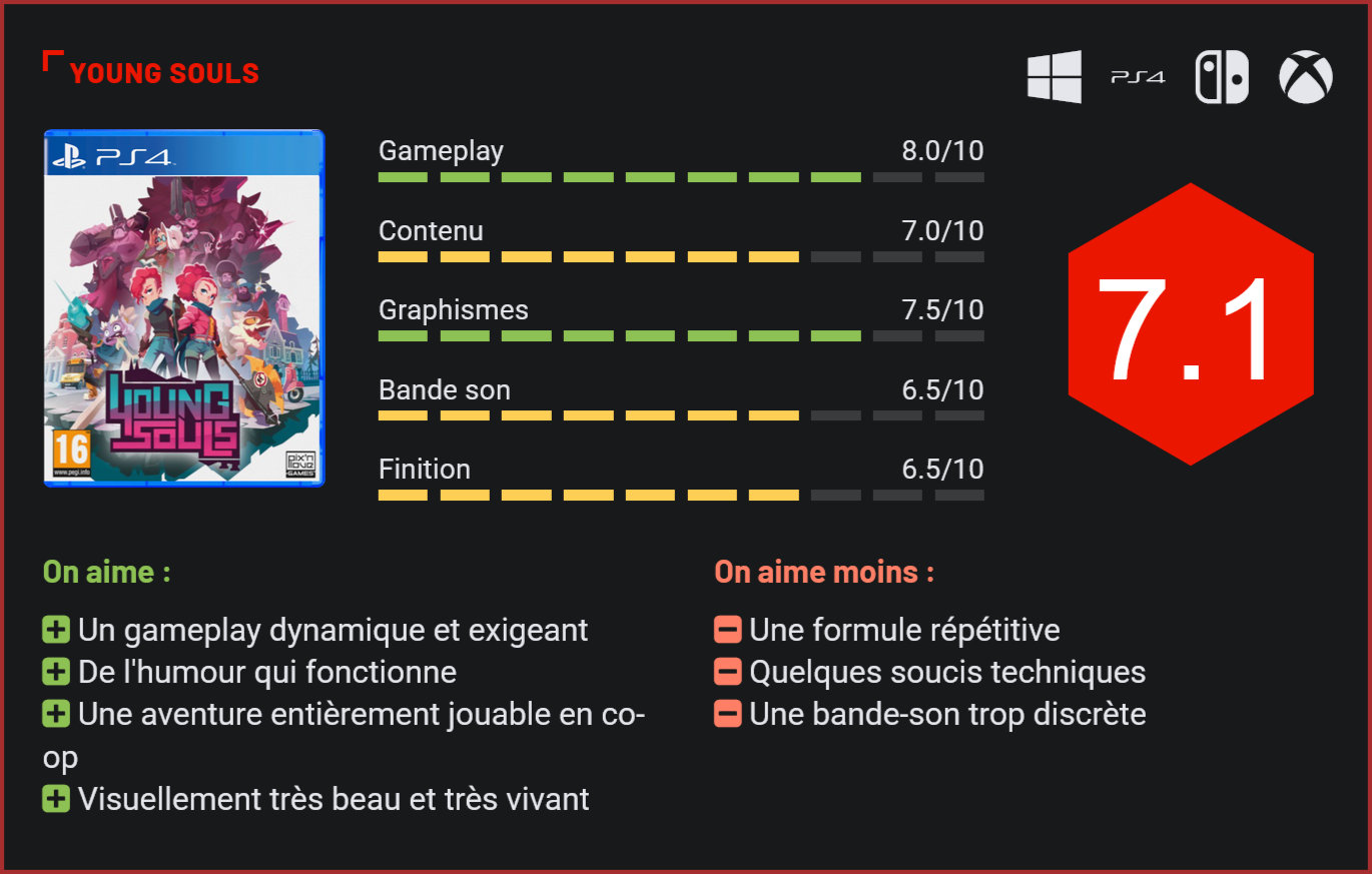Disponible en exclusivité sur Google Stadia depuis l’été dernier, Young Souls débarque enfin sur consoles et PC. Le petit studio français 1P2P nous livre une très belle aventure. Si les membres du studio ont travaillé auparavant dans d’autres boîtes françaises telles que Ankama (Dofus, Wakfu…) et Hydravision (ObsCure, Alone in the Dark), Young Souls est leur premier jeu en tant que nouveau studio indépendant. Les membres de 1P2P proposent un action-RPG jouable en coopération (uniquement hors-ligne) au gameplay proche des beat’em up tel que Streets of Rage mais avec des éléments de jeu de rôle en prime. S’il était réservé aux utilisateurs de Google Stadia, le titre est depuis peu disponible sur toutes les consoles et PC, ainsi que sur le Game Pass. Le titre nous fait suivre l’histoire de Jenn et Tristan, les jumeaux flamboyants, orphelins depuis leur plus jeune âge. Ceux-ci sont recueillis par le Professeur, un scientifique qui les traite comme ses propres enfants. Mais ce dernier disparaît mystérieusement au début de l’aventure. En explorant son laboratoire, les jumeaux tombent sur un portail qui les emmène dans un monde parallèle où se trouve une société de gobelins. Ceux-ci apprennent alors que leur père adoptif a été enlevé par de dangereux habitants de ce monde. Ils vont cependant pouvoir compter sur la technologie du professeur ainsi que sur l’aide de différents gobelins pour explorer des donjons et atteindre leur objectif. La ville est explorable à tout moment. Young Souls est donc un action-RPG dont le gameplay ressemble surtout à un beat’em up classique. Le jour, les jumeaux peuvent se balader tranquillement en ville pour acheter des vêtements et se préparer. La nuit, ceux-ci traversent le portail pour combattre des gobelins. Les donjons sont divisés en courts niveaux dont la plupart sont optionnels. Dans ces niveaux se cachent tout un tas d’ennemis à affronter ainsi que des coffres contenant objets et pièces d’équipements. Les jumeaux sont tous deux contrôlables, jouer en coopération permet de contrôler les deux en même temps tandis que ceux qui veulent jouer seuls peuvent permuter entre les deux à tout moment. La panoplie de mouvements reste classique, avec un bouton d’attaque, des objets qui servent dans différentes situations, une parade ainsi que des esquives très limitées par une jauge d’endurance. Jenn et Tristan ont tous deux un gameplay identique, mais celui-ci va varier selon l’équipement attribué à chacun d’entre eux. Le poids de l’équipement va non seulement changer la vitesse des personnages, mais en plus, quatre types d’armes aux attaques différentes sont disponibles. Il est possible de construire les deux personnages différemment. Ces niveaux courts permettent d’avancer rapidement dans le scénario mais il est tout de même conseillé de passer par les niveaux annexes pour amasser de l’expérience et de l’équipement. Young Souls montre très vite son véritable visage, celui d’un jeu plutôt difficile. Même si de nombreux ennemis sont coriaces, ce sont principalement les boss qui vont poser problème. Ceux-ci sont particulièrement réussis, ils se montrent rapides et possèdent plusieurs phases et barres de vie. Il faut alors utiliser tous les outils à notre disposition pour les vaincre. De nombreuses options d’accessibilités permettent d’alléger un peu la formule, mais même dans sa difficulté la plus basse, le titre ne se laisse pas faire. Le titre est forcément assez répétitif puisque tabasser du monstre est notre tâche principale. Mais le gameplay se montre très efficace, possède quelques subtilités et ne manque pas de répondant. L’attrait du loot et de l’expérience donne de bonnes raisons de parcourir entièrement les donjons, permettant aussi d’alléger un peu la difficulté. Une formule qui devient vite addictive pour peu que l’on accroche à son gameplay. Le titre possède cependant quelques petits soucis de performance, en particulier sur Switch où les chutes de framerate surgissent de temps en temps. Certains boss sont très coriaces. Le titre de 1P2P frappe également fort grâce à sa très bonne direction artistique. Les personnages et les décors semblent tout droit sortis d’un dessin animé, Young Souls utilise un mélange de 2D et de 3D qui rend particulièrement bien. Les personnages sont bien animés et ne manquent pas de vie. On sent que beaucoup d’efforts ont été fournis sur cet aspect, au point de montrer les équipements et vêtements que l’on choisit directement sur Jenn et Tristan. Le titre n’hésite pas non plus à utiliser des séquences d’animations comme cinématiques lors des passages les plus importants du scénario. On regrette cependant une bande-son un peu en retrait et loin d’être inoubliable. Avec cette direction artistique et son univers, le titre est particulièrement mémorable. Young Souls propose un scénario pas forcément compliqué mais avec beaucoup de personnalité. Que ce soit nos ados rebelles qui emploient beaucoup de langage fleuri ou encore la troupe de méchants pas très intelligents, l’écriture du jeu se permet de nombreuses touches d’humour qui fonctionnent. L’univers est renforcé par d’autres mécaniques de jeu, comme la possibilité d’augmenter ses statistiques en allant à Happy Fit, la salle de sport de la ville, et en réalisant des mini-jeux de musculation. Young Souls propose une aventure très charmante et qui ravira les fans de beat’em up à la difficulté relevée. Conclusion 1P2P est un studio indépendant français formé par des anciens développeurs d’autres boîtes tel que Ankama. L’été dernier, ceux-ci proposaient leur premier jeu sur la plateforme Google Stadia. Ce même titre est disponible depuis peu sur toutes les consoles, PC et sur le Game Pass. Young Souls est un action-RPG, un mélange entre un beat’em up classique tel que Streets