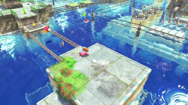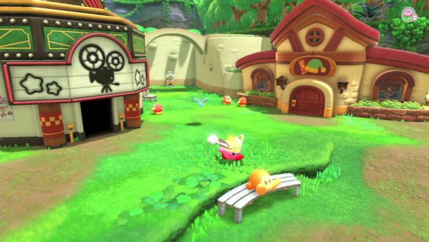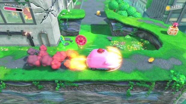 Si la série existe depuis 1992, la boule rose bien connue de Nintendo n’a jamais réellement tenté l’expérience de la 3D. C’est désormais chose faite avec “Kirby et le monde oublié”, une première aventure dans ce style qui se montre plutôt efficace. Depuis sa création en 1992, Kirby propose une formule de jeux d’action et de plate-forme en 2D très réussie. Étrangement, la série ne s’est jamais aventurée sur le terrain de la 3D, à l’exception de quelques spin-offs qui n’ont pas marqué les esprits. La formule traditionnelle de Kirby n’a jamais été convertie dans un jeu vidéo en 3D, jusqu’à aujourd’hui. Quatre ans après le dernier gros jeu et alors que la licence s’apprête à fêter son trentième anniversaire, celle-ci propose un épisode avec de gros changements: Kirby et le monde oublié. Il s’agit d’un titre développé comme toujours par HAL Laboratory. On retrouve l’univers très mignon de la série et ses mécaniques de jeu récurrentes dans un tout nouvel enrobage qui fonctionne très bien. Alors que Kirby vit paisiblement sur la planète Pop, un vortex se forme dans le ciel. Tout ce qui se trouve à proximité est alors aspiré par ce trou de ver, dont Kirby et de nombreux habitants de la planète. Le héros se réveille alors dans un monde en ruine qu’il ne connaît pas. Il se rend très vite compte que les Waddle Dee sont enlevés par des créatures malveillantes originaires de ce monde. Accompagné de Elfilin, un nouveau compagnon, Kirby part alors en quête pour libérer les habitants de la planète Pop. Il ne faut pas vraiment s’attendre à un scénario fourni ici, les jeux Kirby sont généralement légers sur cet aspect et cet épisode ne déroge pas à la règle. Les niveaux s’apparentent beaucoup à ceux de Super Mario 3D World. Kirby et le monde oublié se divise en niveaux très linéaires qui se déroulent dans différents environnements parfois originaux pour la série. Un peu à la manière d’un Super Mario 3D World, la caméra est gérée automatiquement par le jeu, ce qui nous permet de nous concentrer sur l’action et les déplacements. Dans ces niveaux se cachent tout un tas de pièces à collecter mais également des collectables, des secrets et objectifs annexes à remplir. Ceux-ci demandent parfois d’utiliser les différents pouvoirs de Kirby. En effet, celui-ci est toujours capable d’avaler les ennemis et d’acquérir leurs pouvoirs respectifs. Kirby obtient alors la capacité d’utiliser une épée, de cracher du feu, de creuser… L’une des grandes nouveautés du titre est le “Transmorphisme”, une nouvelle capacité qui permet à Kirby d’avaler des objets pour utiliser leur spécificité. Il peut alors prendre le contrôle d’une voiture, d’un cône de chantier ou encore d’une ampoule. Ces pouvoirs de Transmorphisme sont particulièrement situationnels et limités aux différents niveaux qui les utilisent, ce qui n’est pas le cas des pouvoirs que Kirby obtient des ennemis, utilisables un peu partout. Dans tous les cas, Kirby est très agréable à contrôler et offre tout un panel d’actions différentes à effectuer dépendant du pouvoir que l’on équipe. Ces actions sont d’ailleurs mises en avant dans des petits niveaux bonus et sont très utiles face aux boss qui se montrent assez agressifs. Remplir les objectifs cachés dans les niveaux permet de libérer de plus en plus de Waddle Dee. Le village Waddle Dee propose tout un tas d’activités. En dehors des niveaux, il est possible de se rendre au village Waddle Dee, une petite ville peuplée des personnages que l’on sauve dans les niveaux. Plus il y en a, plus de nouveaux bâtiments sont construits, donnant accès à différentes activités. Il est possible très rapidement de pouvoir acheter des objets de soin, de participer à des mini-jeux ou à des combats en chaîne dans un colisée, mais aussi d’améliorer les différents pouvoirs de Kirby chez un forgeron en échange de parchemins, ce qui donne de nouvelles formes et spécificités aux pouvoirs habituels de la franchise. Ce village est une idée qui donne vraiment envie de fouiller les différents niveaux à la recherche de tous les Waddle Dee cachés. Visuellement, le titre s’en sort vraiment bien, en proposant un jeu très coloré et aux environnements plutôt détaillés. Kirby et le monde oublié n’échappe pas à quelques soucis visuels tels que de l’aliasing et quelques textures vieillottes, mais le rendu est très convaincant. C’est musicalement tout aussi réussi, avec quelques thèmes récurrents très sympathiques. Kirby peut se transformer en tout un tas d’objets. Le jeu commence en nous demandant de choisir entre deux modes de difficulté (un “mode ouragan” plus difficile mais qui rapporte plus d’argent et un “mode brise” accessible à tous), dans les deux cas le titre ne se montre pas particulièrement difficile, permettant aux plus petits de pouvoir prendre la manette. Le jeu est également jouable entièrement en coopération, le deuxième joueur incarne alors Bandana Waddle Dee, un personnage récurrent de la série. Ce nouveau titre propose une formule proche des jeux récurrents de la série mais avec de nouvelles idées fraîches et intéressantes. La formule reste simple et les niveaux fun à parcourir, ils se permettent d’ailleurs quelques phases de jeu très différentes grâce aux pouvoirs Transmorphisme. Le jeu propose donc un peu de diversité bienvenue. Si l’aventure ne dure pas plus d’une dizaine d’heure, le titre réserve tout de même un peu de contenu après la fin, et finir le jeu à 100% demande quelques heures supplémentaires. La durée de vie est donc correcte même si nous n’aurions pas craché sur quelques niveaux en plus. Kirby et le monde oublié est un titre fun à la fois pour les petits comme pour les grands et qui réussit sans peine à transformer sa formule jusque-là bloquée en 2D.
