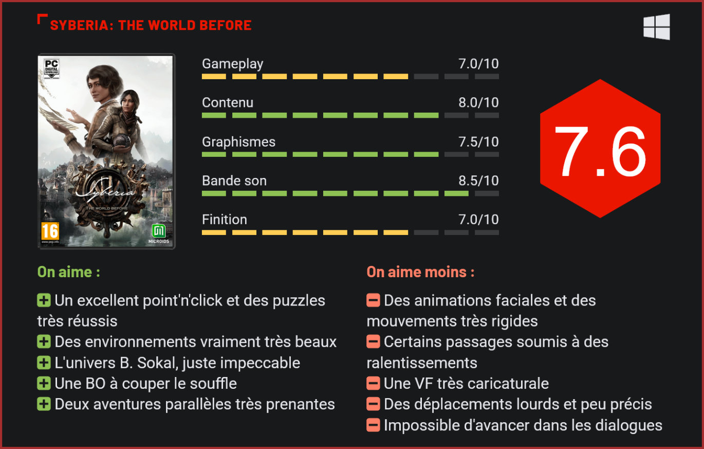 5 ans après un troisième épisode décevant en bien des points, la franchise de point’n’click Syberia fait son grand retour. Un épisode très réussi en bien des points. Il fut un temps où les moins de 20 ans jouaient sur leur ordinateur à des aventures en point’n’click, où les seules mécaniques de jeu consistaient à déplacer le curseur de la souris et à cliquer sur des éléments du décor. Dans les années 1980 et 1990, le genre était ultra populaire, avec notamment des licences aujourd’hui cultes, comme Dragon’s Lair ou encore Indiana Jones. Au début des années 2000, le genre s’est quelque peu essoufflé, avec quelques productions moins populaires, comme la série des Runaway. Si aujourd’hui, les titres en point’n’click sont tombés dans l’oubli et ne font plus partie des best-sellers, certains éditeurs continuent de faire vivre le genre. C’est notamment le cas de l’éditeur français Microids, qui tente, tant bien que mal, de continuer à vendre la série Syberia, entamée il y a très exactement 20 ans sur PC, grâce au dessinateur et scénariste belge Benoît Sokal. Depuis, deux autres épisodes sont sortis, à la qualité décroissante et aux ventes de plus en plus décevantes. Qu’à cela ne tienne, Microids est bien décidé à faire renaître de ses cendres sa franchise avec World Before, le quatrième épisode. On y retrouve le style si caractéristique de l’univers de Benoît Sokal, malheureusement décédé en plein développement du jeu, en 2021. Kate Walker fait son grand retour et son aventure débute dans une prison d’un pays de l’ouest semblable à la Russie. Suite à la découverte d’un train recelant de nombreux trésors, Kate tombe nez à nez avec une peinture datant des années 1930, en pleine montée du fascisme, et représentant une jeune Dana, qui s’avère être son portrait craché. Kate va alors s’enfuir de sa prison et partir sur les traces de celle qui, 70 ans plus tôt, semble être son ancêtre. Syberia nous embarque dans deux aventures liées et passionnantes. Une première aventure que nous découvrons donc, et qui se vit parallèlement à celle de Dana Roze, la jeune fille du tableau, qui vit en pleine Europe centrale alors que le fascisme et les nazis gagnent du terrain dans la sphère politique. Elle et sa famille sont harcelés par les fascistes dans la ville fictive de Vaghen. Si Dana s’inquiète de cette montée en puissance de la haine et du racisme, elle ne rêve que d’une chose : vivre de sa passion, à savoir le piano. Elle suit des cours et ambitionne de partir vivre à Paris, mais le climat incertain de sa région la poussent à remettre en question nombre de ses choix. Les deux histoires se rejoignent constamment au sein de l’aventure et permettent l’une et l’autre d’en apprendre plus sur la trame scénaristique et les filons de l’histoire. Très bien conté, le scénario nous transporte aisément dans cette Europe centrale du début du 20e siècle, puis dans d’autres régions tout autant réussies. Nous alternerons régulièrement entre les deux scénarios, et il nous est également arrivé d’avoir à switcher manuellement pour résoudre telle ou telle enquête, Dana et Kate étant passés par plusieurs mêmes endroits à quelques 70 années d’écart. Les très nombreux puzzles sont inspirés et plaisants à résoudre, quoique bien souvent faciles au final. L’essence-même de la franchise Syberia passe par le point’n’click et ses puzzles. L’aventure nous amène ainsi à devoir résoudre une multitude casse-tête et d’énigmes, qu’il s’agisse d’éléments à retrouver grâce à des indices, de casse-tête à la Room sur smartphones ou encore de choix de dialogues, toute l’intrigue de Syberia repose sur ces puzzles. Et force est de constater qu’ils sont très nombreux, mais également très amusants à résoudre. Bien que peu compliqués, ils vous prendront quelques minutes à vous taper la tête avant de finalement trouver la solution, souvent très logique. D’autres puzzles sont tellement faciles qui se résolvent en seulement quelques secondes, et nous aurions aimé davantage de défis sur ce point. Et si vous perdez patience dès qu’un puzzle vous demande un peu de jugeote, sachez que le titre vous permet à tout moment de bénéficier d’un indice dans sa résolution. Pour déplacer nos deux héroïnes, Syberia nous propose deux façons de faire : à la souris ou à la manette. Concrètement, un effort a été consenti de la part des équipes de développement par rapport aux précédents épisodes jugés très patauds. Malgré tout, ce World Before reste une plaie à prendre en main. Les personnages sont très lents et lourds à déplacer, la précision n’est absolument pas au rendez-vous lorsqu’il faut sélectionner un objet (le jeu ne percevant pas toujours la différence entre interaction et déplacement) et la gestion des différentes touches n’est vraiment pas idéale. Il est par exemple impossible de quitter en menu en appuyant sur Escape, cela nous renvoyant inévitablement vers le menu Pause. Enfin, certains dialogues trainant en longueur, on aurait pouvoir les passer ou les accélérer. Les déplacements ne sont vraiment pas optimaux et précis, que ce soit à la manette ou à la souris. Visuellement parlant, Syberia: The World Before s’en sort haut la main avec les honneurs. La gestion de l’éclairage est tout simplement impeccable et les différents panoramas, que ce soit dans de petites ruelles ou des paysages plus montagnards et naturels, sont très réussis. Poussez les réglages de votre ordinateur au maximum et vous pourrez alors bénéficier d’un titre vraiment superbe en 4K. En revanche, poussés au maximum, les paramètres mettent très vite la machine à bout, à tel point que nous avons fréquemment été victime de ralentissements. Rien de vraiment grave en soi, il suffit simplement de baisser d’un iota le