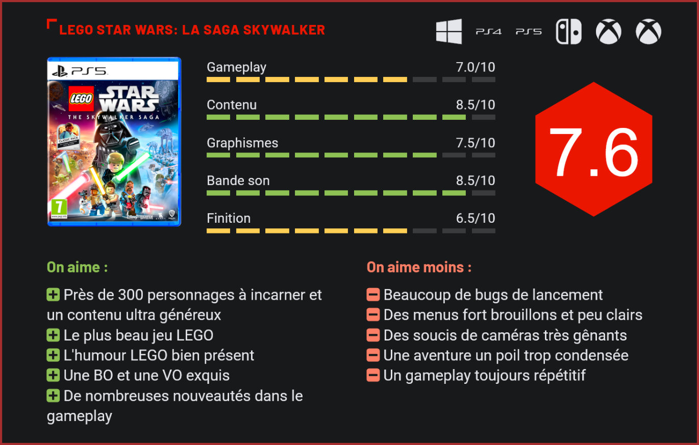 17 ans après la sortie de la prélogie en version LEGO, TT Games et Warner Bros. publient la compilation ultime pour les fans de la franchise. Remasterisation et contenu supplémentaire sont au programme. En 17 ans d’histoire, la marque LEGO dans l’industrie vidéoludique a accouché d’une dizaine d’adaptations. Indiana Jones, Jurassic World, Harry Potter ou encore Le Seigneur des Anneaux, la plupart des franchises à succès du cinéma ont été adaptées en version mini-briques. Mais celle qui a réellement initié la tendance, c’est la saga de George Lucas, Star Wars. Avec l’adaptation des épisodes I à III, TT Games et Warner Bros montrent qu’ils s’intéressent de près au film de science-fiction le plus populaire de l’histoire. Au final, ce sont les neuf épisodes principaux de la franchise qui ont été adaptés par LEGO. 17 ans plus tard, TT Games conclut cet arc entamé en 2005 avec LEGO Star Wars: La Saga Skywalker, le jeu ultime pour quiconque est amateur de la saga. Au total, ce sont neuf épisodes regroupés dans cette compilation, incluant deux inédits (épisodes VIII et IX) et sept remasterisations (épisodes I à VII). Une collection qui sent bon la nostalgie, puisque certains épisodes ont 17 ans et qu’elle nous permet de nous replonger dans une saga si emblématique. Comme précisé plus haut, La Saga Skywalker se compose des neufs épisodes principaux de la saga. Les deux spin-offs, à savoir Rogue One et Solo, sont présents par l’intermédiaire de leurs héros, qu’il est possible d’incarner lors du Mode libre. Ce petit détail précisé, lançons-nous dans l’aventure. La première fois que vous lancerez le jeu, vous pourrez choisir l’épisode que vous voudrez lancer. Libre à vous de commencer par la trilogie originale, ou de débuter votre aventure depuis le tout premier épisode, La Menace Fantôme. Le titre nous laisse donc une liberté d’approche totale, et c’est tant mieux ! Les lieux les plus mythiques de la franchise sont au rendez-vous. Côté scénario, il ne faut pas s’attendre à des surprises avec les mêmes scènes que dans les films. La plupart des passages cultes de la saga sont fidèlement reproduits à la sauce LEGO, c’est-à-dire en ayant vulgarisé au maximum le scénario et en y ajoutant de nombreuses touches d’humour. S’il y avait un reproche que nous pourrions émettre à TT Games quant à son traitement de la saga, ce serait probablement au niveau du rythme donné. Les scènes se déroulent à un rythme effréné, à tel point que certains passages semblent très vite expédiés et que l’on passe très vite d’une scène à une autre. C’est bien simple : chaque film se conclut en près de deux heures, c’est très peu. Comptez une vingtaine d’heures de jeu au total, grâce notamment à une pléthore de quêtes annexes dont nous reparlerons plus tard. Manette en main, le jeu semble bien plus réussi et agréable qu’auparavant. On sent qu’un réel travail a été effectué sur ce point de la part des développeurs avec de nombreuses nouveautés à la clé. La base même du titre a été conservée, à savoir la résolution de nombreux puzzles en tirant profit des compétences des Jedi, vauriens ou encore droïdes. Il conviendra alors de changer de personnage au bon moment pour résoudre une énigme ou progresser dans le niveau. On se souviendra par exemple de la rencontre entre Rey, Finn, Han Solo et Chewbacca lors de laquelle les personnages sont répartis en deux groupes, l’un permettant à l’autre d’avancer grâce à un puzzle, et ainsi de suite. On retrouve également la rejouabilité propre à la saga, avec des niveaux regorgeant de trésors et secrets, mais que l’on ne peut débloquer qu’en mode libre, une fois l’aventure finie et les personnages adéquats débloqués. Cette compilation remasterisée reste très fidèle à la saga originale, mais l’on regrettera que les nombreux soucis de caméra soient restés. La vue est régulièrement obstruée par des objets du décor, et il n’est pas rare que l’on perde de vue notre personnage car il se retrouve dans un endroit fort exigu. Certains passages, références à des scènes cultes, donneront lieu à de petites énigmes et puzzles. Mais La Saga Skywalker, ce sont également de nombreuses nouveautés ou phases modernisées à se mettre sous la dent en termes de gameplay. Notons ainsi la Bataille de Naboo, lors de laquelle nous contrôlons les troupes Gungans face aux droïdes de combat, ou encore les nombreuses batailles spatiales, très plaisantes et nerveuses. La bataille de modules sur Tatooïne d’Anakin Skywalker est désormais bien plus fluide et nerveuse qu’elle ne pouvait l’être il y a 17 ans. Deux autres petites nouveautés notables font notamment leur arrivée dans la saga. La première concerne le système de combos, inédit, qui requiert de la part du joueur de varier les touches d’attaque, au risque que l’adversaire ne bloque vos coups. Plus votre score de combo sera élevé, plus vous acquerrez des briques. La seconde nouveauté est un système d’amélioration de nos compétences et personnages. Moyennant quelques briquettes, vous pouvez par exemple allonger la barre de vie de votre personnage, mais également sa capacité à accumuler rapidement et le plus loin possible des crédits. Une nouveautés plus anecdotique qu’autre chose tant le jeu est simple à boucler sans avoir acheté la moindre amélioration. C’est bien simple : si l’on n’avait pas les alertes du titre pour nous inciter à en acheter, on passerait toute l’aventure à un niveau de base. Côté contenu, le titre se révèle être l’un des jeux LEGO les plus complets à ce jour, avec notamment 300 personnages à débloquer puis incarner. Han Solo, Qui-Gon Jinn, Mace Windu, mais également d’autres personnages moins connus comme Ric Olie, Nien Numb ou l’Amiral Holdo (Episode VIII) il y en a vraiment pour tous les g