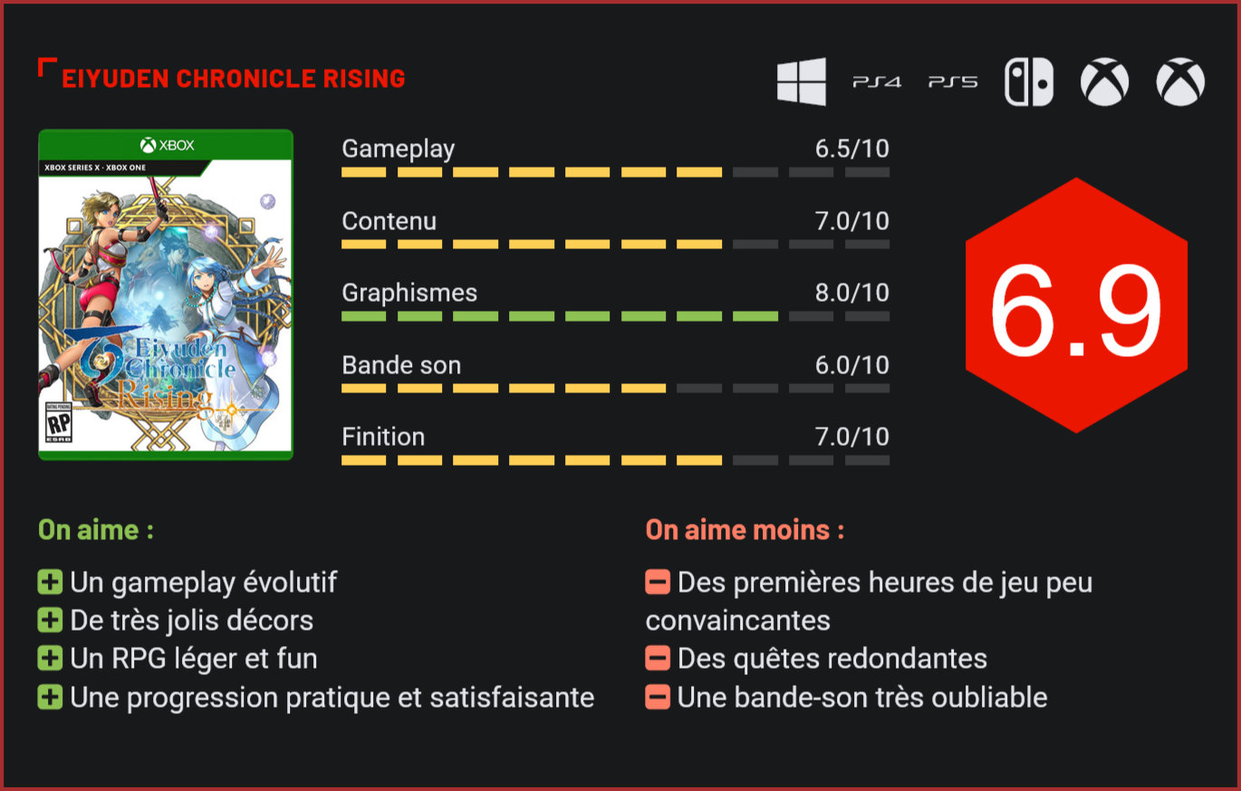 Si Eiyuden Chronicle: Hundred Heroes n’est pas encore prêt et arrivera plutôt l’année prochaine, son jeu compagnon, Rising, est disponible depuis peu. Il s’agit d’un petit projet qui introduit l’univers de la série. Retour en juillet 2020, alors qu’une nouvelle équipe de développement lance sa campagne de financement participatif pour réaliser son premier jeu. Certains des membres de Rabbit and Bear Studios sont des développeurs japonais anciennement membres de Konami. Les têtes pensantes de ce projet sont des éléments importants ayant participé à la création de la licence de JRPG Suikoden. Leur campagne Kickstarter promet un jeu de rôle très inspiré de cette série en particulier, un véritable successeur spirituel. Il faudra à peine trois heures pour récolter la somme alors demandée de 500.000 dollars, et l’engouement des fans de RPG va pousser la cagnotte jusqu’à plus de 4 millions cumulés. Si le projet est prévu pour 2023, l’engouement autour de la campagne a permis le lancement du sujet d’aujourd’hui, un plus petit projet dans le même univers, un action-RPG du nom de Eiyuden Chronicle Rising disponible sur PC et sur toutes les consoles, également sur le Game Pass. L’aventure nous emmène voir différentes ambiances. Dans Eiyuden Chronicle Rising, on incarne plusieurs personnages qui reviendront dans Hundred Heroes. CJ, l’héroïne, est une chasseuse de trésor énergique qui arrive à Nouveau Nevaeh, une ville très fréquentée par les aventuriers puisqu’elle se situe juste à côté d’un tumulus et de nombreuses ruines mystérieuses. Elle sera bien vite accompagnée de Garoo, un homme-bête maniant une imposante épée, ainsi que de Isha, la maire suppléante de Nouveau Nevaeh qui a le don d’utiliser la magie. Ensemble, les trois protagonistes vont œuvrer pour trouver des trésors mais aussi pour rebâtir la ville qui a subi de nombreux dégâts suite à un tremblement de terre. Eiyuden Chronicle Rising est un RPG en temps réel qui se joue sur un plan 2D. Nous passons en réalité beaucoup de temps à nous balader dans les quartiers de la ville et à répondre aux nombreuses requêtes des habitants. Celles-ci nous permettent de reconstruire de nombreux bâtiments et d’avoir ensuite accès à des magasins et autres fonctions très pratiques pour nous aider dans l’exploration des environnements hostiles qui entourent la ville. Ni le scénario ni les quêtes annexes ne sont particulièrement passionnants, en particulier à cause des tâches demandées qui sont très redondantes, demandant bien souvent d’aller chercher des matériaux dans les donjons. Mais le titre a le bon goût de rendre la progression très pratique et à nous récompenser gracieusement pour nos efforts. On passe beaucoup de temps à Nouveau Nevaeh. Lorsque nous ne sommes pas dans la ville, le gameplay prend une tournure “Action” en nous laissant explorer des donjons où se cachent coffres aux trésors et monstres en tout genre. Chacun des personnages jouables peut sauter et attaquer ainsi qu’utiliser une capacité propre au personnage actif. Ces actions peuvent être améliorées pour proposer d’autres subtilités, tel qu’un système d’éléments plus ou moins efficaces face à certains types d’ennemis. Il existe deux modes pour gérer nos personnages, un mode “simple” qui laisse le jeu aux commandes et un mode “normal” qui assigne un bouton pour chacun d’entre eux. Il est alors possible de changer de personnage en appuyant simplement sur le bouton assigné. Des attaques encore plus dévastatrices peuvent être enchaînées en changeant de personnages juste après avoir attaqué. Le gameplay est plutôt efficace et offre quelques améliorations intéressantes au fil du jeu tel que de nouvelles attaques et autres facultés. Le titre prend un peu de temps avant de montrer les qualités de son système de jeu. Le début de l’aventure nous prive de nombreuses mécaniques qui sont pourtant importantes pour apprécier l’expérience. L’aventure commence en contrôlant un seul personnage, ce qui impose un gameplay lent et peu intéressant. Les premières heures souffrent également d’une maniabilité très lourde. Des choses qui rendent le premier contact peu agréable mais qui s’améliorent avec le temps. À l’exception de quelques combats de boss, le jeu ne demande que rarement d’être très précis et la difficulté a plutôt tendance à être accessible. De plus, l’alternance entre de courtes explorations dans les donjons et nos visites au village est une boucle de gameplay qui a déjà fait ses preuves dans d’autres jeux et qui fonctionne toujours très bien. Même les boss n’offrent pas un challenge particulièrement relevé, la difficulté ne vient qu’en débloquant un mode plus corsé une fois l’aventure terminée. Si Eiyuden Chronicle: Hundred Heroes vendait déjà très bien sa plastique durant le kickstarter, Rising nous prouve que le studio sait y faire à ce niveau. Le titre est particulièrement beau, mélangeant pixel art en 2D détaillé, un peu de 3D, une belle gestion des lumières et des décors qui offrent une vraie sensation de profondeur. Un résultat très coloré et vivant. Le bilan est un peu moins flatteur pour la bande-son du jeu qui n’est pas particulièrement très mémorable, mais qui accompagne efficacement l’action. D’une grande simplicité, Eiyuden Chronicle Rising se laisse jouer sans problème. Il n’est jamais particulièrement brillant mais ses mécaniques qui ont déjà fait leurs preuves dans d’autres titres ainsi que sa praticité en font un petit RPG léger et sympathique à parcourir. Petit aussi par sa durée de vie puisqu’il faut une dizaine d’heures pour en voir le bout et un peu plus pour le terminer à 100%. Une densité de contenu plutôt correcte pour ce titre proposé pour une quinzaine d’euros sur les différentes plateformes. Eiyuden Chronicle R