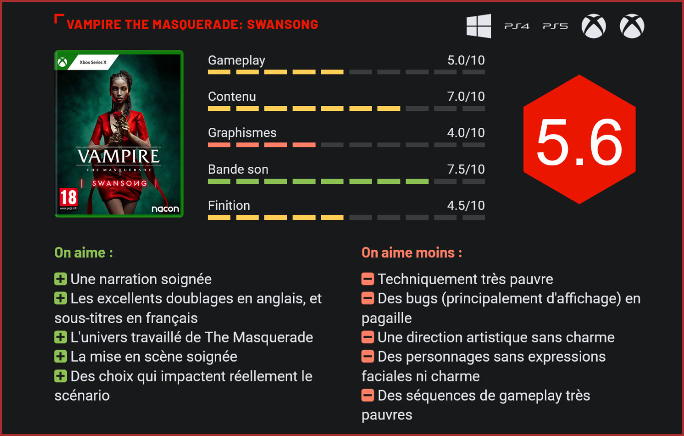 Si les fans de la franchise attendent avec une certaine impatience Bloodlines 2, le moins que l’on puisse dire, c’est qu’ils ont eu de quoi s’occuper ces derniers mois avec BloodHunt et Swansong, deux jeux prenant place dans l’univers de Vampire The Masquerade, qui osent des approches différentes. Inspiré du célèbre jeu de rôle Vampire The Masquerade, Swansong se présente comme un jeu de rôle narratif dans lequel chaque choix du joueur impacte le scénario. L’éditeur français Nacon a confié le projet au petit studio Big Bad Wolf, qui nous avait très agréablement surpris avec le très sympathique The Council. Avec un tel pédigrée, on s’attendait à un titre très verbeux, brossant dans le sens du poil les fans de la franchise. Vous êtes prévenu : le jeu est très verbeux. Le scénario est toutefois très agréable à suivre. Et c’est précisément ce que le petit studio français nous délivre. Avant d’aller plus loin dans ce test, il convient toutefois de le préciser : Swansong est clairement un jeu qui se destine à un public de niche. Essentiellement, les fans de l’univers de Vampire The Masquerade. Pourquoi? Tout d’abord, parce que niveau scénario, on a droit à du lourd. Les dialogues sont nombreux, les intervenants aussi et un joueur lambda aura parfois du mal à se retrouver dans cet univers complexe. Les mécanismes de jeu ne sont également pas forcément évidents à mémoriser pour un débutant… Ensuite, parce qu’au niveau du gameplay, on est ici face à un titre très spécifique : quelque part à mi-chemin entre un jeu narratif constitué de cut-scenes et de dialogues et un jeu d’enquête à la Sherlock Holmes. Pour ceux qui ne connaitraient pas du tout la franchise, Swansong réalise toutefois un excellent travail de présentation, avec une très longue intro qui présente les enjeux. L’action prend place en plein coeur de Boston. Vous incarnez Emem, une vampire qui est la propriétaire des clubs les plus select de la ville. Elle a rejoint le clan de la Caramilla, qui est mené par Hazel, le “Prince”, chargée de faire respecter la loi élémentaire de tous les vampires : la Masquarade. Concrètement, si les affrontements entre les différentes factions sont autorisés, les vampires doivent à tout prix rester invisibles aux yeux de la société. Ce sont pourtant eux qui la gouvernent… Il faudra régulièrement se sustenter pour faire retomber sa soif de sang. D’un point de vue narratif, Swansong est une franche réussite. Le jeu prend littéralement la forme d’un film interactif dans lequel on intervient finalement très peu. Il consiste en une succession de cut-scenes entrecoupées par quelques dialogues dans lesquels on peut influer sur le déroulement du scénario et quelques courtes séquences de gameplay – la plupart du temps, de l’investigation. Si vous y avez déjà joué, on se rapproche ici d’un Detroit. On le sent, les développeurs sont passionnés par l’univers de The Masquerade. Les dialogues sont extrêmement bien écrits, le déroulement est imprévisible et le récit passionnant de bout en bout. La présentation du jeu est également soignée avec des angles de caméra très bien choisis pour les cut-scenes, d’excellents doublages en anglais (sous-titrés en français) et une bande son efficace. Attention toutefois, le tout n’est pas forcément très accessible aux néophytes, qui devront souvent explorer le glossaire pour progresser. Le character design n’est pas vraiment le fort du jeu… Le seul reproche que l’on adresse au titre, concernant son scénario concerne la galerie de personnages qui nous sont ici présentés, totalement inexpressifs – compte tenu des animations faciales d’un autre âge -, globalement trop nombreux pour qu’on se les remémore tous et surtout pas franchement réussis artistiquement. C’est bien simple, à l’exception d’Emem, difficile de s’attacher aux personnages de ce récit. Leurs looks extravagants sied certes à l’univers du jeu de rôle, mais difficile de leur trouver un charme. Si d’un point de vue narratif, le jeu de Big Bad Wolf réalise presqu’un sans faute, le résultat est beaucoup moins convaincant en ce qui concerne son gameplay et sa réalisation. Clairement, ce n’est pas l’ambition qui manquait au studio. Swansong offre un récit long, complexe, avec de nombreux embranchements narratifs et il intègre également quelques excellentes idées. Techniquement toutefois, le titre est extrêmement pauvre, même sur les consoles de nouvelle génération. Les décors sont vides, les animations faciales comparables à celles d’une production d’il y a dix ans, les bugs (principalement, des textures qui s’affichent en retard) se comptent par dizaines et on le sent, le tout a manqué cruellement de budget. Etonnamment, cela se ressent plus dans les cut-scenes, réalisées avec le moteur du jeu, que dans les quelques séquences d’exploration, où le jeu paraît presque “joli”. Quelques séquences de gameplay viennent entrecouper les cut-scenes. Côté gameplay, le jeu a également du mal à trouver sa propre identité. Il emprunte des éléments à différents genres. Comme nous l’avons dit, le titre est très verbeux. Les cut-scenes sont nombreuses et contrairement à un jeu de Telltale, vous n’aurez pas grand chose à faire pendant celles-ci puisqu’elles ne sont pas interactives. Entre deux cut-scenes, il faudra dialoguer avec des PNJ. Durant ces conversations, vous pourrez utiliser les compétences de votre personnage (définies en début de partie). Concrètement, votre personnage a certains talents d’orateur. Il est capable de faire preuve de rhétorique, de persuasion, de séduction… Chaque élément est défini en début de partie par le joueur, mais peut être amélioré avec l’expérience gagnée. Sur base de vos statistiques, vous pourrez faire pencher la balance en votre faveur à travers les joute