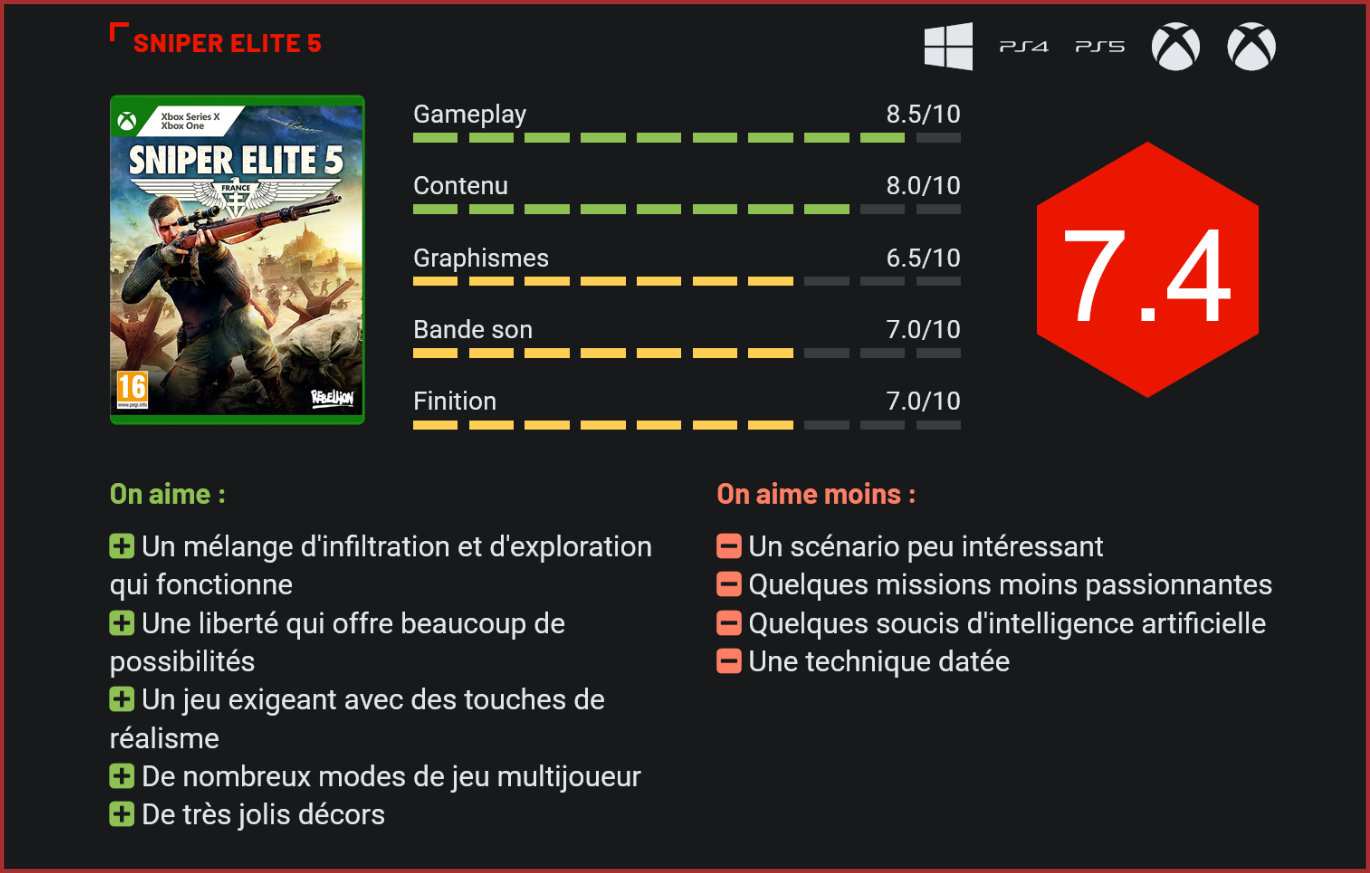 La série de jeux d’infiltration est de retour avec un cinquième épisode majeur. De nouveau dans la peau de Karl Fairburne, il faut cette fois déjouer un plan top secret que préparent les nazis en plein cœur de la France de 1944. Après un quatrième épisode en 2017 majoritairement bien reçu et une conversion en réalité virtuelle moins convaincante, la série Sniper Elite revient avec son cinquième épisode majeur. La licence reste dans les mains de l’équipe qui l’a vu naître puisque l’on doit ce nouvel opus aux développeurs anglais de chez Rebellion. Sans pour autant révolutionner la série, ce cinquième épisode solidifie encore plus la formule installée depuis quelques jeux. Sniper Elite 5 est disponible sur PC, à la fois sur les consoles de nouvelles générations et de la génération précédente de Playstation et Xbox, et également dans le Game Pass. Les paysages français sont à l’honneur dans ce cinquième épisode. Ce nouveau Sniper Elite propose une campagne solo d’une dizaine d’heures ainsi que plusieurs modes multijoueur. Le mode solo nous plonge à nouveau dans la Seconde Guerre mondiale. Nous incarnons de nouveau le tireur d’élite Karl Fairburne qui, lors d’une mission sur la côte bretonne, est amené à aider la résistance française. Ensemble, ils vont très vite découvrir que les nazis préparent une opération secrète pour prendre le dessus sur les forces alliées: l’opération Kraken. Notre protagoniste va alors se rendre à différents endroits occupés par l’armée allemande pour trouver des informations sur ce projet et pour empêcher sa mise en place. Si les prémices du scénario sont efficaces, l’intrigue manque malheureusement d’intérêt sur le long terme. Les personnages secondaires sont très oubliables et le scénario se met bien vite en retrait pour laisser la place au gameplay. Si l’intrigue de Sniper Elite 5 n’est pas son point fort, son gameplay est beaucoup plus convaincant. Le titre se présente comme un jeu de tir à la troisième personne, chaque mission nous lâche dans une carte ouverte qui dispose de différents objectifs principaux et secondaires. Atteindre un endroit précis et récupérer des informations, descendre une cible précise ou saboter le matériel des nazis… Toutes ces tâches s’effectuent de manière libre, nous laissant approcher les objectifs à notre façon. Il est alors plutôt important d’explorer correctement les cartes, ce qui permet par ailleurs de trouver différents objets de diversion, de soin ou encore différents types d’armes et munitions. Certaines missions sont moins passionnantes que d’autres et les objectifs gagneraient à se diversifier un peu plus. Cependant, les cartes offrent généralement de nombreuses possibilités d’approches, avec plus de verticalité accessible grâce aux capacités d’escalade de notre personnage. Il faut parfois se servir de nos autres armes pour se sortir de situations délicates. Le titre propose un certain réalisme puisqu’il faut prendre en compte différents paramètres pour jouer efficacement tels que la distance de tir au sniper, ainsi que la gestion de notre rythme cardiaque et de la respiration. Les armes sont également personnalisables avec différents composants qui changent subtilement leur utilisation. Celles-ci vont parfois déclencher la fameuse X-ray Kill Cam caractéristique de la série, il s’agit d’une cinématique qui montre précisément la balle traverser le corps des soldats ennemis avec de nombreux détails sanglants. Le titre propose également un côté RPG avec de l’expérience et des points de compétences à dépenser dans de nouvelles habiletés utiles en combat, pour s’infiltrer ou pour améliorer notre équipement. La formule reste assez similaire à celle du quatrième opus et montre de nouveau beaucoup de qualités. La liberté accordée est très appréciable et est en prime accompagnée de très bonnes sensations de jeu, notamment concernant les gunfight plutôt efficaces. Il est tout à fait possible de foncer dans le tas et de canarder tout ce qui bouge, mais l’approche furtive est bien plus conseillée tant les renforts ennemis sont nombreux. Le titre montre vite sa difficulté, il exige une véritable discrétion face aux ennemis et leur intelligence artificielle parfois très performante. Les soldats allemands n’échappent pas à quelques soucis à ce niveau de temps à autre, ne remarquant même pas notre présence à quelques mètres devant eux. La difficulté élevée est cependant modulable grâce à cinq niveaux plus ou moins difficiles et à de nombreuses options permettant de personnaliser un peu plus précisément l’expérience en diminuant par exemple le réalisme des mécaniques de tirs. La X-ray Kill Cam est plus gore que jamais. Sniper Elite 5 offre également un certain nombre d’options pour jouer en ligne avec d’autres tireurs d’élites. Votre mission solo peut, par exemple, être “envahie” par un autre joueur qui aura alors pour but de vous traquer, ajoutant ainsi une difficulté supplémentaire en échange de récompenses en cas de victoire. Inversement, il est possible d’envahir les missions d’autres personnes et de devenir le chasseur en incarnant un soldat de l’Axe qui possède ses propres avantages. Les missions peuvent également être jouées en coopération, et le titre possède aussi un mode multijoueur jouable jusqu’à 16 et un mode survie qui nous demande de résister à des vagues d’ennemis. Une très bonne quantité de modes qui rallongent considérablement la durée de vie. Ces modes de jeux sont efficaces et permettent de débloquer tout un tas de récompenses comme de l’expérience et des personnages jouables. Le titre s’en sort techniquement sans pour autant être impressionnant. Si les décors inspirés de véritables lieux en France sont une très belle réussite, c’est un peu moins le cas des personnage