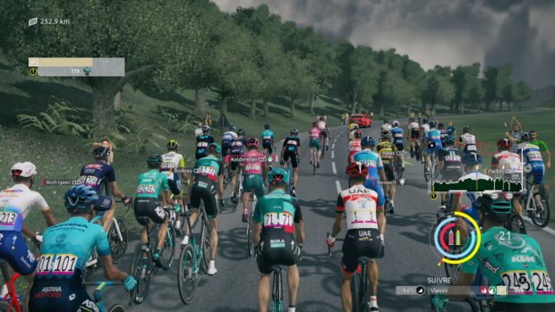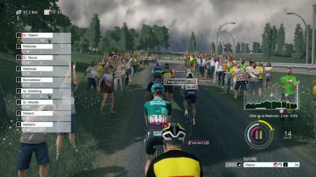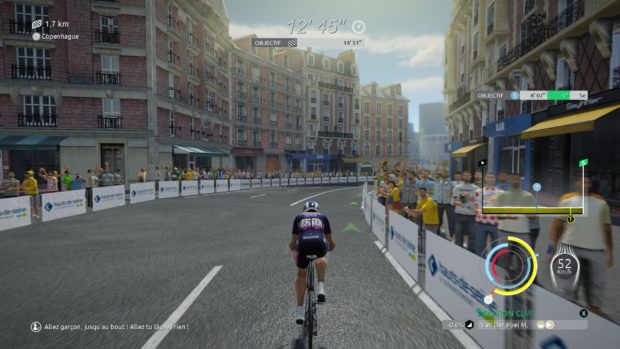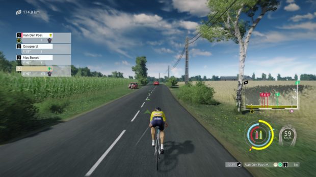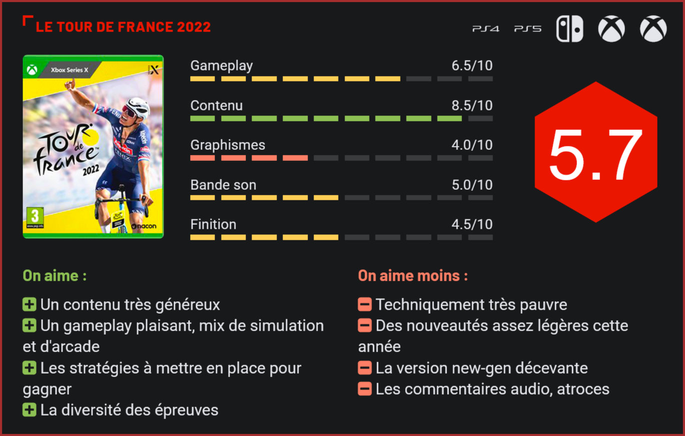 Fidèle au rendez-vous, Nacon nous propose chaque année une nouvelle édition pour son jeu “Le Tour de France”, une déclinaison simplifiée pour les consoles de son jeu Cycling Manager. Si Cycling Manager s’est imposé au fil des années comme la référence absolue pour les amateurs de cyclisme, sur consoles, les joueurs ont droit à un titre bien différent. Le jeu Le Tour de France se présente comme un mix de simulation et d’arcade, dans lequel le joueur prend le contrôle d’un cycliste en particulier à travers toutes les étapes du Tour de France. On est donc très loin de l’expérience de simulateur de gestion d’équipe proposé sur PC. Cette année, le Tour de France débute au Danemark. On retrouve bien entendu certaines reliques de Pro Cycling Manager, avec par exemple l’entraide entre les coéquipiers durant les courses, la possibilité de prendre les commandes d’un autre cycliste en plein course et la gestion de nombreux éléments caractéristiques des simulations : la fatigue du cycliste, l’effort dans la course, la mise en place d’une stratégie pour remporter la partie, la maladie, les blessures… Les amateurs de cyclisme en auront pour leur argent. Toutefois, comme on l’a dit plus haut, Le Tour de France reste un jeu accessible au grand public. Le mode de jeu principal propose de participer à toutes les étapes du Tour de France. Celles-ci alternent sprint, endurance, montagne… On débute au Danemark et on finit sur les Champs Elysée. L’échappée en solitaire est souvent très risquée. D’apparence, le jeu est simple d’accès. On contrôle directement le cycliste en accélérant et en freinant avec les gâchettes droite et gauche. Ca, c’est pour les bases. Dans la pratique, on passera toutefois la plupart de son temps dans le peloton. Il conviendra de se mettre dans la roue d’un des leaders du groupe. Une fois “accroché”, il n’y a plus rien à faire… si ce n’est guetter le bon moment pour tenter une échappée, lancer un sprint pour tenter de grappiller quelques points pour le maillot à pois, ou suivre un groupe d’échappés. Tout le concept du jeu repose sur la gestion de l’effort. Il est tout à fait possible de partir seul en échappée, mais celle-ci se soldera pratiquement toujours sur un échec sur un sol plat, car, en solitaire, vous n’aurez pas l’occasion de récupérer en vous mettant dans la roue d’un autre joueur, et devrez affronter seul le vent de plein fouet. La fatigue grimpe rapidement et on finit quasi systématiquement par se faire rattraper. Il convient donc d’être très stratégique dans ce que l’on fait. Attendre le bon moment pour attaquer, donner les bons ordres à ses coéquipiers, et surtout guetter les attaques des autres. Dans le peloton, on se met souvent dans la roue d’un autre joueur. L’ennui, c’est que si les bases du jeu sont solides, il y a beaucoup de moments creux. Dans le peloton notamment. Les épreuves de 200 kilomètres sont une véritable épreuve. Il faudra compter un bon 30 minutes de jeu, avec peut-être 20 minutes d’un ennui mortel. On le sent, si les idées sont là, les développeurs peinent encore à trouver le mix idéal entre arcade et simulation. Clairement, le jeu manque de moments éprouvants. Les moments les plus excitants sont les sprints, les attaques et les petits défis qui rythment la course. Entre ces passages, on s’ennuie souvent très ferme. Alors il est toujours possible d’accélérer ces moments, mais vous prenez le risque d’avoir une mauvaise surprise si quelque chose se passe… Par rapport aux anciennes versions, cette cuvée 2022 apporte quelques jolies petites nouveautés. Niveau contenu tout d’abord, à côté du Tour de France 2022, on retrouve une floppée d’autres épreuves auxquelles participer, comme le Liège-Bastogne-Liège ou – nouveauté – la Primavera Classic en Italie. Toutes les licences officielles sont là avec 26 équipes différentes et tous les grands noms de l’industrie. Au total, ce sont pas moins de 92 courses qui sont proposées. Largement de quoi faire donc. D’autant plus qu’un nouveau mode “course du moment”, fait son apparition, lequel propose de comparer ses résultats avec d’autres joueurs en ligne. Les séquences dans le peloton font partie des moins passionnantes. Cette cuvée 2022 introduit quelques petites nouveautés aussi, avec une IA retravaillée, des paramètres entièrement reparamétrables (le joueur pourra par exemple activer ou désactiver les chutes, et en déterminer la fréquence), ou des secteurs pavés retravaillés, avec une image qui tremble. On ne peut malgré tout s’empêcher de penser qu’en trois ans, la franchise n’a que trop peu évolué. Côté technique, on est face à un jeu qui aurait facilement pu tourner sur une PS3. Les décors sont d’une laideur sans nom. Les modélisations des cyclistes minimalistes. Les sensations de vitesse sont toutefois là et surtout, le public, en 3D, amène un peu de vie sur les parcours. Les versions PS5/Series du jeu nous ont toutefois paru très mal optimisées. On ne ressent pas du tout la différence avec la précédente génération, pour être franc. Et clairement, il est temps pour Nacon de passer à un nouveau moteur graphique. Même constat malheureusement pour l’audio avec des commentaires ultra-répétitifs et sans aucune pertinence, qu’on aura tôt fait de couper. C’est là le principal problème de la franchise : les moyens sont limités et le résultat déçoit forcément. C’est dommage car dans la pratique on sent réellement le potentiel de la série. Le plaisir de jeu est là et les amateurs de cyclisme devraient y trouver leur compte. Il faudra toutefois clairement fermer les yeux sur la technique, qui n’évolue que très peu d’année en année… Conclusion La série de Nacon fait du sur place depuis des années et cette version “cross-gen” du jeu peine clairement à convaincr