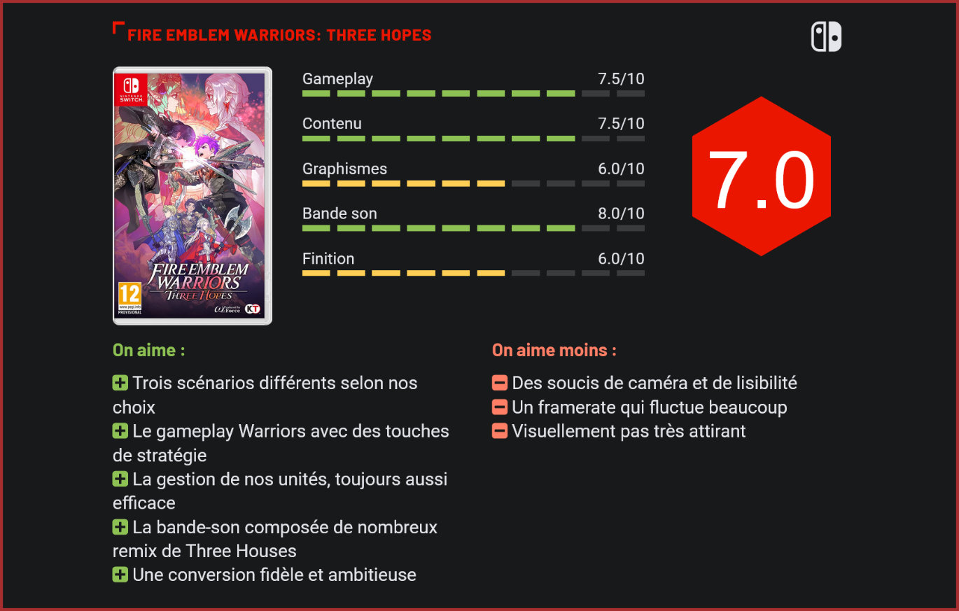 Nintendo et Koei Tecmo continuent leurs partenariats afin de transposer certaines licences du géant du jeu vidéo dans la formule Musô si chère aux développeurs de chez Omega Force. C’est cette fois Fire Emblem qui signe à nouveau pour un Warriors qui se révèle très intéressant et très proche de son modèle. Parmi le catalogue imposant de licences que possède Nintendo, deux d’entre-elles sont passées récemment dans les mains de Koei Tecmo: The Legend of Zelda et Fire Emblem. Elles ont toutes deux eu droit à leur version Musô, ou “Warriors”, ce style si particulier qui oppose nos personnages à des armées de centaines d’ennemis que l’on envoie valser à la simple pression d’un bouton. Avec Hyrule Warriors: L’Ère du Fléau, c’était Zelda Breath of the Wild qui avait droit à son épisode dédié, et ce nouveau Fire Emblem Warriors emprunte le même chemin en se focalisant sur le dernier épisode de la licence: Three Houses. On retrouve les personnages et l’univers de Three Houses. Avant toute chose, il est donc important de revenir sur Fire Emblem: Three Houses tant Three Hopes emprunte à son aîné. Paru alors en 2019 sur Switch, Three Houses est rapidement devenu l’épisode le plus vendu de la saga. On y découvre l’aventure de Byleth, mercenaire masculin ou féminin, qui va devenir enseignant(e) à l’académie des officiers du monastère de Garreg Mach. Byleth prend sous son aile l’une des trois classes de jeunes apprentis disponibles dans le jeu, menant alors à trois scénarios tout à fait différents qui vont mener à une guerre à grande échelle, chacun des trois chefs de classe de l’académie étant les héritiers des trois grandes nations du continent. Le gameplay est similaire à ce que faisait la série auparavant, avec des combats stratégiques au tour par tour, mais le titre propose également un gros côté “gestion” puisqu’il est possible de gérer l’apprentissage et l’évolution de nos élèves très librement. Fire Emblem Warriors: Three Hopes en reprend de nombreux éléments, à commencer par son univers ainsi que son scénario qui possède de multiples similitudes tout en proposant une aventure originale. Nous incarnons cette fois un mercenaire masculin ou féminin du nom de Shez qui va rejoindre l’académie des officiers du monastère de Garreg Mach, cette fois en tant qu’élève. Il faut alors faire un choix parmi les trois mêmes classes que dans le jeu original. Le prologue d’un peu plus d’une heure se termine avec une ellipse de deux ans où nous retrouvons les personnages de notre classe en pleine guerre dont les évènements vont varier dépendant du groupe que nous avons choisi. Le gameplay habituel des Warriors est agrémenté de mécaniques plus originales. Tout comme dans le jeu original, Three Hopes possède trois scénarios distincts qui mènent vers des batailles tout à fait différentes et qui va également décider des personnages que l’on peut incarner. Malgré son statut de “Warriors”, le titre est très scénarisé et ne propose aucun autre contenu que la campagne. Pas de mode libre ou de modes de jeux plus originaux comme le proposait par exemple le Fire Emblem Warriors de 2017, tout se déroule ici dans le scénario. Pas d’inquiétude puisqu’il faut environ 30 à 40 heures de jeu pour voir le bout d’une seule des trois routes du jeu, l’aventure est riche en missions annexes et en choses à faire. Three Hopes est un jeu d’action, mais qui possède aussi une très grosse dose de RPG dans sa formule. Le titre se montre particulièrement bavard. Les scénarios racontent efficacement les conflits militaires opposant les trois nations du continent et permettent, tout comme dans le jeu original, de gérer tout un tas d’éléments concernant notre armée. Lorsque nous ne sommes pas en pleine bataille, Shez passe son temps dans un camp où il est possible d’utiliser du temps et de l’énergie pour entraîner les membres de notre équipe ou pour passer du temps avec eux et ainsi renforcer leurs liens d’amitié (ce qui offre certains avantages en combat). De nombreuses ressources peuvent être collectées et échangées pour améliorer les personnages, les équipements et même les bâtiments du camp, permettant d’accéder à encore plus d’améliorations… Chaque personnage possède une classe qui définit son style de combat et les armes utilisables, le titre nous permet de les gérer comme bon nous semble. Toutes ces mécaniques offrent de nombreuses possibilités et sont nécessaires à la bonne préparation de nos futures batailles. Donner des ordres à nos personnages se révèle vite indispensable pour jouer efficacement. Chaque chapitre du scénario propose plusieurs courtes batailles qui permettent de se préparer avant les véritables affrontements qui feront avancer l’histoire. Le gameplay est fidèle à la formule Warriors, proposant de nombreux personnages jouables dont la palette d’action varie selon leur classe. On y retrouve les poncifs du genre, avec des bases à capturer, différents objectifs annexes en pleine mission, des généraux plus agressifs et résistants que les soldats habituels… Three Hopes apporte tout de même son lot de mécaniques tel que des affinités d’armes, les actions utilisables à deux personnages, mais surtout la possibilité de pouvoir alterner entre quatre personnages à tout moment et également de pouvoir donner des ordres à tous les membres de l’équipe. Les batailles sont ici un réel travail de groupe. De cette façon, le titre se dote d’un côté plus stratégique puisqu’il est possible, via le menu pause, de commander les personnages qui pourront ainsi partir prendre une base ennemie pendant que nous nous occupons d’autre chose. Une très bonne idée sachant que l’intelligence artificielle de nos alliés n’est généralement pas très brillante. La difficulté est un peu plus relevée en cons