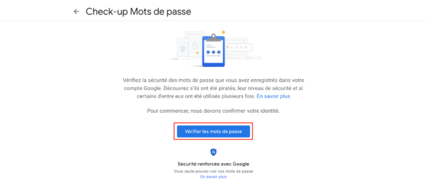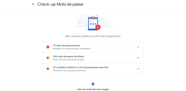 Google propose un outil permettant de savoir si un des mots de passe d’un utilisateur, enregistré sur Chrome ou Android, a été piraté. Nous vous informions il y a quelques jours que, selon les chiffres, plus de 24 milliards de combinaisons de noms d’utilisateur et de mots de passe étaient en circulation sur les marchés cybercriminels, dont le dark web. Ce qui équivaut à près de quatre pour chaque personne dans le monde. À défaut de choisir des combinaisons plus robustes, voici un moyen de vérifier si ses mots de passe Google ont été compromis. Concrètement, grâce à une fonctionnalité, l’utilisateur peut découvrir si les mots de passe de ses comptes Google ont été exposés, ne sont pas suffisamment sûrs ou encore s’ils sont réutilisés dans plusieurs comptes. “Vous pouvez ensuite renforcer la sécurité de ces derniers en modifiant les mots de passe peu sûrs”, indique la société. Depuis son ordinateur, l’utilisateur doit d’abord accéder à passwords.google.com. Il faut ensuite sélectionner “Accéder au Check-up Mots de passe”. L’option “Vérifier les mots de passe” est ensuite proposée, il suffit de cliquer et de se connecter à son compte. Google propose ensuite un rapport des mots de passe piratés, de ceux réutilisés et des comptes protégés par une combinaison peu sécurisée. En cliquant sur un des trois résultats, l’utilisateur peut modifier directement et instantanément chaque mot de passe piraté grâce à un menu déroulant. Il est aussi possible de créer de nouveaux mots de passe uniques ou plus sécurisés.