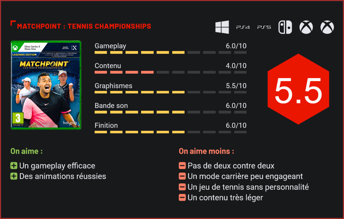 S’ils attendent toujours un nouveau Virtua Tennis ou un nouveau Top Spin, les amateurs de tennis devront cette année se contenter d’une nouvelle licence, qui nous est livrée par l’éditeur Kalypso. Les jeux de tennis ne courent pas les rues ces dernières années. Tout au plus citera-t-on les deux récents Tennis World Tour, très moyennement convaincants, d’un autre petit éditeur, qui a visiblement décidé de ranger au placard la licence. Matchpoint n’est en définitive pas si différent des deux précédents essais. Il s’agit d’une simu de tennis sans prétention, qui a toutefois un joli atout, celui d’être proposé en day-one dans le catalogue Gamepass. Si vous avez souscrit à cette formule sur PC ou Xbox, vous pourrez donc y jouer gratuitement. Visuellement, le jeu est décent, mais n’impressionne guère. On ne va pas vous le cacher, le Gamepass est sans doute la meilleure façon de jouer à cette production. Car même s’il est vendu à un tarif relativement attractif (environ 45€), Matchpoint n’a malheureusement pas grand chose à proposer. Le titre propose un mode carrière très fade, et ne propose pas de deux contre deux. Il faudra se contenter ici de matchs en un contre un, en local ou en ligne. Le mode carrière se contente du minimum syndical avec une succession de matchs entrecoupés par des menus sans personnalité. N’espérez pas vous immerger dans un scénario passionnant, il s’agit ici d’une simu tout ce qu’il y a de plus classique. Le mode carrière est très sobre. Côté gameplay, Matchpoint parvient toutefois à se défendre. Le titre est vraiment très accessible. Toutes les bases du jeu sont expliquées dans un tutoriel très bien fichu. Concrètement, le gameplay repose sur l’utilisation des 3 boutons principaux, qui sont couplés avec une direction à donner avec le stick analogique gauche. Tout est basé ici sur le timing et la mise en place d’une stratégie. Matchpoint a toutefois tendance à se montrer un peu trop simple à maîtriser. Par exemple, impossible ou presque de rater un service tant les développeurs sont généreux niveau timing pour frapper la balle. En alternant les directions et les coups on vient également relativement facilement à bout de son adversaire. Si le jeu est plaisant à deux joueurs, il montre en revanche vite ses limites face à l’IA. Souvent, les mêmes stratégies ont tendance à fonctionner. En l’occurrence, faire courir beaucoup son adversaire en enchainant les frappes d’un côté puis de l’autre. Plus surprenant, on remarque très vite que Matchpoint se contente du minimum syndical côté licences avec 18 professionnels au line-up, et zéro véritable compétition. Le reste du casting est composé de personnages créés de toute pièce. De façon générale, le mode Carrière peine à séduire, la faute à des menus grotesques et un manque flagrant d’inspiration. Par exemple, vous ne verrez même pas votre personnage soulever un trophée lorsque vous remporterez une compétition. Tout ici se limite aux affrontements, dans des stades sans aucune personnalité ni ambiance. Les animations sont très réussies. Relativement pauvre techniquement, Matchpoint ne parvient jamais vraiment à impressionner, ni dans son mode carrière ni même au cœur des matchs. Tout au plus s’agit-il d’un jeu passable, avec quelques bonnes idées. On citera notamment ce système de mini-jeux pour améliorer les compétences de notre joueur, ou les différents atouts et faiblesses des joueurs, qui n’ont malheureusement pas beaucoup d’impact sur le déroulement des parties. Pad en main, le titre n’est pourtant pas bien vilain à jouer. On s’amuse même plutôt bien, le temps de quelques parties. Mais clairement, Matchpoint manque de personnalité, de contenu et de saveur. Vous l’aurez compris, à moins d’être un fan absolu de la discipline, difficile de vous conseiller ce jeu de tennis sans grande prétention. Matchpoint n’a ni la profondeur d’un Top Spin, ni l’ambition d’un Virtua Tennis. Il s’agit d’une simulation très conventionnelle qui n’a de mérite que d’être intégrée au Gamepass dès sa sortie. Les bases d’un solide jeu de tennis sont pourtant bien là. S’il n’est donc pas impossible que les développeurs nous livrent un jour une suite plus aboutie, il faudra malheureusement prendre son mal en patience. La bonne nouvelle, c’est qu’avec l’intégration au Gamepass, Matchpoint a au moins le mérite de disposer d’une solide base de joueurs en ligne. Conclusion Avec Matchpoint, Kalypso nous livre une simulation de tennis très conventionnelle, qui peine à convaincre niveau contenu avec son mode carrière sans ambition et son line-up de professionnels très léger. Si, pad en main, le titre est plutôt plaisant à joueur, son gameplay n’a pas la profondeur d’un Top Spin. Les manquements sont également nombreux : pas de tournoi officiel, pas de deux contre deux, ni de mode de jeu vraiment original. Bref, les passionnés auront tout juste de quoi s’occuper en attendant la sortie d’un nouveau Top Spin ou d’une simulation de tennis plus ambitieuse.