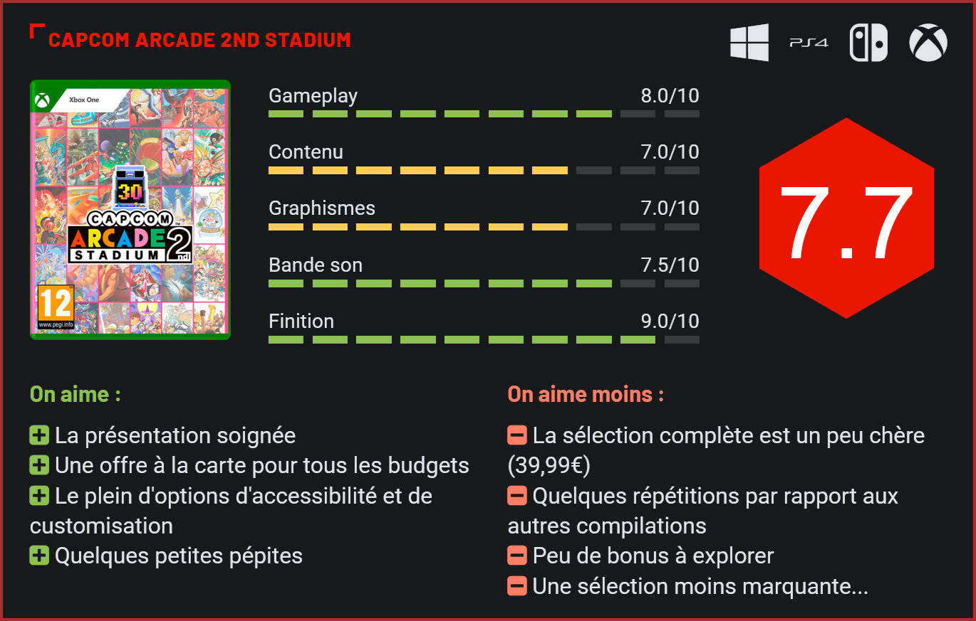 Un peu plus d’un an après nous avoir livré sa première compilation “Arcade Stadium”, Capcom revient à la charge avec une nouvelle sélection de titres “vintage”. La première compilation Arcade Stadium nous avait très agréablement surpris. Capcom avait en effet réunis 32 de ses classiques dans une compil’ digitale, avec des options d’achat à la carte pour acheter indépendamment chacun des titres. Avec sa présentation soignée, ses options d’accessibilité et sa sélection au top, la compilation nous avait charmé. L’éditeur en remet une seconde couche un an plus tard avec Arcade 2nd Stadium qui reprend exactement la même formule et la même tarification. 32 nouveaux jeux sont au programme. Comme dans le premier volet, les 32 jeux de cette seconde compilation nous sont présentés sous la forme de bornes d’arcade auxquels le joueur peut accéder librement. On passe d’une borne à l’autre pour tester tous les titres de la sélection. La modèle économique est également séduisant puisque Capcom offre beaucoup de flexibilité aux joueurs, qui pourront choisir d’acheter les jeux à l’unité à un tarif attractif, en pack de 10 à un tarif de 14,99€ ou sous la forme d’un seul et unique pack à 39,99€. Un tarif qui reste un poil élevé tout de même pour une sélection de très vieux jeux. Ceci étant dit, force est de constater que l’éditeur a travaillé dur sur cette compilation de 32 titres, qui bénéficie d’une présentation impeccable avec ses menus qui font défiler les bornes d’arcade, ses options de customisation des cadres et ses nombreuses options bonus qui n’étaient pas présentes autrefois. Si la compilation s’adresse avant tout aux puristes, les néophytes pourront profiter de nombreuses aides qui n’étaient pas présentes dans les jeux originaux avec une fonction de rembobinage fort pratique, des ralentis de l’action et des vies illimitées. Pratique pour revisiter à son aise ces classiques à la difficulté élevée! Si l’on regrette l’absence de bonus plus nombreux qui donneraient un background à chaque jeu, de nouveaux défis ont été intégrés pour challenger les experts. Les puristes seront également ravis de pouvoir opter au choix entre la version occidentale des jeux ou la version japonaise. Plusieurs épisodes de la saga des Street Fighter sont au programme. Côté sélection, pas de répétitions par rapport au premier volet. Attention néanmoins, on retrouve des répétitions par rapport à la Capcom Fighting Collection tout fraichement sortie et la compilation Street Fighter de l’éditeur puisque trois jeux DarkStalkers se sont infiltrés dans cette compilation, mais aussi Gem Fighter et Puzzle Fighters 2 qui faisaient partie de la Fighting Collection, et cinq épisodes de la saga Street Fighter… Si vous aviez craqué pour ces deux compilations, il y a des chances que vous vous sentiez un peu lésé dans l’opération… De façon générale, la sélection est également un peu moins séduisante que dans le premier volet. On retrouve en effet pas mal de titres relativement méconnus du catalogue de l’éditeur, des suites peu intéressantes (on pense à 1943 notamment, qui n’était sorti qu’au Japon), et des redites à tout va, entre les deux premiers MegaMan – déjà intégrés dans les compilations Megaman -, les trois DarkStalkers, Hyper Street Fighter II, Street Fighter, Street Fighter Alpha: Warriors’ Dreams, Street Fighter Alpha 2, Street Fighter Alpha 3. Clairement, on le sent, Capcom n’a pas pu s’empêcher de glisser quelques grosses licences dans sa sélection pour attirer le grand public. Pour les amateurs de rétrogaming, cette compilation a en revanche nettement moins d’intérêt que la première édition – sauf peut-être pour ce qui est des quelques titres jamais sortis en occident. Mais globalement, on ne peut pas s’empêcher de penser qu’un fossé séparé les deux sélections. L’excellent Street Fighter Alpha 3 a fait le voyage. Arcade 2nd Stadium souffre de surcroit des mêmes défauts que son prédécesseur, avec l’absence de contenus bonus. Pas de documentaires ou de playlists à débloquer. Tout est fondé ici sur l’expérience de jeu… C’est dommage, car c’était justement l’occasion de marquer le coup. Ci-dessous, vous retrouverez la liste complète des titres: 1943 Kai Black Tiger Block Block Capcom Sports Club Darkstalkers: The Night Warriors Eco Fighters Gan Sumoku (GunSmoke) Hissatsu Buraiken (Avengers) Hyper Dyne Side Arms Hyper Street Fighter II: The Anniversary Edition Knights of the Round Last Duel Magic Sword Mega Man: The Power Battle Mega Man 2: The Power Fighters Night Warriors: Darkstalkers’ Revenge Pnickies Rally 2011 LED Storm Saturday Night Slam Masters Savage Bees (Exed Exes) SonSon Street Fighter Street Fighter Alpha: Warriors’ Dreams Street Fighter Alpha 2 Street Fighter Alpha 3 Super Gem Fighter Mini Mix Super Puzzle Fighter II Turbo The King of Dragons The Speed Rumbler (Rush & Crash) Three Wonders Tiger Road Vampire Savior: The Lord of Vampire Conclusion Un peu moins marquante que la première compilation en raison d’une sélection moins séduisante de titres, et surtout quelques répétitions assez vulgaires par rapport à d’autres compilations de l’éditeur, cette seconde sélection de jeux vintage de l’éditeur Capcom a plus de mal à séduire que son ancêtre. On retrouve au total pas moins de 32 jeux – mais les joueurs pourront choisir d’acheter les titres à l’unité ou en “pack de 10”. Parmi ceux-ci, quelques grands classiques du catalogue de l’éditeur, dont Megaman 1 & 2, Street Fighter Alpha 3 et Darkstalkers: The Night Warriors. Sur les 32 titres, la plupart n’ont toutefois pas franchement marqué l’Histoire. Reste que comme avec sa première compilation, Capcom a marqué le coup avec une présentation soignée, des options d’accessibilité comme le rembobinage, le ralenti