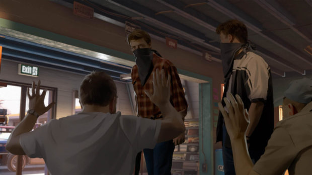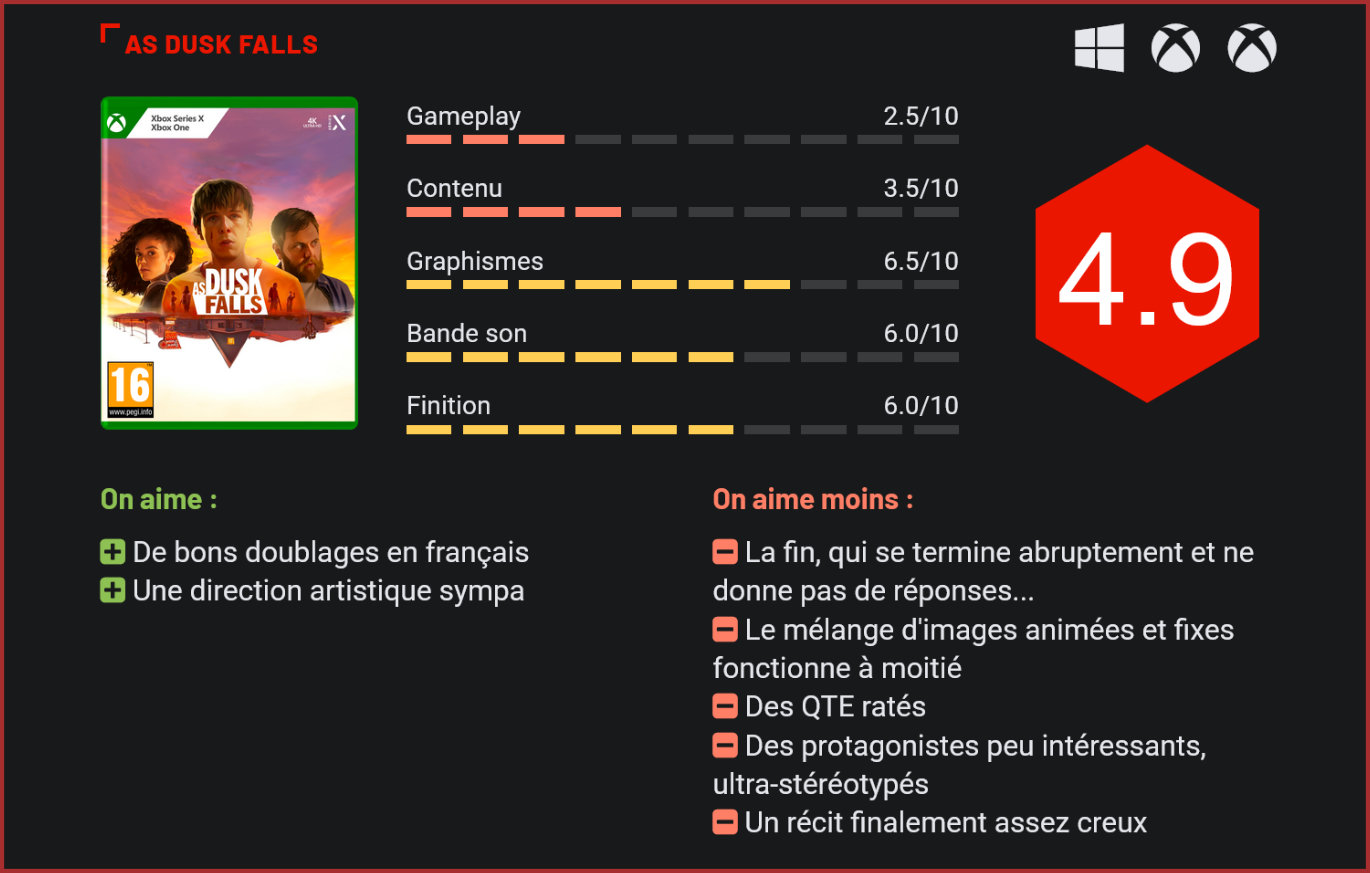 Première production du petit studio londonien Interior Night, As Dusk Falls est un jeu narratif édité par les Xbox Games Studios, qui débarque aujourd’hui en exclusivité sur Xbox et PC. Dévoilé lors de l’E3 2020, As Dusk Falls n’a pas fait beaucoup parler de lui jusqu’à sa sortie. La première production du petit studio britannique Interior Night partage plusieurs éléments en commun avec Tell Me Why, un autre jeu narratif produit par le studio Dontnod, également édité par les Xbox Games Studios. Contrairement à celui-ci toutefois, l’approche est artistiquement très différente puisque As Dusk Falls mixe des environnements en 3D et des images en 2D qui ne sont pas animées. Concrètement, les personnages semblent tout droit sortis d’une bande-dessinée tandis que les environnements en 3D dans lesquels ils se déplacent sont entièrement animés. Un mélange de style unique, qui a certes un certain charme, mais qui ne plaira pas à tout le monde. La direction artistique ne plaira pas à tout le monde. Si, artistiquement, le jeu se démarque des autres productions du genre, les deux styles s’épousent difficilement. Trop souvent, on a l’impression que les personnages sont mal intégrés aux décors. Et puis, il y a cette curieuse sensation à chaque fois qu’un personnage se déplace à l’écran. Les animations sont complètement décalées, avec une à deux images par seconde seulement pour les personnages, et jusqu’à 30 images par seconde pour les décors et objets affichés. Certains joueurs éprouveront ainsi des difficultés à s’immerger dans cet univers de “bande-dessinée” à deux vitesses, artistiquement réussi, mais très maladroitement animé. Côté scénario, le studio britannique s’est montré également très ambitieux qui suit les histoires de deux familles qui s’entrecroisent. En 1998, à la suite d’un cambriolage qui tourne mal dans une petite ville de l’Arizona, trois jeunes décident de prendre en otages les clients d’un motel perdu dans le désert. Très vite, la situation dégénère et la police arrive sur scène… Si les débuts de l’intrigue sont bien amenés, le récit reste globalement très creux. l’aventure principale se finit en ligne droite en moins de trois heures. Après quoi, vous pourrez bien entendu retenter l’aventure pour obtenir une fin différente. Durant nos playthroughs, il nous a toutefois semblé que les décisions du joueur n’avaient finalement que peu d’impact sur l’intrigue, en-dehors de quelques passages. Le final risque malheureusement d’être souvent le même, quels que soient vos choix… Dans le même ordre d’idée, difficile de ne pas être déçu par les actions parfois très surréalistes des personnages. En particulier, des forces de l’ordre qui mettent délibérément en danger les otages à plusieurs reprises. L’écriture peine à convaincre, les personnages aussi. Tous nous ont paru très clichés et bourrés de stéréotypes. Les doublages en français relèvent toutefois le niveau. Les personnages sont assez creux. Si l’intrigue n’est pas déplaisante à suivre, difficile de ne pas voir les ficelles qui tirent le scénario. Tout cela a tendance à transpirer un peu trop les bons sentiments, les valeurs familiales. En l’espace de 3 heures de jeu, difficile aussi d’arriver à creuser suffisamment certains personnages et à s’attacher à chacun d’eux. Les rôles principaux manquent non seulement de charisme mais aussi de profondeur. Dans le même ordre d’idée, les développeurs promettaient une intrigue qui s’étendraient sur plusieurs décennies. Dans la pratique, l’essentiel de l’intrigue se déroule sur une période de quelques heures. L’histoire principale est entrecoupée de quelques flashbacks et se termine sur un bond dans le temps de plus de dix ans. Les QTE sont globalement très mal intégrés. C’est toutefois bien sur le plan ludique que le jeu déçoit le plus, avec un curseur pénible à déplacer à l’écran pour opérer ses choix de dialogues, des choix qui ne sont d’ailleurs pas toujours très clairs au niveau de l’impact qu’ils vont avoir sur l’histoire principale… Les nombreux dialogues sont entrecoupés par quelques QTE extrêmement basiques et des sortes de mini-jeux qui vous demanderont soit d’appuyer sur un bouton, de pointer le stick dans une direction ou de matraquer un bouton, sans que l’on ne voie réellement le rapport avec l’action en cours… Les QTE sont de surcroit très simples à enchainer – difficile de les rater donc, à moins d’être vraiment très gauche. En solitaire, on a vite tendance à s’ennuyer ferme. Le jeu est toutefois également jouable à plusieurs, jusqu’à huit en local (au pad ou vie une app), et en ligne. L’expérience narrative prend alors plus son sens. Mais encore faut-il parvenir à garder tout le monde scotché à l’écran, car comme nous l’avons dit plus haut, le style graphique du jeu et son intrigue ne seront clairement pas du goût de tous. Reste au moins une bonne nouvelle : le titre a le mérite d’être intégré en Day-1 au catalogue du Gamepass. Pas sûr qu’il aurait bénéficié de la même visibilité s’il était sorti uniquement en version digitale. D’autant plus qu’il est vendu à un tarif tout de même assez élevé pour un divertissement finalement très court : 29,99€. Conclusion Avec sa première production, le studio britannique Interior Nights livre un jeu narratif qui se caractérise avant tout par son style graphique, qui mélange des personnages de bande-dessinée et un monde en 3D. Un mariage qui ne fonctionne qu’à moitié… Si artistiquement, le jeu est réussi, son scénario très impersonnel a du mal à convaincre. L’intrigue est courte, les choix narratifs n’ont pas énormément d’impact sur l’histoire, les personnages sont très stéréotypés… Si le jeu n’est pas déplaisant à parcourir, il m