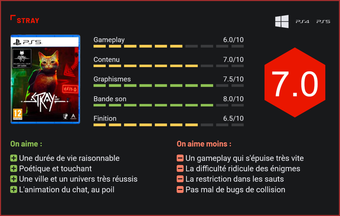 Production indépendante d’Annapurna Interactive, Stray est un ovni vidéoludique. Il vous met dans la peau d’un petit chat roux perdu au beau milieu d’une ville où vivent des robots. S’il s’agit encore d’un jeune studio indépendant, Annapurna Interactive commence sérieusement à faire son trou dans l’industrie vidéoludique. En seulement cinq ans, ce sont pas moins de 23 titres qui ont été édités par le studio californien. Plutôt plaisants et agréables à découvrir, les jeux made in Annapurna sortent régulièrement du lot pour leur concept inédit et intéressant, comme avec Maquette et ses casse-têtes ou 12 Minutes et sa boucle temporelle. Dernier exemple en date : Stray. Exclusivité temporaire pour Sony et ses PS4 et PS5, le titre nous embarque dans une aventure drôlement surprenante. En effet, vous êtes directement expédié dans la peau d’un animal poilu à quatre pattes, à savoir un chat. Vous allez, littéralement, vivre comme un chat. Grimper sur les toits des immeubles, rentrer dans des appartements, voire carrément faire vos griffes sur l’une ou l’autre carpette, préparez-vous à vivre dans la peau d’un félin. C’est bien simple, tout le monde a déjà rêvé de devenir un cat. Mais certainement pas le chat roux de Stray. Se baladant au soleil dans un environnement vert et très herbacé avec sa meute de chats, votre personnage va malencontreusement louper son saut en longueur et tomber dans les bas-fonds d’une sombre ville cyberpunk où vivent dans la misère d’étranges robots anthropomorphes. Vous devrez ainsi vous frayer un chemin parmi d’innombrables dangers pour regagner le monde libre. C’est l’histoire d’une amitié entre un chat et un robot volant… Non, ce n’est pas le début d’une blague. Très vite, notre héros fera la rencontre de B-12, un tout petit robot qui vous servira d’interprète, mais qui vous accompagnera également dans votre aventure. Traduire les explications des robots de la ville, mais aussi vous donner des indices sur la suite à donner aux événements, ce malicieux petit bout de métal volant vous sera d’une aide précieuse et vous évitera de mourir d’ennui. Car il faut bien se l’avouer, ce n’est pas en jouant à Stray que l’on va vivre une aventure pleine d’action et de frissons. Aux antipodes de ce type de jeu, l’aventure d’Annapurna nous plonge dans un récit posé et très calme. Ce n’est en soi pas une tare, mais si vous cherchiez votre nouveau jeu d’aventure trépidant, passez votre chemin. Un titre tout en verticalité, qui peut malheureusement lasser un public plus âgé. À la place, Stray nous impose de nous immerger dans la peau d’un petit chat de gouttière et de son quotidien. En sautant d’un rebord de fenêtre à un autre en passant par une boîte en carton ou une corniche, Stray surprend avant tout par sa verticalité. À de nombreuses reprises, vous aurez à atteindre l’une ou l’autre fenêtre ou encore à rejoindre le toit d’un immeuble pour progresser dans l’aventure. Plutôt agréable, on s’aperçoit très vite que Stray nous plonge dans une sorte de dirigisme pour les sauts à effectuer. Contrairement à ce que pouvaient laisser entrevoir les différents trailers, il n’est absolument pas question de sauter n’importe où à tout-va. Au contraire, une petite icône vous indiquera à quels endroits vous pouvez sauter et à partir d’où. Plutôt frustrant quand on sait qu’un chat aime se faufiler n’importe où et sauter sur tous les points en hauteur. Comme dans la vraie vie, n’espérez donc pas rater un chat et donner lieu à une scène cocasse. Les développeurs ayant visiblement choisi de privilégier un jeu dans lequel il est impossible de “mourir” pour un saut raté. Il s’agit d’ailleurs là de notre plus grande frustration dans le titre, même si l’on ne souhaite évidemment pas la mort de notre boule de poils rousse. C’est tellement jouissif de passer d’un immeuble à un autre par des corniches ! Pour progresser dans l’aventure, vous aurez à résoudre quelques énigmes très faciles, avouons-le. Si le titre nous permet d’explorer certains environnements à notre guise et de récupérer la poignée de collectibles présents, ce sont surtout les énigmes qui représenteront les pierres d’achoppement sur votre parcours. Ne vous tracassez pas, elles rayonnent par leur simplicité. En une poignée de secondes, vous trouverez la solution. La plupart des adultes ne trouveront ainsi aucun défi dans Stray, tandis que les enfants trouveront là une aventure très plaisante avec sa poignée d’énigmes à leur niveau. Mais Stray saura, à quelques moments, nous surprendre par ses quelques phases d’action. Cela peut paraître contradictoire en comparaison à ce qui était expliqué plus haut, mais détrompez-vous. Celles-ci s’avèrent bien trop rares pour dire de véritablement s’imposer dans le titre. Course-poursuite avec les Zorks (des sortes de rats du futur), phase d’infiltration sous la visée des snipers robotisés ou encore extermination des Zorks avec une lumière violette, autant de passages rythmés et amusants, mais qui ne sont pas très nombreux. Ils viennent heureusement diversifier un gameplay qui aura tôt fait de tourner en rond et de se mordiller la queue. Mais encore une fois, une aventure calme et posée comme celle de Stray n’est aucunement mauvaise, elle est juste davantage adaptée à un public plus jeune. D’ailleurs, le titre se boucle en à peu près 8 heures de jeu, ce qui est plutôt raisonnable pour un titre vendu 30 €, disponible gratuitement pour les abonnés PS Plus et un poil répétitif sur le plan du gameplay. La ville est habitée par des robots anthropomorphes à première vue amicaux. Sauter, grimper ou encore griffer, c’est à peu près tout ce qu’est capable de faire notre animal de compagnie. C’est d’ailleurs assez réel, puisqu’il est même capa