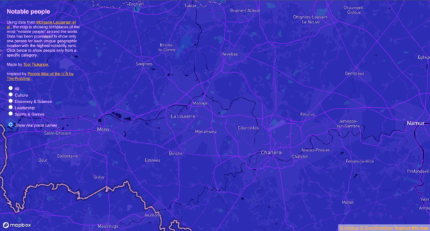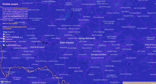 Pour tuer le temps et s’instruire un peu, une carte propose de découvrir les personnalités les plus célèbres de (presque) toutes les villes du monde. Saviez-vous que Tony Parker était né à Bruges ? Maintenant, oui. Découvrir le lieu de naissance de personnalités Topi Tjukanov est un géographe et un concepteur de cartes chez Mapbox. Il est aussi le créateur d’une carte interactive qui permet de visualiser les noms des personnes les plus connues d’un pays, d’une région ou encore d’une ville. Sur la carte, toutes les personnalités sont classées en quatre catégories, à savoir “culture”, “science” et découvertes”, “sport et jeux” et “leadership”. Did you know Freddie Mercury was born in Zanzibar and Barack Obama in Honolulu? Who is the most famous person from your home town? I made a map of the most notable people around the world. Built with @Mapbox. Check it out here: https://t.co/NR0J7nqTn1 🧵 pic.twitter.com/GoI4VnGzvd — Topi Tjukanov (@tjukanov) July 28, 2022 Plus l’utilisateur zoom sur la carte, plus le nombre de noms affichés grandit. Pour faciliter la lecture, les noms des personnalités les plus notables s’affichent en plus gros. Il est aussi possible de baser sa recherche sur le nom de villes en choisissant le filtre “Show real place names”. Une fois la ville recherchée trouvée, il suffit de sélectionner le filtre “All” ou l’une des quatre autres catégories. Vous pourrez ainsi découvrir que vous êtes né dans la même ville que Django Reinhart, par exemple. Capture d’écran de la carte interactive “Notable people” (Mapbox) Capture d’écran de la carte interactive “Notable people” (Mapbox) Une base de données Wikipédia et Wikidata L’ensemble des données proviennent d’une récente étude publiée par le magazine Nature. Cette dernière propose un classement des personnes les plus connues dans le monde. L’évaluation prend en compte un ensemble de données de Wikipédia et de Wikidata. À savoir : Le nombre d’éditions Wikipédia de chaque individu La longueur des pages cumulée de toutes les biographies disponibles Le nombre moyen de vues de biographie pour chaque individu entre 2015 et 2018 dans toutes les éditions linguistiques disponibles Le nombre d’informations précises dans chaque biographie sur l’individu Le nombre total de liens externes, tels que les sources ou les références