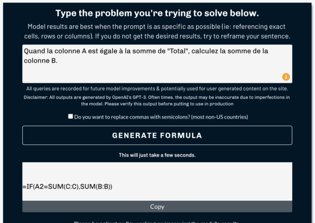 Un nouvel outil bien pratique pour les utilisateurs de Microsoft Excel. Microsoft Excel est un logiciel de la suite bureautique Office de Microsoft. Ce tableur permet la création de tableaux, de calculs automatisés, de plannings, de graphiques ou encore de bases de données. Le logiciel possède des fonctions de calcul numérique, réalisées à l’aide de formules de calcul. Les valeurs du tableau se mettent donc à jour automatiquement en fonction des saisies de l’utilisateur et des calculs. Excel s’avère donc très pratique, mais pour en profiter, il reste encore à savoir créer et utiliser ces formules. C’est ainsi qu’un bot gratuit a vu le jour. Sa mission ? Guider et aider les utilisateurs dans l’élaboration de leurs calculs. À savoir qu’un “bot” est une sorte de petit robot, qui, via une interface, facilite le dialogue entre un service et un consommateur. Ils sont programmés pour réaliser des tâches répétitives spécifiques et exécutent des commandes définies avec précision. Ces commandes prennent la forme d’algorithmes et de scripts, que le bot est capable d’exécuter de façon ultra rapide. Ici, le bot dédié à Microsoft Excel est capable de créer facilement n’importe quelle formule et fonctionne grâce à l’intelligence artificielle. Pour en profiter, il suffit de se rendre sur le site excelformulabot. Ensuite, l’utilisateur n’a plus qu’à expliquer le problème qu’il essaie de résoudre dans la zone de saisie. “Les résultats du modèle sont meilleurs lorsque la demande est aussi précise que possible (c’est-à-dire qu’elle fait référence à des cellules, des lignes ou des colonnes exactes)”, explique le site. “Si vous n’obtenez pas les résultats souhaités, essayez de reformuler votre phrase. Si vous utilisez des guillemets, utilisez uniquement des guillemets simples. Les guillemets doubles provoquent une erreur”. À noter que, pour le moment, le site ne prend en compte que les explications écrites en anglais ou en espagnol. Capture d’écran https://excelformulabot.com/. Le projet propose à ses utilisateurs de faire des dons, qui permettront de financer son développement futur. Pour le moment, le bot a servi à générer près de 322.000 formules Microsoft Excel. Dans un désir de s’améliorer, dès que le bot génère une formule, il demande à l’utilisateur si celle-ci lui a été utile.