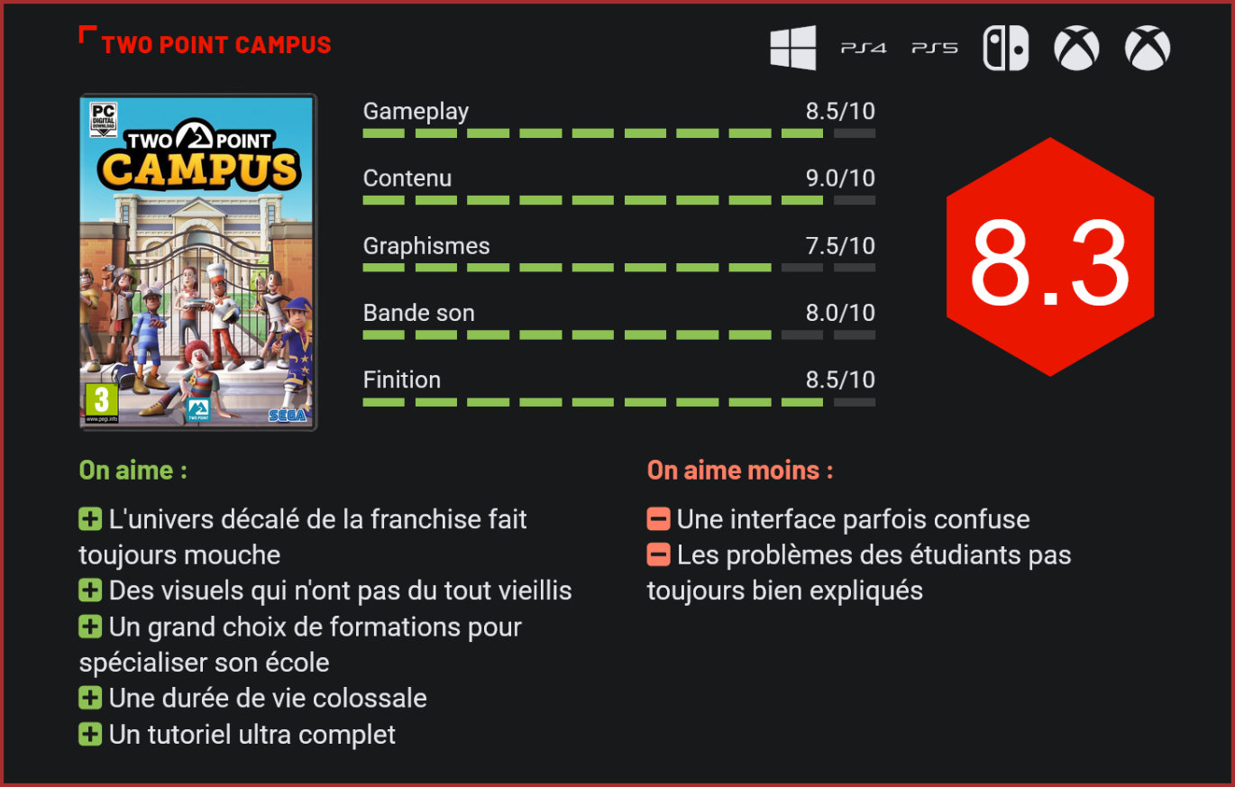 Quatre ans après la sortie très remarquée de Theme Hospital, Two Point s’attaque désormais à la gestion de votre propre université avec Two Point Campus. Un pari audacieux, mais remporté (très) haut la main. Two Point Hospital avait fait sensation à sa sortie en 2018. Remake du cultissime Theme Hospital sorti sur PC il y a 25 ans, le titre de gestion de Two Point Studios nous renvoyait à la tête de ces hôpitaux totalement délirants et déjantés dans lesquels il fallait soigner toute sorte de maladies imaginaires. Les graphismes pixelisés avaient alors laissé la place à de jolis environnements cartoons et le gameplay a bénéficié d’une importante mise à jour non négligeable dans cette réédition du 21e siècle. C’est en cet été 2022, en pleines vacances scolaires, que le studio britannique a sorti le second opus de sa franchise de gestion. Et cette fois, les défibrillateurs et lits d’hôpitaux font place aux auditoires et salles de classe. Two Point Campus (TPC), c’est son nom, vous met dans la peau d’un recteur d’université et devez tout faire pour que votre campus soit le meilleur du comté et qu’il dispense les meilleures formations aux étudiants. C’est bien simple, vous allez pouvoir créer l’école de vos rêves ! Si vous aviez déjà passé des dizaines (voire des centaines) d’heures de jeu sur la version hospitalière de Two Point, alors ce passage à l’université ne se fera certainement pas en terres inconnues pour vous. Le moteur de jeu n’a pas vraiment évolué, les mécaniques de gameplay sont les mêmes et la bande sonore n’a pas bougé d’un iota. Toutefois, et vous vous en doutez, la gestion d’un hôpital n’a rien à voir avec celle d’une université, et c’est ce que nous tenterons d’expliquer dans ce test. Plus d’une dizaine de formations sont disponibles pour spécialiser votre université. Vous pouvez ensuite choisir de dispenser 4 matières dans votre école. Du bien-être de vos étudiants à celui de vos employés, en passant par les différentes salles de classe et autres sanitaires, Two Point Campus vous permet de créer votre véritable petite université américaine comme on peut en voir dans les films. Sauf que là, c’est vous qui gérez l’établissement et n’êtes plus simple spectateur. Vous n’avez pas de notions de gestion d’université ? Pas de soucis. Les développeurs ont élaboré un ingénieux tutoriel pour vous (re)familiariser aux différentes mécaniques de la franchise. Tout au long des 11 scénarios, le titre vous proposera de découvrir les différentes mécaniques donc, mais aussi les façons d’enseigner les 17 formations à vos étudiants, parmi lesquelles les très inspirées formations à la Magie (Poudlard quand tu nous tiens), à l’Histoire d’Internet ou encore à l’Archéologie. Chaque scénario vous permettra de débloquer de nouvelles formations qui peuvent ensuite être dispensées dans les précédentes universités que vous avez gérées dans l’histoire ou dans les futures. Vous vous en doutez, chaque formation permet de débloquer des salles particulières que vous devrez aménager comme bon vous semble avec des accessoires et des objets de décoration directement disponibles dans la boutique, ou achetables avec les Kudosh, la monnaie du jeu (rassurez-vous, pas de contenus supplémentaires payants dans Campus, pour l’instant). Comme dans Hospital, les scénarios se complètent en achevant différents objectifs vous permettant d’obtenir une ou plusieurs étoiles pour la gestion de l’établissement. Sachez enfin qu’un mode bac à sable vous permet de créer votre université de A à Z sans les contraintes des objectifs du scénario. Mais Two Point Hospital n’est généralement pas bien loin. Comme avec les médecins heureux et bien formés qui soignaient plus rapidement et efficacement les patients, il faudra vous préoccuper du bien-être de vos professeurs, mais pas que. Les étudiants doivent, eux aussi, être heureux et bien dans leur peau. Qui dit étudiants satisfaits dit meilleurs résultats scolaires, et qui dit meilleurs résultats scolaires dit meilleure réputation pour votre université. Résidence des étudiants, divertissement, activités sociales ou encore équipement et nourriture nécessaire, vous devrez investir considérablement pour que vos étudiants se sentent bien à l’unif et ne doivent pas s’inscrire aux remédiations. Et s’ils sont heureux, alors ils payent leurs frais scolaires et remplissent les caisses du campus. D’ailleurs, à la manière des Sims, les étudiants ont désormais divers besoins à remplir, comme la forme ou l’hygiène, afin qu’ils étudient mieux leurs matières et engrangent de l’expérience. Pour les satisfaire plus rapidement, ceux-ci vous adresseront également des requêtes, qui consistent généralement à acheter et placer un objet bien particulier. Organisez de plus des événements pour les divertir durant l’année lorsqu’aucun cours n’est programmé. Les développeurs sont même allés plus loin dans la personnalisation des étudiants, puisque des amitiés et des romances sont à présent possibles entre eux. Vous devez engager du personnel qualifié pour dispenser des cours aux étudiants et ainsi les former. De leur côté, les membres du personnel, qu’il s’agisse des pédagogues, assistants et concierges, doivent aussi voir leurs besoins satisfaits. Cela leur permettra d’être plus efficaces au travail, comme lorsqu’ils travaillent à la bibliothèque, enseignent aux étudiants ou nettoient les couloirs. Et comme Two Point ne fait jamais les choses à moitié, tous les membres du personnel sont affublés de traits de caractère influençant leur travail, comme une négligence hygiénique ou un travail très méthodique. Les former vous permettra aussi d’améliorer leur rendement. Comme dans la réalité, le titre prend en compte les périodes de vacances s