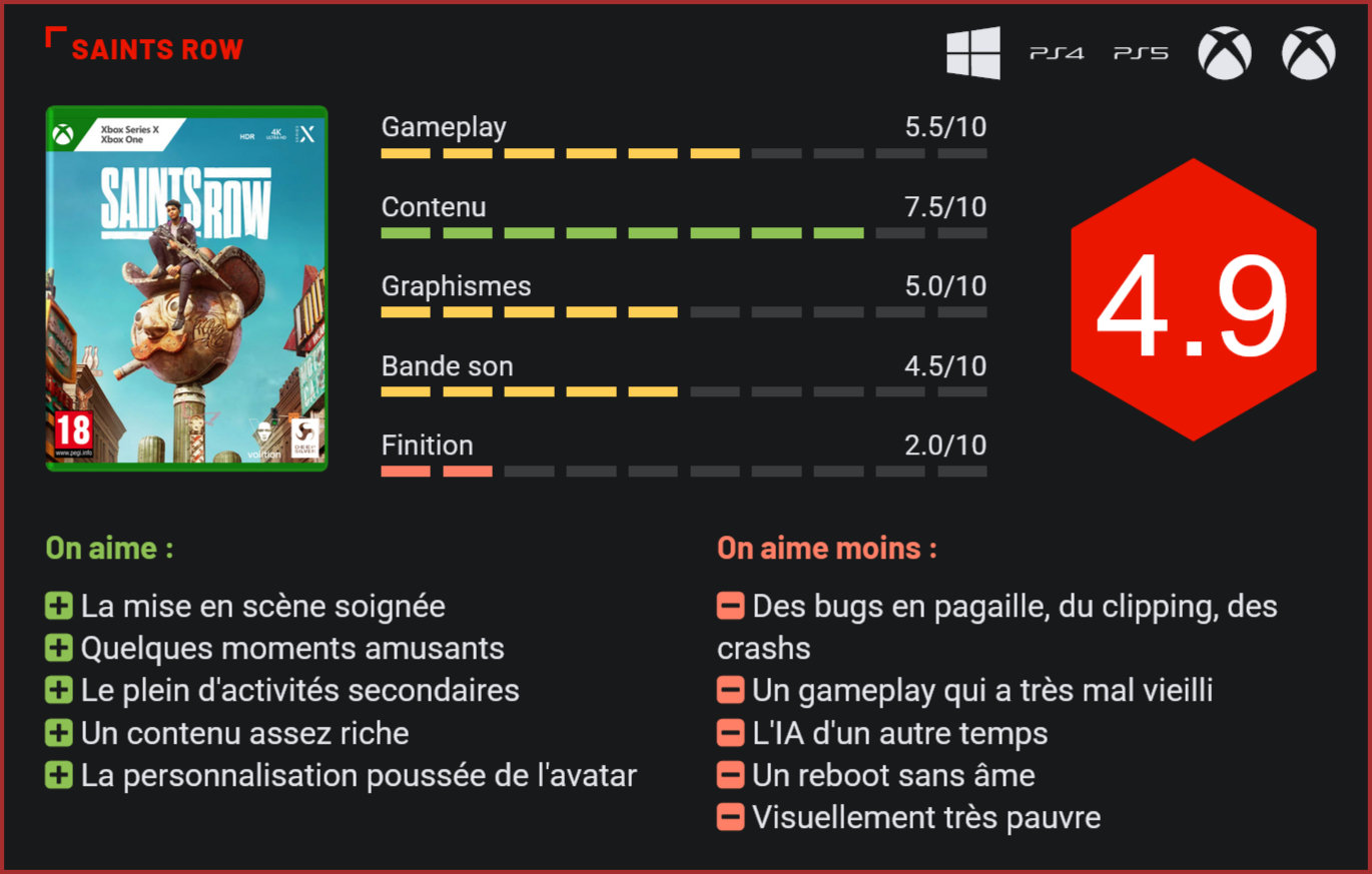 Neuf longues années. C’est le temps que les fans de “Saints Row” auront dû attendre avant d’avoir enfin droit au cinquième épisode de la franchise – qui est en réalité un reboot intégral. Les fans de GTA vous le diront. Durant très longtemps, une seule série a tenu tête au bébé de RockStar. Le studio Volition, auteur des Red Faction, est parvenu à faire de Saints Row l’une des séries les plus en vogue au milieu des années 2000, avec une première trilogie qui remportera un très joli succès, avant d’enchainer plusieurs fiascos. L’annulation de l’épisode portable, sur PSP, en 2009, qui sera suivie par Saints Row 4 et “Gat Out of Hell”, un spin-off déjanté qui plongeait le joueur en enfer. La personnalisation de l’avatar est poussée. Par chance, Volition a survécu à l’effondrement de THQ, et est passé entre les mains de Deep Silver. Le studio nous a livré en 2017 le très décevant Agents of Mayhem, qui se voulait un curieux mélange de Crackdown et de Saints Row, et qui n’est pas vraiment parvenu à convaincre les joueurs. Cinq ans plus tard, Volition revient à la charge avec cette fois un reboot complet de sa série la plus culte. Ce reboot avait déjà fait couler beaucoup d’encre lors de sa présentation. Son ton très teenager, son nouveau casting très inclusif et son univers très cartoonesque n’était pour de nombreux fans pas vraiment “dans la continuité des précédents volets”. Et de facto, on ne leur donnera pas totalement tort. Difficile de tomber sous le charme de cet épisode si vous aviez joué aux précédents volets de la franchise, tant le changement de ton est radical. Les gunfights manquent cruellement de pêche. Ce qui faisait le charme des Saints Row, c’était son casting déjanté, son univers gangsta, sa violence et son côté complètement délirant. Avec ce nouvel épisode, Volition est reparti d’une feuille blanche. Le casting des quatre premiers volets a été remplacé par une brochette d’ados sans aucun charme, qui passent leur temps à nous raconter leur quotidien entre deux missions et à prendre des selfies. Les gangs sérieux des précédents volets cèdent leurs places à des gangs absolument ridicules. C’est bien simple, la plupart des personnages semblent être sortis d’un clip de TekTonik des années 90. La violence passe aussi au second plan, avec beaucoup plus de “politiquement correct” et moins de séquences trash. Reste, heureusement, un ton humoristique, qui sauve (de très peu) le navire du naufrage. Le jeu n’est visuellement pas très impressionnant mais certaines séquences sont réussies. La recette, elle, reste globalement la même. On se retrouve ici dans un large open-world qui n’a plus rien à voir avec ceux des quatre premiers volets puisque l’inspiration vient ici de Las Vegas et du Nouveau Mexique. La carte est gigantesque, mais le level-design manque d’ambition et, surtout, visuellement, les décors manquent et de charme et de personnalité. La plupart des environnements sont également désespérément vides… Le joueur est libre de faire ce que bon lui semble : explorer l’environnement, participer à des quêtes secondaires, améliorer son fief, développer ses activités en ville, rechercher des collectibles ou avancer dans la trame principale. Celle-ci n’est pas forcément très longue. Comptez une douzaine d’heures, en ligne droite. Les missions sont également de qualité très variables. La séquence d’infiltration dans la prison se réduit par exemple à un bête walking simulator sans aucune ambition. D’autres séquences de courses poursuites et d’attaques de base sont heureusement plus marquantes. Saints Row parvient toutefois à marquer les esprits avec ses séquences les plus originales : une descente en wingsuit, une course poursuite dans le désert, sur le toit d’une jeep ou un simili-battle-royale sur une île abandonnée. C’est fun, délirant, ça surprend et ça fait plaisir. Malheureusement, il faut se coltiner également un paquet de quêtes principales sans aucun intérêt ou très mal fichues, à l’image de cette séquence de jeu où on doit détruire le camp d’un gang ennemi en brinquebalant une cabine de toilette. La conduite est très imprécise dans Saints Row. Certains véhicules, à l’image des motos, sont même pratiquement impossibles à diriger. Là où le jeu de Volition brille, c’est au niveau de son contenu, qui est vraiment très généreux. Il y a non seulement de nombreux collectibles à récupérer mais également un nombre impressionnant d’activités annexes à réaliser, des missions secondaires à la personnalisation de son personnage, en passant par la construction de sa base ou le développement de son “empire”. C’est rudement bien fichu, au point qu’on en vient à se demander pourquoi les développeurs n’ont pas tout misé là-dessus. Car dans la pratique, difficile d’être impressionné par le mode solo, qui paraît très fade par rapport aux précédents volets, avec ses personnages sans personnalité ni charisme, ses dialogues longs et plats, ses séquences de jeu ratées et son scénario au raz des pâquerettes. On en viendrait d’ailleurs presque à se demander pourquoi Volition a mis tant d’efforts dans la mise en scène des cinématiques, qui desservent un scénario sans ambition. Certaines missions sortent du lot. Mais ce qui fâche le plus dans ce reboot de Saints Row, c’est sa réalisation globale. C’est bien simple, on a l’impression de jouer à un titre d’il y a dix ans qui aurait été remasterisé. Quelques effets visuels nous en mettent plein les yeux. Globalement, le jeu est toutefois atrocement laid. Les décors sont vides, les modélisations des personnages pauvres, le framerate très faible (n’espérez pas du 60 FPS en 4K!), et le clipping est présent absolument partout à l’écran, même sur les machines de nouvelle génération. Le jeu