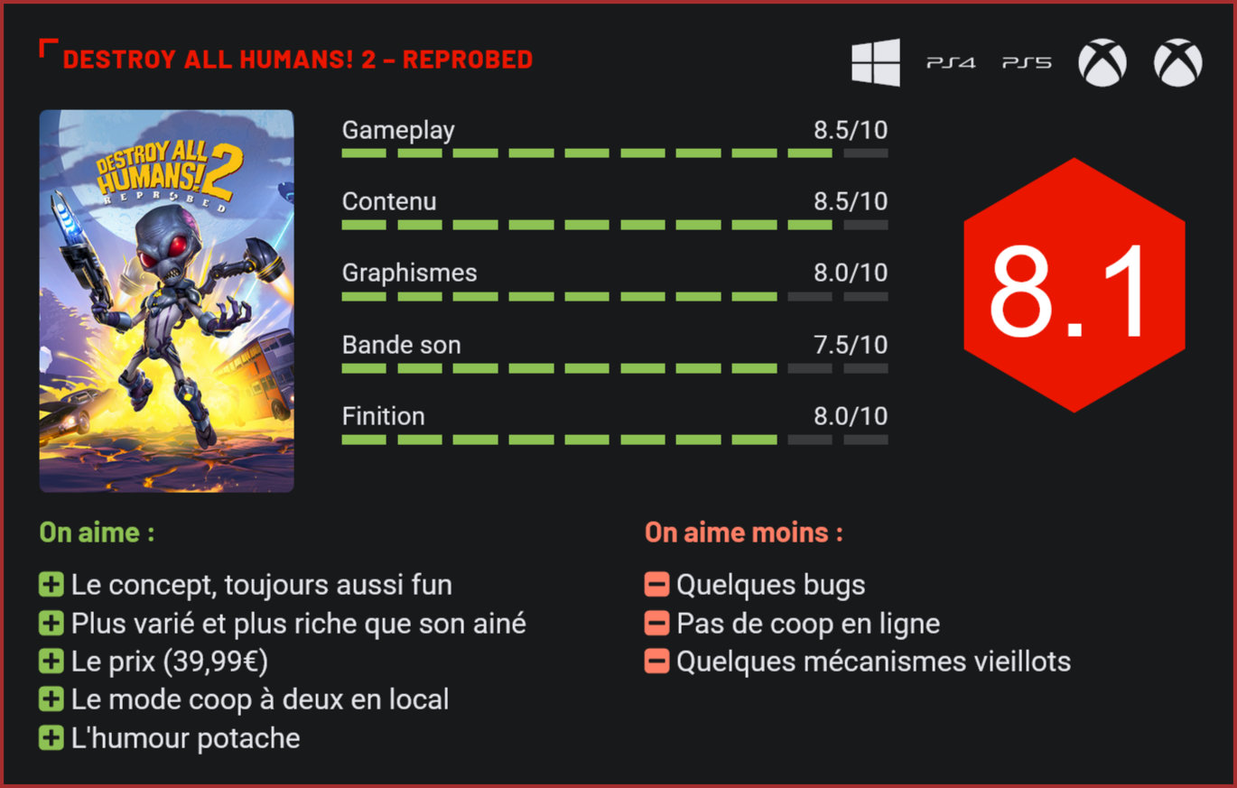 Deux ans après nous avoir livré un très bon remake du premier Destroy All Humans!, THQ Nordic revient à la charge avec le remake du second volet, qui joue clairement la carte du “bigger, better, stronger”. Pour notre plus grand plaisir. Le remake du premier Destroy All Humans! était parvenu à s’imposer comme une très bonne surprise, malgré quelques mécanismes qui avaient mal vieillis. Le studio allemand Black Forest, qui s’était occupé de ce premier remake, revient avec le remake du second volet, qui était déjà en son temps en tout point supérieur à son prédécesseur. L’humour n’a pas changé. Et vous l’aurez très vite remarqué, ce remake du second volet a droit à tout un tas d’améliorations par rapport à l’original – et au remake du premier épisode – qui ne le rendent que meilleur que son prédécesseur. Le premier Destroy All Humans! nous proposait d’incarner un alien qui s’était échoué sur la planète Terre et s’était engagé dans une lutte sans merci pour asservir l’espèce humaine. Le titre se caractérisait par sa direction artistique cartoonesque, un humour sale et un concept partiellement calqué sur celui de Grand Theft Auto, avec des mini mondes ouverts dans lesquels le joueur pouvait semer le chaos, à pied avec son arsenal d’armes toutes plus délirantes les unes que les autres (mention spéciale à la sonde anale!) ou à bord de sa soucoupe spatiale. San Francisco est la première ville où vous déposerez vos valises. La formule reste la même dans ce second épisode, mais le studio a vu beaucoup plus grand. Les open worlds proposés sont ainsi beaucoup plus vastes que ceux du premier volet, mieux structurés et plus variés. On déposera nos valises à San Francisco au début de l’aventure. La ville californienne parvient à séduire d’entrée de jeu avec ses collines verdoyantes, son Golden Gate et son incroyable diversité. Puis direction le Royaume-Uni, le Japon ou encore la Russie. Chaque monde a sa propre atmosphère et charme par sa richesse. Au passage, on applaudit l’excellent travail du studio qui est parvenu à joliment moderniser ces environnements tout en leur insufflant plus de vie. Les décors fourmillent de détails, et c’est un véritable plaisir d’explorer chaque recoin de chacune des villes. Côté gameplay, Destroy All Humans 2! reprend les éléments de son ancêtre tout en améliorant la recette là-aussi. Plus besoin de passer par les multiples tutoriels en début d’aventure, Crypto est cette fois parfaitement équipé dès le début de l’aventure. Il acquerra en revanche de nouvelles capacités et armes en cours d’aventure. La richesse du jeu ici vient surtout du système d’améliorations des armes et capacités qui permet de personnaliser son arsenal dans les moindres détails. Certaines séquences parviennent à agréablement nous surprendre. Notamment, les combats de boss. De façon générale, Detroy All Humans 2! paraît un jeu beaucoup plus moderne que son prédécesseur. Le level-design est bien mieux maîtrisés, les missions sont plus variées, les combats de boss sont prenants, et le titre parvient même à très agréablement nous surprendre avec des séquences de jeu plus délirantes. Les activités secondaires sont toujours là mais moins mises en avant. Elles permettent surtout de se divertir et de récupérer des points d’améliorations pour ses armes et son vaisseau. Par rapport au premier volet, on va donc plus vite droit au but, sans tourner des heures autour du pot dans des didacticiels qui n’en finissent plus ou dans des missions secondaires qui sont désormais totalement optionnelles. Une espionne russe vous accompagnera à travers ces nouvelles aventures. Le scénario du jeu se révèle également étonnamment riche avec ses rebondissements à répétition, ses nombreux seconds rôles, pleins de charme, de l’agent secret du MI6 à votre nouvelle compagne russe, et son intrigue principale. Crypto, qui était devenu le président des Etats-Unis à l’issue du premier volet, est mis à jour par le KGB, qui semble bien décidé à l’éliminer. On notera au passage que là aussi de gros efforts ont été consentis, tant au niveau du character design, qui a été entièrement revu et nettement amélioré depuis le remake du premier volet, que de l’humour. Contrairement au remake du premier volet, le remake de ce second opus ne semble pas avoir souffert d’une forme de censure. L’humour crado est bel et bien de retour et le design des personnages n’a pas été modifié pour “plaire aux masses”. Un grand ouf de soulagement pour les fans. Votre soucoupe vous permet de semer le chaos en ville. Généreux en contenu, le jeu aura de quoi vous tenir en haleine une grosse dizaine d’heures en solitaire, beaucoup plus si vous tentez le 100% dans les collectibles, les missions secondaires et les objectifs secondaires. Et cerise sur le gâteau, en plus du solo, on retrouve un mode coop en écran splitté (mais malheureusement pas en ligne), qui se révèle être un véritable régal. En définitive, difficile de trouver des choses à redire sur cet excellent remake, si ce n’est peut-être quelques éléments qui ont mal vieillis. On pense à certaines missions d’infiltration ou de poursuite, moins réussies que les autres. Prendre l’identité d’un adversaire reste toujours une action compliquée dans le jeu. Et trop souvent, on aura effectivement tendance à sortir les armes pour aller droit au but. Bienvenue au Japon! Par rapport aux autres jeux d’action en open world, Destroy All Humans 2! impressionne par la richesse de son gameplay. On ne se contente pas ici à braquer des voitures ou tirer sur des ennemis. La discrétion fait aussi partie de l’aventure puisque le joueur pourra par exemple rentre sa navette invisible aux yeux des ennemis, pourra se déguiser en humain quelques instants et interagir avec d’autres humains – pour ob