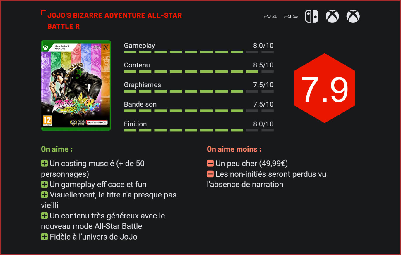 Namco Bandai et CyberConnect font revenir d’entre les morts l’une des meilleures adaptations de manga en jeu vidéo avec JoJo’s Bizarre Adventure All-Star Battle R. Sorti uniquement sur PS3 en son temps, JoJo’s Bizarre Adventure All-Star Battle R est un jeu de combat qui était passé en son temps relativement inaperçu, mais qui a gagné au fil des années un statut de jeu culte. L’éditeur Namco Bandai s’est visiblement bien rendu compte du potentiel du titre et a décidé de mettre les équipes de CyberConnect (Naruto) à l’œuvre. L’éditeur leur a confié un remaster de l’excellent jeu de baston sorti sur PS3. Visuellement, le titre n’a pas trop mal vieilli. Facturé plein tarif (49,99€), ce “remaster” offre une légère refonte graphique – sans toutefois transcender l’esthétique du jeu. En soi, il n’en fallait pas forcément plus puisque graphiquement, le titre n’a pas trop mal vieilli pour un jeu PS3. Les graphismes en cel-shading y sont pour beaucoup. Côté contenus, on retrouve un paquet de nouveautés : des nouveaux personnages, du jeu en ligne et un nouveau mode solo. Exit le mode Histoire, place ici à un mode “All-Star Battle”, qui propose de participer à plus de 100 combats avec des conditions de jeu variées. Un mode généreux donc, dans lequel les joueurs débloqueront des points qui leur permettront ensuite de débloquer des tas de contenus inédits comme des skins pour les personnages ou des illustrations. Les graphismes en cel-shading lui vont si bien… On n’est donc pas ici face à un remaster bête et vilain. On le sent, Cyberconnect s’est donné les moyens pour livrer une version revue et corrigée de son jeu de baston. Cela se ressent jusque dans le casting qui intègre plusieurs nouveaux venus, notamment du côté de la gent féminine. Au total, on retrouve pas moins de 50 personnages jouables, dont tous les incontournables. Côté gameplay aussi, CyberConnect a apporté quelques modifications avec l’introduction de frappes bloquantes et de ruées aériennes qui viennent complexifier un peu davantage le gameplay. Certains coups ont été aussi réajustés pour mieux équilibrer les combats. Et puis, bien sûr, il y a l’ajout du mode en ligne qui ajoute un réel plus pour les fans du titre, et qui modernise énormément la formule. On s’en doute, la communauté ne sera pas très vaste, mais sa présence n’en reste pas moins un joli plus pour les fans, qui pourront s’organiser entre eux pour se donner rendez-vous. JoJo’s Bizarre Adventure All-Star Battle R se positionne donc comme un jeu de baston très fun, avec ses visuels soignés et ses combattants stylés, qui ose l’originalité dans son gameplay, avec des interactions poussées avec les décors et leurs “zones de danger”, une réelle profondeur dans les affrontements et un rythme intense. Les combats sont nerveux et techniques, mais pas trop. Le jeu parvient ainsi à séduire à la fois les passionnés et les débutants. On retrouve ici trois types de coups – attribués à chacun des trois boutons de la manette, auxquels viennent s’ajouter des tas de combinaisons basées sur les mouvements entrés avec le stick. L’originalité ici vient d’un système de “combos faciles” qui permettront même aux moins exigeants des joueurs de lancer des attaques dévastatrices. Le titre marche ainsi sur les traces d’un Marvel vs Capcom en misant sur l’accessibilité et un rooster extrêmement varié. Le gameplay est accessible, mais le jeu sait se montrer exigeant. Alors oui, 49,99€, c’est un peu cher pour un “remaster”, mais il faut bien l’avouer, CyberConnect ne s’est pas contenté ici du minimum syndical. Le cahier des charges est plutôt bien rempli avec l’ajout de nouveaux combattants, un mode solo entièrement revu, quelques ajouts au niveau du gameplay, des tas d’éléments à débloquer, les matchs en ligne et quelques ajustements au niveau des coups. Le contenu du jeu est également assez riche avec le très copieux mode All-Star, le mode Arcade, le mode Entrainement et le mode de jeu en ligne. De surcroit, il faut rappeler que le titre n’était plus disponible à la vente depuis des années et n’était surtout sorti que sur PS3. Pour les amoureux de jeux de combat, il s’agit donc là d’une opportunité unique de redécouvrir ce “classique” méconnu du genre. Pour les fans d’animés, cette adaptation de JoJo en jeu est également l’une des adaptations les plus fidèles d’un manga en jeu vidéo. La quasi-totalité du rooster est présente, le jeu intègre les doublages officiels, et se veut d’une incroyable fidélité à l’univers délirant de Jojo avec ses graphismes en cel-shading et sa superbe direction artistique. Une véritable leçon de maestria de la part du studio nippon, qui signe avec ce All-Star Battle R une formidable lettre d’amour à la série animée. Seul réel reproche qu’on lui adressera : difficile d’y adhérer si on n’a pas goûté à la série. Car si son mode solo est copieux, il place la narration au second plan. Si vous ne connaissiez rien de l’animé, vous ne comprendrez absolument rien à son univers en le découvrant à travers ce jeu. Mieux vaut donc avoir (au moins) parcouru la première saison du show avant de s’y lancer… Conclusion Sortie en 2013 sur PS3, JoJo’s Bizarre Adventure All-Star Battle était passé relativement inaperçu en son temps. Avec les années, le titre a toutefois acquis un statut de jeu culte. Suffisamment pour que l’éditeur Namco Bandai décide de confier aux équipes de CyberConnect un remaster du titre. All Star Battle R reprend tout ce qui avait fait le succès de l’original avec un gameplay extrêmement nerveux, un style de jeu accessible et un casting alléchant de plus de 50 personnages. Il s’agit incontestablement d’un très bon jeu de baston, qui rappelle par instants Marvel vs Capcom pour son style délirant. CyberCo