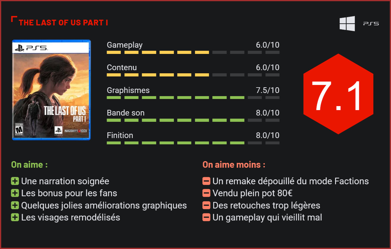 Deux ans seulement après nous avoir livré la suite tant attendu de “The Last of Us”, Naughty Dog nous livre déjà son prochain titre. Un “remake” du premier épisode, qui nous est facturé plein tarif. Doit-on vraiment encore présenter The Last of Us? Le jeu de Naughty Dog a marqué toute une génération de joueurs en mêlant brillamment aventure, action, horreur et survie à travers un cocktail explosif. Malgré l’énorme succès de son jeu, Naughty Dog aura été prudent avec sa franchise, prenant tout son temps pour nous livrer la suite tant attendue sur PS4, en 2020. La hype autour de la franchise le pousse toutefois à mettre en chantier un “remake” du premier volet. Il faut dire que la saga va être portée sur le petit écran par HBO. Sony mise gros sur la franchise. Au point de nous livrer un “remake” que personne n’attendait particulièrement… La mise en scène est toujours aussi soignée. Parce qu’en soi, The Last of Us fait partie de ces titres qui n’ont pas ou que très peu vieilli visuellement. Le jeu avait d’ailleurs déjà eu droit à un joli remaster un an seulement après sa sortie, sur PS4, qui intégrait déjà quelques jolies améliorations comme un frame-rate plus élevé, des retouches graphiques et une distance d’affichage plus grande. Visuellement, les deux versions ne sont en définitive pas si différentes, même si les améliorations apportées par cette version PS5 sont appréciables. De surcroit, Sony parle d’un “remake”, mais les améliorations apportées restent minimalistes. Il faudra se contenter de quelques retouches graphiques et de nouvelles options d’accessibilité. N’espérez pas voir des portions du jeu réécrites, ni découvrir un nouveau système de visée. Les développeurs n’ont absolument pas touché au gameplay. Visuellement, le titre reste très joli. Mais alors, pourquoi parle-t-on d’un remake et non pas d’un simple remaster? Parce que les développeurs l’affirment, ils sont repartis d’une feuille blanche pour concevoir ce “Last of Us” de nouvelle génération. Le jeu tourne désormais en 4K à 40 images par seconde ou en 1440p en 60 images par seconde. Plusieurs éléments graphiques ont été totalement retravaillés, à l’image des effets visuels, qui tirent parti des capacités de la PS5, et des visages, qui ont été entièrement remodélisés. C’est toutefois surtout au niveau des détails dans les décors qu’on sent la différence entre les versions PS4 et PS5. Pour autant, le “gap” n’est pas si gros que ça. A vrai dire, on en vient même à se demander pourquoi Sony n’a pas proposé un simple “patch next-gen”. Oui, le titre est beau, mais on est loin d’exploiter tout le potentiel de la PS5. Les visages ont été entièrement remodélisés. Outre ces quelques évolutions techniques, ce “remake” introduit quelques petites nouveautés comme l’utilisation du gyroscope de la manette DualSense pour ajuster le tir, un mode Photo, les commentaires du réalisateur et des acteurs et des modèles en 3D. Deux petites nouveautés font aussi leur apparition pour les uber-fans : un mode speedrun et un mode “permadeath”, dans lequel vous n’aurez qu’une seule vie. Pour le commun des joueurs, il s’agit d’ajouts très gadgets, et c’est bien dommage car on aurait aimé par exemple profiter de nouveaux mouvements introduits dans le second volet, d’une refonte du système de visée, toujours aussi imprécis, et d’une refonte du level-design, qui a lui très mal vieilli. Si The Last of Us reste un formidable jeu d’action-aventure, certains mécanismes ont très mal vieillis. La visée très imprécise du jeu rend les séquences d’action extrêmement pénibles, les séquences d’infiltration sont toujours aussi pénibles et les puzzles n’apportent absolument rien au déroulement du jeu. Malgré tout, la formule fonctionne toujours. L’excellent scénario du jeu, couplé à la narration soignée et l’univers plein de charme font de The Last of Us une œuvre majeure, que tous les amateurs du genre se doivent d’avoir fait au moins une fois dans leur vie. Dommage toutefois que ce “remake” ne lui rende pas davantage honneur. La visée manque toujours autant de précision. Car, vraiment, on aurait aimé avoir droit à un vrai remake, avec des niveaux entièrement redesignés, un rythme revu, de nouvelles séquences de jeu, une structure plus moderne. En l’état, pour 80€, la pilule a du mal à passer pour un “remaster” avare en nouveautés, et qui se permet même de supprimer une partie du jeu original – le mode “Factions” (mode multijoueur) étant aux abonnés absents. Ceci étant dit, ce “remake” du premier Last of Us prend tout son sens sur une plate-forme en particulier. Pour la première fois, la série débarque en effet sur PC. Conclusion S’il n’a pas trop mal vieilli pour un jeu de 2013 et reste un classique du jeu d’action / aventure que tous les amateurs du genre se doivent d’avoir fait au moins une fois dans leur vie, The Last of Us Part I peine à nous surprendre dans ce remake pour le moins minimaliste. Certes, le jeu a bénéficié d’une jolie refonte graphique, avec l’ajout d’effets visuels et l’ajout de nombreux détails dans les décors, qui permettent de le rafraîchir légèrement. Mais globalement, on se demande si livrer un remake de ce titre était vraiment nécessaire? Après tout, The Last of Us avait déjà eu droit à remaster complet sur PS4. Le titre n’avait en outre pas forcément mal vieilli visuellement. La démarche est d’autant plus douteuse que Naughty Dog s’est contenté de moderniser l’esthétique du titre, mais n’a pas touché au gameplay, ni au système de visée. Vendu plein tarif (80€!), ce “remake” minimaliste a bien du mal à justifier son existence. Reste que si vous en avez les moyens, et étiez passé à côté de l’original, cette “réédition”