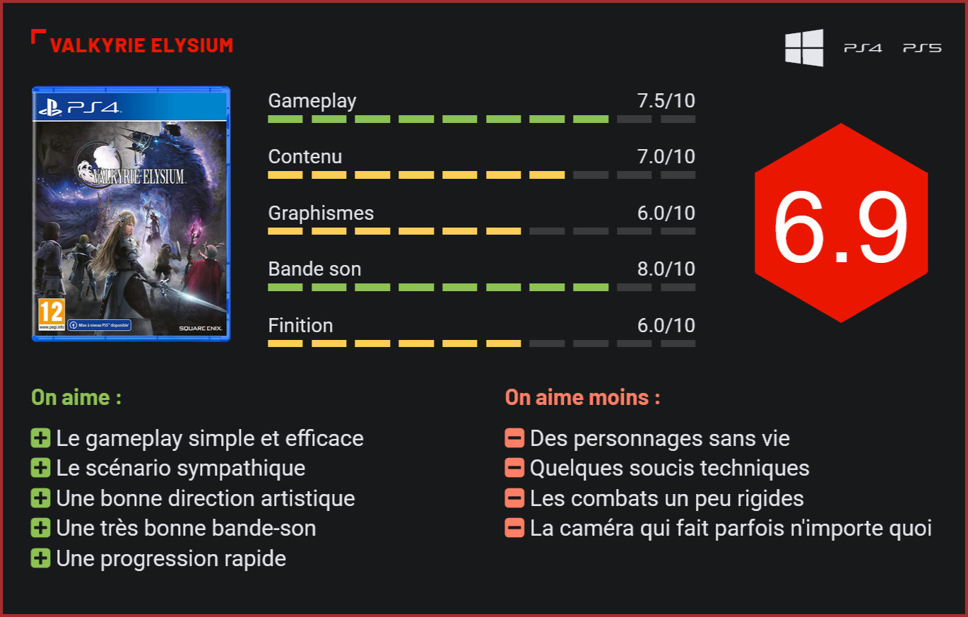 Décidément très productif ces derniers temps, Square Enix propose cette fois le retour d’une série datant de la toute fin du siècle dernier. Valkyrie Elysium est un nouvel épisode dans l’univers de Valkyrie Profile. Les plus vieux fans de JRPG se souviennent sans doute de Valkyrie Profile, un titre sorti en 1999, alors développé par tri-Ace et édité par Enix. Si le premier titre est devenu assez culte pour les fans du genre, on se souvient par contre beaucoup moins que d’autres jeux sont nés de cette licence. C’est donc plus de dix ans après le dernier épisode que surgit ce Valkyrie Elysium, un opus indépendant des autres. Cette nouvelle itération est disponible uniquement sur consoles Playstation pour l’instant, mais devrait arriver le 11 novembre prochain sur PC. Ce n’est pas tri-Ace qui s’occupe du développement cette fois (ceux-ci sont bien occupés par Star Ocean: The Divine Force qui arrivera le mois prochain) mais le studio Soleil. Nous incarnons une Valkyrie dans un univers très inspiré de la mythologie nordique. Alors que l’apocalypse, le Ragnarök, mène le monde au bord de la destruction, nous sommes invoqués par Odin pour l’aider à restaurer ses pouvoirs et pour ensuite sauver ce qu’il reste à sauver. Notre mission en tant que passeuse d’âme est alors d’aller dans le Midgard, le royaume des Hommes, pour y trouver des âmes de guerriers prêts à servir Odin pour sauver le monde. On appelle ces âmes des Einherjar. Valkyrie Elysium se déroule dans un monde en ruine. Ce scénario mystérieux et efficace va nous plonger dans un univers plutôt mélancolique et où la vie se fait rare. Un aspect que l’on peut reprocher au jeu tant les différents environnements à explorer semblent vides, à l’exception des ennemis dont il faudra se défaire. Il s’agit cependant d’un choix en accord avec l’univers du jeu, un monde sans vie est exactement ce que le scénario nous présente. Un choix qui arrange sans doute bien le budget du titre, bien plus modeste que les grosses productions de Square Enix. Si visuellement, les décors s’en sortent plutôt bien, les personnages sont beaucoup moins reluisants. Ceux-ci ont des animations très limitées, et ne parlons même pas de la synchronisation labiale ratée. Le titre utilise un léger contour noir, à la manière du Cel-Shadding, autour de ses décors et personnages, qui eux, sont pourtant réalisés dans un style plus réaliste. Un mélange étrange, mais qui n’est pas déplaisant. Valkyrie Elysium propose tout de même une ambiance très sympathique, et notamment grâce aux musiques mémorables du jeu. Celles-ci s’adaptent à la situation en offrant différentes variantes des mêmes thèmes. Comme les précédents épisodes de la licence, on retrouve le talentueux Motoi Sakuraba (Dark Souls, Tales of…) à la musique. Le système de combat est vraiment efficace. Côté gameplay, le titre se montre assez simple. Contrairement au premier épisode, Valkyrie Elysium est un action-RPG. Depuis le Valhalla, il est possible de choisir différentes missions qui vont nous envoyer vers des niveaux linéaires à parcourir dans lesquels se trouvent de nombreux ennemis, mais aussi quelques collectables et coffres à trouver. Les quêtes principales sont assez longues, mais nous permettent de débloquer des missions secondaires plus courtes. Dans les niveaux, nous contrôlons la Valkyrie qui est capable de manier plusieurs armes blanches ainsi que d’utiliser la magie. Des attaques faibles et fortes lui permettent d’utiliser quelques combos, et des objets trouvés dans les niveaux permettent d’apprendre des magies élémentaires. Chaque ennemi est sensible à un élément et utiliser ce dernier à plusieurs reprises va permettre de désorienter nos adversaires. C’est également le cas des boss très agressifs et plutôt réussis, dont il faut prendre avantage des faiblesses. Si la maniabilité n’est pas parfaite, la Valkyrie paraissant assez lente et lourde à contrôler, de nombreuses options de combat se débloquent au fil du jeu. La progression est d’ailleurs très rapide puisque l’on débloque vite de nouveaux combos, soit en améliorant nos armes, soit en allant faire un petit tour dans les arbres de compétences de notre héroïne. Nous pouvons dépenser des cristaux de couleur récupérés en battant les ennemis ou dans les coffres des niveaux pour gagner de nouvelles aptitudes très utiles. L’on peut alors débloquer des extensions de nos combos, ou même la possibilité de réaliser des contre-attaques après nos esquives parfaites et parades parfaites, le jeu devient alors plus technique et plus fun au cours de notre progression. Le scénario nous permet aussi de recruter les Einherjar, des personnages qu’il est possible d’invoquer en combat. Nous sommes capables d’en invoquer plusieurs en même temps, ceux-ci sont contrôlés par l’intelligence artificielle et vont servir de soutien, en plus d’affecter l’élément qui leur est lié à notre arme principale. Certains combats sont très prenants. L’utilisation des Einherjar rend les combats plus difficiles à lire et le tout un peu bourrin, mais le gameplay s’en sort généralement plutôt bien, sans pour autant atteindre un niveau technique incroyable. Il est cependant tiré vers le bas à cause de certains soucis techniques, principalement sa caméra un peu folle dans les endroits exigus et sa fluidité inconsistante. Cette dernière ne tombe pas à des taux affreusement bas, mais le nombre d’images par secondes fluctue beaucoup trop souvent, ce qui peut déranger. Avec trois niveaux de difficulté, le jeu se montre assez accessible, mais propose tout de même un peu de challenge, en particulier durant les combats de boss. S’il est loin d’être un chef-d’œuvre et qu’il va peut-être décevoir les fans du jeu original, Valkyrie Elysium n’en reste pas moins un titre simple et efficace. Celu