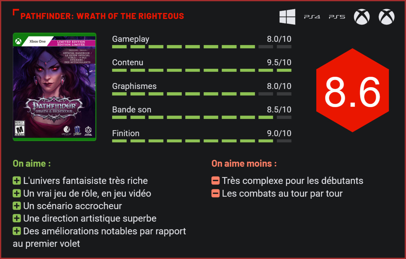 Après un Kingmaker très séduisant, Owlcat Games revient sur le devant de la scène avec une suite ambitieuse, baptisée Wrath of the Righteous. Marchant à contre-courant des autres productions, Pathfinder: Wrath of the Righteous est un jeu de rôle old-school qui tente de reproduire l’expérience d’un jeu de rôle classique à la Donjons & Dragons, avec des choix qui impactent le scénario, des milliers de dialogues et des combats au tour par tour. C’est un jeu élitiste qui s’adresse donc avant tout à un public de passionnés. Tout l’inverse d’un Elder Scrolls ou d’un Dragon Age donc. Attendez-vous à croiser de gigantesques créatures! L’histoire qui nous est narrée dans ce second opus prend place dans le monde de Golarion, dans une région lointaine de celle que l’on parcourait dans le premier épisode, peu de temps après les événements narrés dans Kingmaker. La nation de Mendev qui vous accueille est en conflit depuis des siècles avec des forces démoniaques, qui s’échappent de la faille. Ils ont organisé quatre croisades pour tenter de repousser les démons, sans succès. Aujourd’hui, Mendev est sur le point de lancer sa cinquième croisade, et vous êtes sa meilleure arme. Avec son scénario épique, Pathfinder: Wrath of the Righteous parvient à agréablement nous surprendre sur le plan narratif. Les six longs chapitres du jeu vous tiendront scotché à votre pad du début à la fin. Avec son bestiaire gigantesque, son univers très riche et ses nombreux personnages plein de charisme, Pathfinder: Wrath of the Righteous frappe fort et devrait sans l’ombre d’un doute captiver les passionnés de fantasy. Les décors sont souvent très soignés. La force du jeu, c’est toutefois d’allier à la fois des choix qui permettent de réellement influencer le cours de l’histoire, et de proposer des dialogues passionnants à suivre. Les fans de Baldur’s Gate en auront donc largement pour leur argent. Par rapport à Kingmaker, on note également pas mal de jolies petites nouveautés, comme la voie mythique. Concrètement, les choix narratifs que vous ferez influencera vos relations avec vos compagnons d’aventure, ouvriront de nouvelles routes narratives et bloqueront d’autres quêtes, voire même le recrutement de certains personnages. Vous pourrez façonner ce monde selon vos envies, et c’est sans doute la plus grande réussite de cette suite, qui offre un niveau de rejouabilité tout simplement remarquable pour les passionnés de RPG. Autre amélioration notable : les textes sont désormais pratiquement tous doublés, ce qui nous aide forcément à beaucoup plus s’immerger dans l’univers du jeu. Le premier volet avait été fortement critiqué sur ce plan. Owlcats a bien écouté les critiques et livre aujourd’hui un titre beaucoup plus complet à ce niveau. Et puis bien sûr, il y a l’écriture, qui s’est grandement améliorée, avec des dialogues agréables à suivre, un meilleur sens du rythme, des personnages mieux écrits. Le scénario du jeu est vraiment agréable à parcourir. On le sent, le projet a beaucoup gagné en maturité. Les environnements sont souvent très sombres. Côté gameplay, le tout repose sur des bases solides. L’aventure commencera avec la création de votre personnage. Le système de création a beaucoup évolué depuis Kingmaker, puisqu’il offre désormais accès jusqu’à 25 classes et 12 races différentes. Le tout étant entièrement paramétrable, il y a moyen de se créer un personnage vraiment sur mesure. On ne va pas vous le cacher, tout cela ne sera toutefois pas évident à saisir pour les nouveaux venus, qui devront parcourir un tas de menus et potentiellement de guides pour créer leur personnage. Ce qui est intéressant toutefois, c’est qu’il est vraiment possible de choisir sa façon de jouer. Serez-vous plutôt un archer qui élimine ses cibles à distance? Un puissant magicien? Un guerrier? Ou plutôt un assassin qui s’infiltre dans le dos de ses ennemis? Accompagné de cinq compagnons, vous partirez à l’aventure dans un vaste monde ouvert. Le jeu est fort axé exploration et dialogues, mais propose également des affrontements. Vous avez ici le choix du tour par tour ou des combats en temps réel. On ne va pas vous le cacher, les combats au tour par tour ne sont pas la grande force du jeu. Oui, les combats peuvent être tactiques, grâce à l’utilisation de différentes armes et sorts, mais le tour par tour n’apporte ici absolument rien d’intéressant par rapport au temps réel. De surcroit, Owcal a grandement amélioré l’IA des ennemis, les animations des personnages et a ajouté des combats sur diverses montures. Alors certes, on n’atteint pas le niveau d’excellence d’un Diablo, mais globalement, Pathfinder reste un jeu plaisant dans sa partie combats. A tout cela, il faudra ajouter une section différente avec la partie gestion, qui a été un peu simplifiée par rapport à Kingmaker puisque vous ne devrez plus gérer que quatre composantes principales au lieu de dix : la diplomatie, la logistique, le leadership et le militaire. Il faudra continuellement améliorer votre villégiature pour pouvoir progresser dans le jeu. Car si les aventures en-dehors de vos murs sont les plus excitantes, la partie gestion reste une composante essentielle, car il faut financer la guerre. Il faudra donc récupérer des ressources qui permettront de créer de nouvelles structures, faire du commerce, renflouer ses effectifs, travailler la morale des troupes et envoyer ses troupes au combat. Certaines parties du jeu peuvent vite devenir très complexes et Owcal a pensé à tout puisqu’il est possible d’entièrement les automatiser. Le jeu sait se montrer sanglant Incroyablement riche en contenus, parfois fastidieux, mais tellement enrichissant, Pathfinder est une franche réussite et le genre de RPG que vous ne lâcherez plus durant des dizaines d’heures si vous accroche