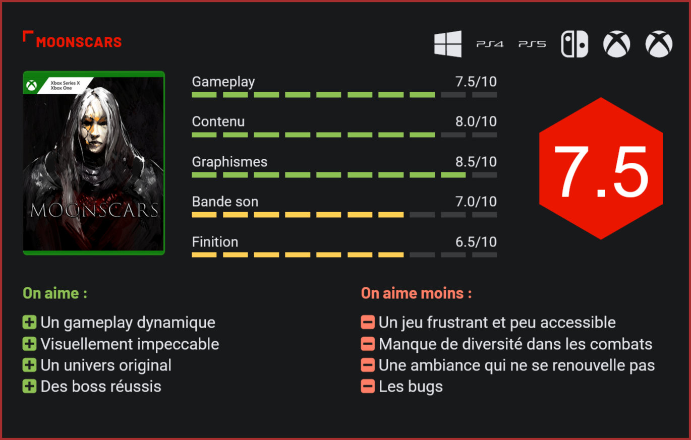 Premier projet d’un studio nommé Black Mermaid, Moonscars est un jeu d’action en 2D à la difficulté très prononcée. Si le titre s’en sort plutôt bien, le bilan est cependant loin d’être parfait. Disponible depuis la toute fin du mois de septembre, Humble Games propose un nouveau titre développé par un studio nommé Black Mermaid. Un peu à la manière d’un Blasphemous, Moonscars est un jeu d’action en 2D qui fait partie des héritiers de l’influence de Dark Souls. Il s’agit donc d’un jeu difficile et peu accessible, qui montre tout de même de nombreuses qualités artistiques. Dans un univers empreint de désespoir, nous incarnons Irma la grise, une guerrière souffrant d’une faim insatiable pour l’ichor, une substance liquide représentant l’âme d’individus. Pour se défaire de ce mal, elle va transposer son propre ichor dans un réceptacle d’argile, ce qui lui permet de continuer à explorer le monde. Elle est à la recherche d’un homme que l’on appelle le Sculpteur, qui semble détenir les réponses à ses nombreuses questions concernant son existence. Il faudra se défaire de beaucoup d’ennemis pour avancer dans notre quête. Nous prenons alors le contrôle de ce réceptacle d’argile. Moonscars est un jeu en 2D dans lequel nous devons explorer des zones, parfois labyrinthiques, qui contiennent de nombreux ennemis plus féroces les uns que les autres. Dans ces zones, on trouve également des miroirs qui servent de points de contrôle bien mérités. Ces miroirs servent aussi de téléporteurs vers d’autres miroirs et permettent aussi de rejoindre l’endroit où repose notre véritable corps, où se trouvent également d’autres personnages avec qui il est possible de parler et parfois même de leur acheter ou vendre des objets. Irma sait se défendre avec une épée, celle-ci possède également la possibilité de faire des esquives et de parer des attaques, le faire avec un bon timing permettra de réaliser une contre-attaque dévastatrice. Les habitués des jeux du genre connaissent la chanson, vaincre les ennemis rapporte une monnaie que l’on peut perdre lors de notre mort. Il faudra alors retourner à l’endroit de notre trépas pour avoir une chance de récupérer nos biens. Dans le cas de Moonscars, cette monnaie permet surtout d’investir dans des magies et techniques de combat pour notre héroïne. Ces capacités magiques puisent dans notre jauge d’ichor, de même que notre habilité à nous soigner. Cette jauge est une ressource importante à prendre en considération puisqu’elle se recharge petit à petit lorsque l’on frappe nos ennemis. Rares sont les environnements qui offrent des ambiances différentes. Le titre encourage donc un style de jeu agressif, ce qui ne sera pas toujours aisé au vu de sa difficulté. Les ennemis tapent fort et sont nombreux, on y perd très souvent la vie. Chaque nouvelle incarnation remet notre niveau de malveillance à zéro, battre les ennemis nous permet alors de gagner ces niveaux et de choisir parmi plusieurs bonus valables durant cette vie. Enfin, nous sommes souvent amenés à combattre un réceptacle précédent. Suite à notre victoire, nous pouvons alors choisir parmi trois pouvoirs très utiles. Il faut reconnaître l’efficacité de son gameplay. Moonscars propose des affrontements pêchus et des idées intéressantes. Son level design est parfois bien pensé, nous offrant l’opportunité d’utiliser certains éléments de décors à notre avantage pour se débarrasser des ennemis. Mais le jeu se montre aussi très peu accessible. Son scénario reste nébuleux durant une bonne partie de l’aventure, de même que les tutoriels peu clairs concernant les nuances du gameplay. Le titre manque aussi de diversité, à la fois dans les ennemis présentés et dans les situations. Il donne tout de même le sentiment que nous avons vu tout ce que le jeu propose en termes de mécanique de combat après les premières heures. Moonscars se montre assez frustrant, notamment à cause des très nombreux ennemis à combattre en même temps et ayant de très grandes barres de vie. La direction artistique est une vraie réussite. Moonscars se rattrape néanmoins sur ses nombreuses qualités visuelles. Il propose un univers très intriguant, avec des concepts originaux et une esthétique sombre. Le titre paraît même presque en noir et blanc, mais des touches de rouge viennent habiller les environnements tâchés de sang ainsi que faire ressortir la tunique de notre héroïne. Réalisé entièrement dans un pixel art très détaillé, Moonscars propose aussi de très belles animations. Celles-ci mettent bien en valeur les attaques des différentes créatures, en particulier celles des boss qui sont visuellement impressionnantes. Il est pourtant dommage de voir que les différents environnements ne proposent pas des ambiances plus marquées. On sort du jeu avec l’impression que toutes les zones se ressemblent un peu. Des mélodies tristes tournent en fond durant nos explorations. Si elles sont dans le ton du jeu et qu’elles ne sont pas désagréables à écouter, elles ne sont pas non plus particulièrement mémorables malgré les nombreuses heures passées dans le titre. La durée de vie va varier dépendant de vos capacités à vous acclimater au gameplay, mais une dizaine d’heures devraient normalement être suffisantes pour arriver aux termes de cette aventure. Celle-ci propose quelques objets cachés bien utiles pour affronter les nombreux obstacles. Il n’est cependant pas exclu de voir le jeu crasher ou de croiser quelques bugs, peu importe sur quelle machine vous jouez. Humble Games a déjà promis de déployer un patch pour régler ces problèmes. Conclusion Moonscars est un titre développé par un studio nommé Black Mermaid et édité par Humble Games. Il s’agit d’un jeu d’action en 2D qui fait partie des œuvres très influencées par Dark Souls. Nous incarnons Irm