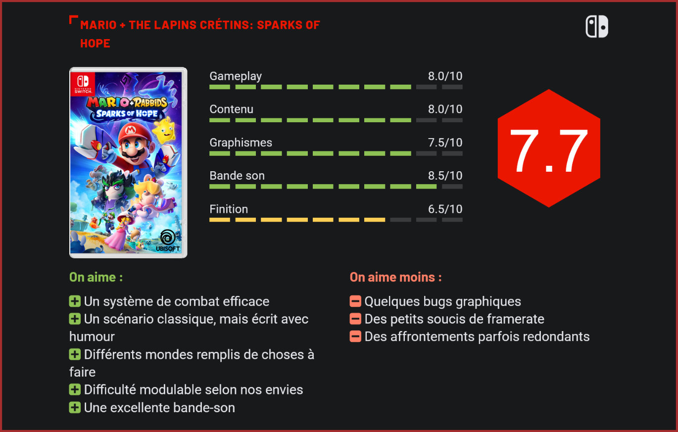 Ubisoft et Nintendo s’allient à nouveau pour proposer la suite du Mario + The Lapins Crétins de 2017. “Sparks of Hope” est une nouvelle aventure qui garde le concept du jeu original, mais qui s’en démarque sur de nombreux aspects. Il y a un peu plus de cinq ans, alors que la Switch n’était sortie que depuis quelques mois, débarquait un titre qui en a surpris plus d’un. Une collaboration entre Nintendo et la firme Ubisoft, l’une des équipes de l’éditeur français avait la lourde tâche de réaliser un jeu faisant cohabiter les univers de Mario et des Lapins Crétins. Le résultat final, Mario + The Lapins Crétins: Kingdom Battle, deviendra finalement un très bon succès critique et commercial, figurant parmi les gros titres de la première année de la console. Il n’est alors pas surprenant de voir cette suite débarquer, même si Sparks of Hope chamboule quelque peu la formule établie dans le premier épisode. L’aventure commence dans le Royaume Champignon en paix, où de nombreux Lapins Crétins séjournent suite aux évènements du premier jeu. Le calme sera très vite bouleversé par l’arrivée d’un Spark, une fusion entre un Lapin Crétin et un Luma. Celui-ci est poursuivi par un nouvel antagoniste nommé Cursa qui, grâce à ses pouvoirs, contrôle toute une armée de lapins et d’ennemis récurrents de la franchise Mario. Les protagonistes (une équipe composée dans un premier temps de Beep-0, Mario, Luigi, Peach, Lapin Mario, Lapin Luigi et Lapin Peach) vont s’échapper avec ce Spark et vont partir explorer différents mondes à bord d’un vaisseau spatial. Ils sont à la recherche de Harmonie qui serait en danger à cause de Cursa. L’aventure nous emmène visiter différents mondes aux ambiances distinctes. Le titre se divise alors en plusieurs mondes à explorer, qui sont tous corrompus par les pouvoirs de Cursa. À la différence du premier jeu qui restait très proche des environnements habituels des jeux Mario, les mondes proposent ici des ambiances bien plus variées. Ces environnements sont explorables et proposent tout un tas d’objectifs annexes, d’énigmes et de mini-jeux permettant d’obtenir des objets et de l’argent. Ces mondes seront, dans un premier temps, affectés par les pouvoirs de Cursa, il faut alors leur rendre leur apparence normale en réalisant différents combats. Sparks of Hope se démarque du premier épisode en proposant un gameplay de jeu de rôle tactique au tour par tour un peu plus classique. Nous bataillons en donnant des ordres à quelques personnages de notre équipe, chacun d’entre eux possédant la capacité d’attaquer ou d’utiliser une habilité spéciale propre à chaque personnage. Plusieurs nouveaux équipiers vont nous rejoindre, chacun possédant de nouvelles compétences à exploiter. Mario est, par exemple, un personnage polyvalent qui peut attaquer deux adversaires en même temps, Luigi servira plutôt d’attaquant à distance avec son arc, tandis que Lapin Peach pourra soigner les membres de l’équipe… Chaque personnage possède son propre type d’arme. Il faut aussi compter sur les Sparks pour apporter de nouvelles habilités à nos personnages. Avancer dans l’histoire et réaliser des quêtes annexes nous permet d’être rejoint par plusieurs Sparks aux spécificités diverses. Ceux-ci peuvent monter de niveau en échange de fragments d’étoiles que l’on trouve un peu partout. Une fois équipés à nos personnages, ils peuvent être utilisés en combat pour octroyer différents avantages. D’autres actions viennent enrichir nos possibilités de jeu, puisqu’il sera, par exemple, possible de réaliser une glissade qui inflige des dégâts et qui permet de vaincre instantanément certains petits ennemis. Avoir deux personnages côte à côte permet également de réaliser un saut et ainsi de pouvoir aller plus loin que la limite de déplacement, ou encore de prendre de l’altitude. Le tout se déroule dans des arènes bien conçues qui possèdent un peu de verticalité et de nombreux obstacles permettant de se mettre à couvert. Le gameplay est assez réussi, et il faut prendre en compte de nombreux paramètres pour atteindre les objectifs variés des batailles. Le titre arrive tout de même à se montrer exigeant, en particulier pour les personnes peu habituées au genre. Se soigner requiert d’ailleurs de dépenser un peu d’argent, ce qui nous empêche de tout dépenser dans des objets. Cependant, plusieurs options de difficulté nous permettent de customiser notre expérience, et même de rendre les combats impossibles à perdre. Autre point fort du jeu, c’est son excellente bande-son. Celle-ci est réalisée par trois compositeurs de talent que les amoureux de jeux vidéo reconnaîtront sans doute : Gareth Coker (Ori and the Blind Forest, Immortals Fenyx Rising…), Grant Kirkhope (Banjo-Kazooie, GoldenEye 007…) et Yoko Shimomura (Kingdom Hearts, Final Fantasy XV, Mario & Luigi…). Il faut aussi compter sur un peu de doublage en français. Si les personnages de Mario gardent leur voix habituelle, les personnages originaux ainsi que les lapins possèdent quelques répliques qui viennent renforcer le côté léger et humoristique de cette aventure. Les mondes cachent des zones secrètes. Le bilan visuel est un peu moins brillant. Sans être impressionnant techniquement, la direction artistique du titre convainc sans peine avec ses décors colorés et inventifs. Sparks of Hope souffre cependant de quelques rares bugs graphiques, mais surtout de chutes de framerate lors de notre exploration des différents mondes. Si tout cela n’est pas bien dérangeant, il est dommage de voir que cet aspect vient noircir le tableau. Le titre se révèle plutôt court pour un RPG, mais prendra tout de même quelques dizaines d’heures pour voir tout ce qu’il a à offrir. Ce que nous conseillons grandement pour ne pas passer à côté de défis et d’activités sympathi