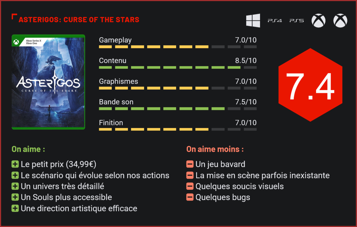 Développé par une petite équipe d’indépendants depuis 2016, Asterigos: Curse of the Stars est un nouveau titre s’inspirant grandement des jeux Souls sans pour autant proposer un challenge aussi relevé. Acme Gamestudio nous livre son premier titre, un Action-RPG sympathique et original. Formée en 2016, l’équipe indépendante Acme Gamestudio propose depuis peu ce Asterigos: Curse of the Stars, disponible sur PC et les consoles Playstation et Xbox. Édité par tinyBuild, il s’agit d’un Action-RPG qui s’inspire de la formule démocratisée depuis un peu plus de dix ans par From Software. Exigeant par nature, Asterigos se montre tout de même plus léger et accessible que ses modèles. Nous incarnons Hilda, une jeune guerrière de la légion Ventnordique, qui part en voyage à la recherche de son père disparu. Elle va très vite arriver à Aphes, une cité où les habitants souffrent d’une malédiction mystérieuse. Cet univers inspiré des mythologies grecques et romaines propose une intrigue intéressante qui évoluera selon nos actions en jeu. Il est, en effet, possible d’effectuer les missions de différentes façons, mais le jeu ne nous prend pas vraiment par la main pour le comprendre. Il est alors important de suivre le scénario assez bavard de Asterigos pour comprendre ce que le jeu attend de nous. Son gameplay est très proche des Souls, mais beaucoup moins exigeant. Nous pouvons également trouver des documents un peu partout qui développent l’univers du jeu. Hilda va aussi avoir la capacité de visualiser des scènes du passé, nous permettant de reconstituer le puzzle qu’est l’histoire de la ville. Le titre nous bombarde très vite de lore, peut-être même un peu trop. Dommage que la mise en scène ne mette pas toutes ces scènes en valeur. C’est valable également pour le scénario principal où la caméra reste généralement à sa position de gameplay. À l’exception de quelques scènes animées avec de belles illustrations, la mise en scène ne fait aucun effort. Si le scénario reste intéressant, il est malheureusement difficile de s’y plonger. Dans cette aventure, nous devons explorer de nombreuses zones interconnectées bien pensées qui cachent des ennemis et quelques secrets. Asterigos: Curse of the Stars est un Souls-like, ou du moins, il possède un gameplay et un rythme proche du genre. Il se démarque cependant des titres phares de cette catégorie en proposant quelque chose de plus léger dans sa difficulté. Les potions de soin sont nombreuses et il ne sera pas nécessaire de revenir à l’endroit de notre mort pour récupérer une monnaie. La mort n’est pas très punitive et notre jauge d’endurance permet, de base, de réaliser de très nombreuses roulades sans être puni. Disposer des ennemis est loin d’être compliqué, mais il faudra tout de même veiller à se préparer pour affronter les différents boss qui, eux, représentent tout de même un certain challenge. Le titre propose également plusieurs niveaux de difficulté pour que l’expérience puisse s’adapter à chacun. Les différentes zones sont bien pensées. Le jeu nous laisse, dès le départ, la possibilité d’utiliser six types d’armes qui offrent différentes options de gameplay, il est aussi possible d’en changer à tout moment. Hilda a la capacité de porter deux armes en même temps, permettant de s’adapter à différentes situations. À moins d’utiliser les dagues qui encouragent un gameplay plus agressif, la majorité des styles de jeu rendent Hilda plutôt lente à contrôler. Cependant, on s’y habitue vite et les différentes armes offrent des compétences qui changent vraiment le gameplay. L’épée permet d’utiliser un bouclier pour se défendre, la lance possède une parade à utiliser au bon moment pour infliger une grosse contre-attaque, le bâton permet d’utiliser de la magie à distance, les bracelets permettent de poser des mines… Il faut aussi prendre en compte un arbre de compétence nous permettant de nous spécialiser dans le maniement des armes de notre choix et de débloquer des attaques redoutables consommant des points de magie. L’aventure nous permettra également d’assigner des propriétés élémentaires à nos armes pour prendre avantage de quelques éléments de décors, ou encore libérer des passages. Du craft et des améliorations d’armes permettent aussi de progresser et de constater notre montée en puissance. Les boss sont une vraie force du jeu. Asterigos s’en sort plutôt bien techniquement et graphiquement. Ses airs de Immortals Fenyx Rising montrent des environnements très jolis et très colorés sans pour autant être impressionnants non plus. Quelques petits problèmes d’animation ou des soucis visuels apparaissent parfois, mais ils restent plutôt rares. Pareil pour les musiques qui sont très efficaces, elles aussi, souvent mélancoliques ou épiques dépendant de la situation. Un doublage en anglais très sympathique apporte un peu de vie à l’univers et au scénario. Malgré son côté plus accessible, les sensations des Souls sont tout de même présentes dans Asterigos. L’aventure reste généralement linéaire malgré la possibilité de choisir dans quel ordre réaliser certains objectifs, et prend tout de même quelques dizaines d’heures avant de se conclure. Une longueur à laquelle on peut ajouter plusieurs quêtes annexes et un new game + qui nous donne l’opportunité de faire les choses différemment et de voir ce qu’on a pu manquer la première fois. Le titre convainc particulièrement grâce à son gameplay accessible, et sera encore plus engageant si vous accrochez à son univers. Conclusion Après plusieurs années de développement, l’équipe Acme Gamestudio nous livre son premier titre, un Action-RPG nommé Asterigos: Curse of the Stars. Disponible dès à présent sur les consoles Playstation, Xbox et sur PC, le titre s’inspire grandement des jeux 