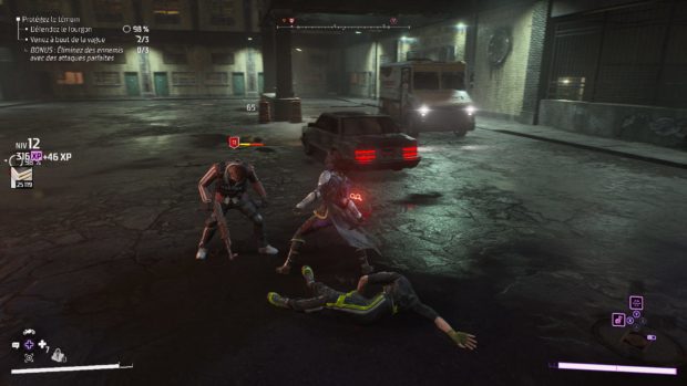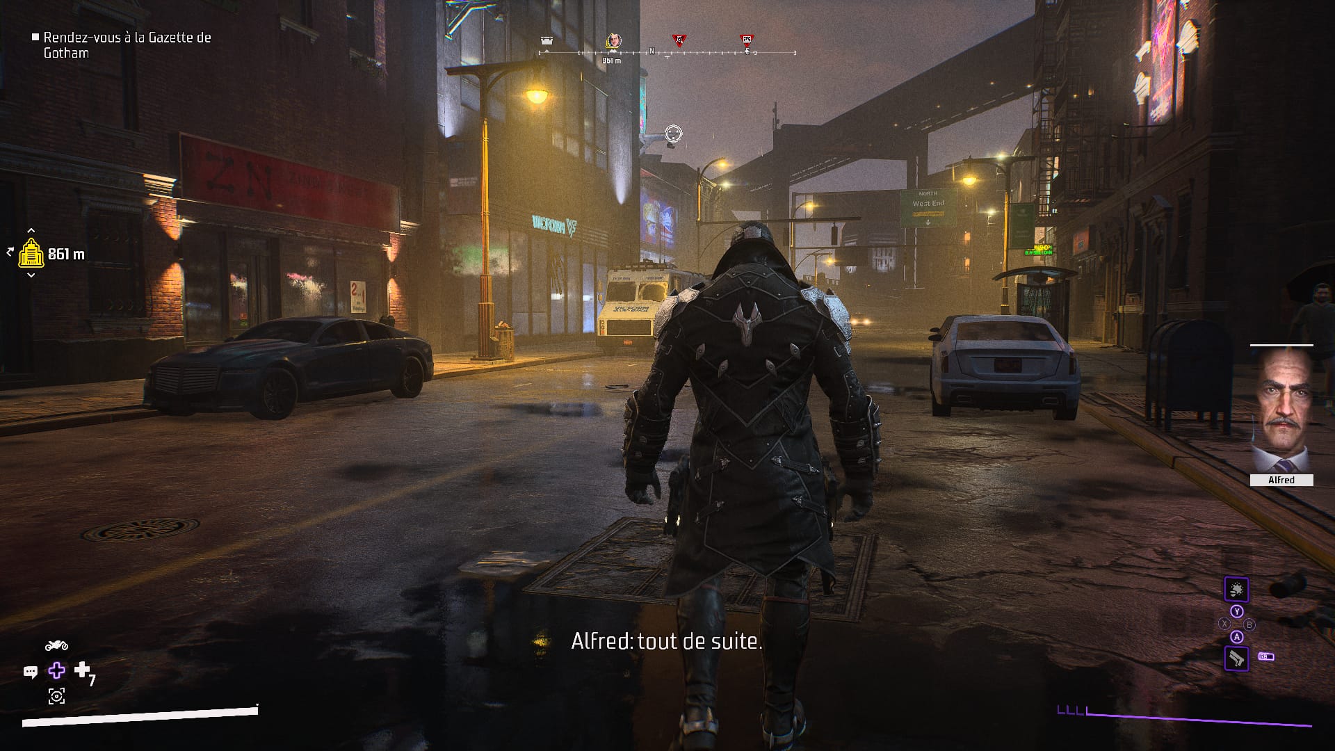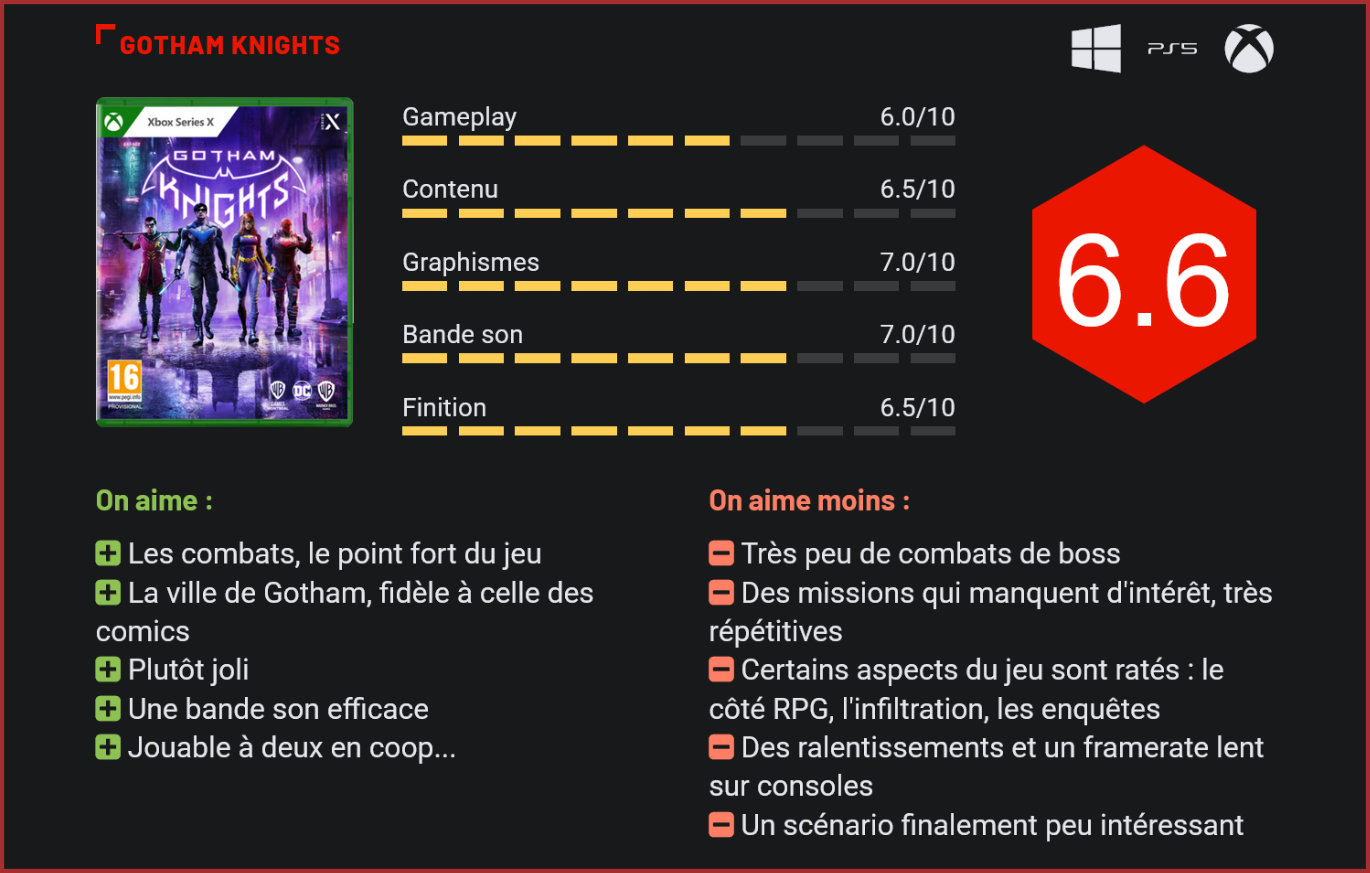 Pas de nouveau Batman cette année, mais un spin-off de la franchise centré sur quatre personnages secondaires : Robin, Batwoman, Red Wood et Nightwing. Warner Bros tente une formule sensiblement différente pour séduire les fans du chevalier noir. Si on aurait pu s’attendre à voir débarquer une suite à l’excellent Arkham Knight, Warner Bros a choisi de repartir d’une feuille blanche sur la nouvelle génération de consoles en proposant un spin-off de l’univers de Batman centré sur quatre personnages secondaires. S’il prend donc place dans le même univers que Batman, Gotham Knights n’a rien à voir avec le précédent volet de la franchise. La ville de Gotham est joliment représentée. Niveau scénario, le jeu n’est d’ailleurs aucunement lié aux précédents jeux Batman. L’histoire débute avec la mort du justicier masqué. La ville de Gotham est plongée dans le chaos et un groupe de quatre justiciers émerge pour tenter de maintenir l’ordre. Le concept est séduisant sur le papier, d’autant plus que le jeu s’inscrit dans l’un des arcs préférés des fans : la Cour des Hiboux. L’ennui, c’est que si les premières minutes nous captivent, le cocktail a beaucoup de mal à prendre sur la durée, la faute à des dialogues souvent assez creux, un casting pas très sexy, un character design assez pauvre et un scénario qui ne décolle jamais. Le jeu s’inspire du scénario de La Cour des Hiboux. Côté gameplay, Gotham Knights prend également ses distances avec ses ancêtres. La formule est complètement changée. Exit le mélange d’exploration / affrontements / combats de boss et défis du précédent volet. WB Games Montreal a opté pour une formule plus originale en intégrant des séquences d’enquête, d’infiltration, de craft et quelques éléments empruntés aux RPG. Les combats restent au cœur de l’aventure, et ils sont globalement plutôt bien maîtrisés. Le jeu sait même se révéler assez technique. Le vrai plus de cet épisode, c’est qu’on incarne non pas un mais quatre personnages différents. On peut passer d’un à l’autre entre chaque mission, au Q.G., et il faut bien l’avouer, pad en main, chaque protagoniste se joue très différemment. Nightwing est capable d’affronter ses adversaires à bonne distance avec son bâton extensible. Red Hood est le personnage le plus bourrin, mais aussi le mieux équipé pour les combats à longue distance avec ses deux révolvers. Batwoman propose un style de jeu très proche de celui de Batman, avec des combats au corps à corps extrêmement rapides. Robin, enfin, propose un style de jeu plus proche de Batwoman, tout en ayant un énorme défaut : la lenteur de ses déplacements. Autre grande qualité du jeu : il a été pensé pour être joué à deux en coopératif, en ligne. L’idée est bonne même si dans la pratique on reprochera au jeu le fait que l’invité ne progresse pas sur sa propre partie et qu’en cas de différence de niveau, l’un des deux joueurs est lésé dans le gain d’expérience… Les combats sont très nerveux. On le sent, WB Montréal a eu beaucoup de mal à donner une direction à son jeu. Le jeu hérite de quelques idées inspirées par des jeux live-services comme Avengers, avec un système d’expérience à acquérir qui permet de gagner des niveaux. En gros, un système qui vous force à faire des missions secondaires pour pouvoir avancer dans la trame principale, sans quoi vos ennemis seront beaucoup plus puissants que vous. Dans le même ordre d’idée, il faudra looter pour récupérer des ressources qui vous serviront à améliorer son équipement et donc ses performances. Un concept qui s’intègre assez mal dans l’univers de Batman… Qu’est-ce que des éléments propres aux RPG avaient à faire dans un jeu d’action / infiltration? Les phases d’enquête cassent complètement le rythme du jeu. Même son de cloche pour les phases d’enquête, qui sont étonnamment nombreuses et qui consistent à mettre en relation différents éléments dans un ensemble d’éléments, pour résoudre un crime. Celles-ci sont non seulement extrêmement faciles à résoudre, mais elles n’apportent de plus strictement rien de neuf au gameplay et cassent continuellement le rythme de l’aventure. Les séquences d’infiltration sont également ratées, la faute à une prise en main qui a tendance à être beaucoup trop pataude pour ce style de jeu, à une IA catastrophique et à un level-design bien plus pauvre que dans les précédents jeux. Vous l’aurez compris, seule la partie action et open-world fonctionne réellement. A ce sujet, là aussi on est toutefois déçu par les missions, qui sont non seulement très répétitives mais manquent également d’enjeux, et sont dans certains cas complètement ratées. L’absence de boss se fait également cruellement ressentir. Il s’agissait de l’un des points forts des jeux Batman. Il y en a, mais une poignée seulement, et les affrontements ne sont pas forcément passionnants. Votre moto vous permettra de vous déplacer en ville. Vous l’aurez compris, Batman Knights est un bon beat them all, qui est malheureusement noyé par une multitude de séquences de jeu peu inspirées. Ne soyez pas surpris, le jeu n’est pas signé Rocksteady mais WB Montréal, le studio responsable du “pire” Batman, Arkham Origins. Le studio répète d’ailleurs les mêmes erreurs qu’à l’époque en tentant à tout prix de se démarquer des jeux de RockSteady et en essayant d’intégrer une dose de superflu à un concept pourtant très efficace. Reste, heureusement, un open-world séduisant et fidèle à celui de Batman, des tas de petits crimes à résoudre dans les rues de Gotham, des graphismes globalement plutôt jolis, une bande son également soignée et surtout un mode coop assez sympa pour vous tenir scotché à votre pad du début à la fin. En solo, l’aventure est beaucoup plus fade, mais néanmo
