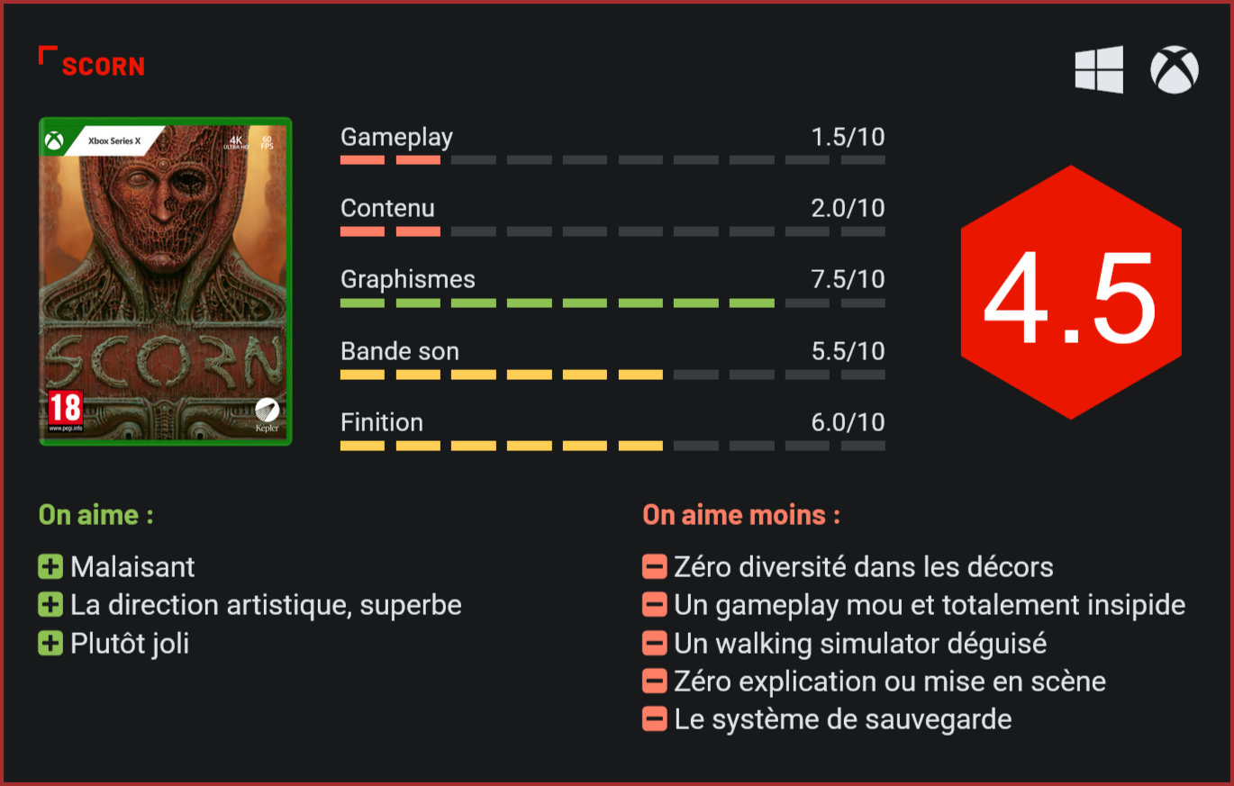 Parmi les exclus Xbox les plus attendues en cette fin d’année, Scorn est un jeu d’horreur indépendant qui a déjà beaucoup fait parler de lui pour son univers glauque. Attendu au tournant, le jeu de Kepler Interactive est toutefois loin de tenir ses promesses. Explications. Né il y a huit ans sur KickStarter, Scorn faisait partie des plus belles arlésiennes du secteur. Développé par une petite équipe de passionnés, le titre sera parvenu à conserver son mystère jusqu’à sa sortie. Et autant dire que la hype était élevée pour ce jeu d’horreur inspiré de l’œuvre de l’artiste Hans Ruedi Giger, le créateur du Xenomorphe d’Alien. Et très clairement, d’un point de vue purement esthétique, Scorn est une petite merveille. La direction artistique du jeu est splendide. Le jeu nous transporte dans un univers où la chaire et la tôle ne font qu’un. Très esthétique, le jeu est un hommage fantastique à l’œuvre de cet artiste. Et très clairement, son univers graphique est son plus gros atout. Bien sûr, encore faut-il se sentir attirer par les univers sales et glauques pour vouloir s’y plonger. Clairement, il ne s’agit pas d’un jeu à mettre entre toutes les mains. Car Scorn est extrêmement gore, sale, sordide, malsain et malaisant. Rien que ça. Assez paradoxalement, et bien qu’il ait été présenté comme un jeu d’horreur, Scorn n’est toutefois pas vraiment un survival-horror. Le jeu se joue en réalité à la première personne, et s’il intègre quelques séquences de shoot, il s’agit principalement d’un jeu d’un walking simulator déguisé, dans lequel vous passerez la plupart de votre temps à errer dans des salles esthétiquement superbes mais totalement vides, sans autre but que de tenter de comprendre ce que vous foutez là. Dès la première minute de jeu, le ton est donné. Pas de cinématique d’intro, pas d’explications sur l’univers, aucun background. Vous retirez votre “cordon ombilical” et partez explorer les ruines de cet univers biomécanique. L’intro donne immédiatement le ton. Pas de mise en scène, il faudra tenter d’interpréter l’histoire. Si l’atmosphère du jeu est angoissante à souhait avec ses décors sombres et labyrinthiques, on se rend très vite compte que Scorn n’est en réalité qu’un simple walking simulator dans lequel on progresse la plupart du temps à tâtons. On ouvre une porte, on découvre un hall gigantesque, on admire chaque détail, puis on essaye de comprendre ce que le jeu attend de nous. Concrètement, il faudra résoudre ici un paquet d’énigmes, sans aucune explication. Elles ne sont pas forcément très compliquées, ni intéressantes d’ailleurs, et servent en définitive juste à rallonger de façon complètement artificielle la durée de vie. Puis, on erre dans des couloirs sans fins, jusqu’à rencontrer finalement un ennemi. Ne vous attendez pas à des séquences de jeu musclées, Scorn est excessivement mou et lent. Vous devrez abattre quelques créatures avec les quelques armes que vous trouverez dans le jeu. Le bestiaire n’a aucune diversité, l’arsenal non plus. Le gameplay étant très lourd, il faut toutefois faire attention en progressant pour éviter d’être surpris par un ennemi, car en cas de mort, il faudra parfois recommencer de larges portions du jeu, la faute à un système de sauvegarde mal fichu. Scorn est très clairement une expérience de jeu très frustrante car visuellement, le jeu est très joli, l’atmosphère est soignée et l’univers séduisant. On sent l’énorme potentiel du jeu. Mais dans la pratique, on s’ennuie ferme, on tourne souvent en rond, on peste contre les commandes et on finit par s’apitoyer sur le sort de cette petite production qui nous rappelle en bien des points un autre jeu maudit, le très médiocre Agony. Les énigmes se ressemblent toutes. Faut-il dès lors passer à côté de ce jeu? Pour la vaste majorité des joueurs, oui certainement. Scorn est une expérience qui n’a d’intérêt que pour son atmosphère et son univers. Seuls les amateurs d’horreur se sentiront attirés par lui. Le jeu a la chance d’être intégré au Gamepass. Car à 39,99€, l’addition est salée pour un jeu au gameplay aussi plat, qui se termine de surcroit en moins de 4 heures en ligne droite. A moins d’être un fan absolu d’Hans Ruedi Giger, fuyez! Conclusion Avec son univers biomécanique sale et glauque, son atmosphère pesante et sa direction artistique inspirée de l’œuvre d’Hans Ruedi Giger, le créateur du Xenomorphe d’Alien, Scorn attire le regard. S’il est visuellement très réussi, le jeu de Kepler Interactive n’est toutefois qu’un walking simulator déguisé, au gameplay très pauvre, qui ne brille ni par ses puzzles répétitifs ni par ses séquences de shoot mollassonnes. Court, fade et même agaçant, le titre a toutefois le mérite d’être intégré à l’offre Gamepass. Une chance, car à 39,99€, il aurait été bien difficile de justifier l’achat de cette jolie démo technique.