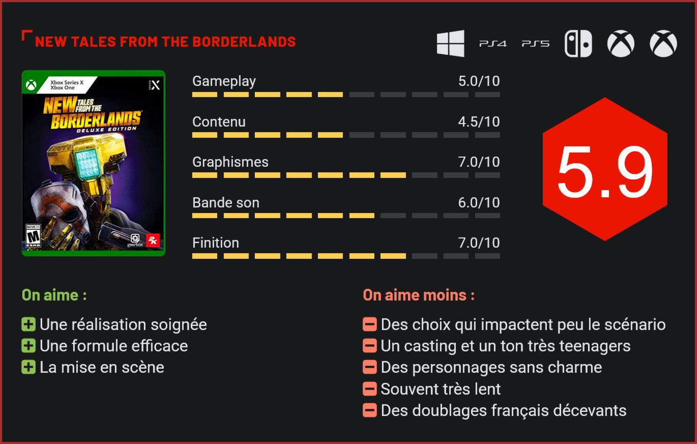 Le premier Tales from the Borderlands s’était imposé comme un spin-off narratif plutôt réussi de Borderlands. Gearbox tente, des années plus tard, de remettre le couvert avec un second volet. Pas sans réaliser quelques grossières erreurs. Si le premier Tales from the Borderlands n’était pas une pépite en soi, le jeu de Telltale Games était parvenu à joliment s’imprégner de l’univers de Borderlands. Des années plus tard, les auteurs de Borderlands tentent de remettre le couvert avec une suite, cette fois développée en interne. Le concept reste le même : il s’agit d’un jeu narratif principalement composé de cut-scenes dans lequel chaque décision du joueur peut impacter le scénario, et découpé en plusieurs chapitres. Le casting du jeu est très jeune. L’aventure prend place dans la ville de Prométhée, une ville bien connue des joueurs de Borderlands. Le joueur va suivre ici les péripéties d’un petit groupe d’aventuriers composé d’Anu, une scientifique trentenaire écologiste et introvertie, Octavio, un ado des rues aussi pénible qu’agaçant, et Fran, la gérante d’un magasin de glaces obsédée par le sexe. Un casting très teenager qui a beaucoup de mal à séduire. Et pour cause puisque ces trois personnages atypiques manquent cruellement de charme. On l’a bien compris, Borderlands joue dans l’humour potache. Certes, mais on aurait tout de même aimé trouver au moins un personnage charismatique dans le lot… Dans la pratique, il va falloir donc supporter tout un tas de blagues potaches pas franchement drôles et qui ne fonctionnent souvent pas trop bien en français, avec les doublages ultra-stéréotypés auxquels on a droit. Le casting ne vend pas vraiment du rêve. Heureusement, quelques personnages secondaires sont là pour remonter le niveau. On ne va toutefois pas vous mentir : si vous n’aimez pas l’humour potache, mieux vaut passer votre chemin, car on parle ici d’un humour très gras. L’écriture n’étant pas franchement extraordinaire, tout un tas de blagues tombent à l’eau. Le récit n’est pas non plus très passionnant, même si de gros efforts ont été consentis pour tenter de nous plonger dans cette histoire, avec une mise en scène assez travaillée. On lui reprochera principalement de ne jamais vraiment parvenir à être pris au sérieux. L’humour potache est omniprésent et lorsqu’il se prend au sérieux, la recette ne fonctionne absolument pas. Visuellement, le jeu est également plutôt réussi, avec ses graphismes en cel-shading fidèles à l’univers de Borderlands. Côté gameplay, pas de grosses surprises non plus. On passe le plus clair de son temps à regarder l’écran, à cliquer sur un bouton pour un QTE, faire un choix narratif et – occasionnellement – on dirige son personnage pour interagir avec les décors et récupérer des crédits. Une recette finalement très proche des bon vieux point & click, qui fonctionne certes, mais ne brille jamais. Il faut dire que depuis quelques années, on a assisté à une véritable déferlante de jeux narratifs. Les personnages secondaires ont souvent plus de charme que les personnages principaux. Les fans de la première heure de Borderlands y trouveront toutefois leur compte. Oui, l’univers est respecté. En revanche, on regrette que la formule des jeux narratifs soit aussi mal appliquée. Les décisions du joueur n’ont que peu d’impact sur l’histoire, le déroulement est souvent le même quel que soit votre choix et les développeurs ont pris quelques gros raccourcis. Des séquences ratées mèneront souvent à la mort et à un retour à la séquence précédente. Ajoutez à cela un rythme parfois très mou et vous comprendrez qu’il est malheureusement difficile de ne pas être déçu par cette suite, qui tout en respectant la formule de son ancêtre, rate le coche au niveau narratif. Dommage car la technique était plutôt réussie et le jeu est assez long pour vous tenir occupé un bon moment. Conclusion Marchant sur les traces de son prédécesseur, New Tales from the Borderlands tente de remettre au goût du jour la formule “Telltale” du jeu narratif. Le titre est toutefois développé cette fois par Gearbox. Et s’il conserve les bases solides de son prédécesseur, en mélangeant QTE, cut-scenes et dialogues, New Tales from the Borderlands rate le coche au niveau narratif, avec des dialogues creux, un casting pauvre et résolument trop teenager, un humour trop potache et surtout, un déroulement qui n’est que très peu impacté par les choix du joueur. S’il reste fidèle à l’univers de Borderlands et est plutôt réussi techniquement, New Tales from the Borderlands est toutefois loin d’égaler l’excellence des productions de Telltale. Et ce, même les fans de Borderlands risquent de s’en rendre compte…