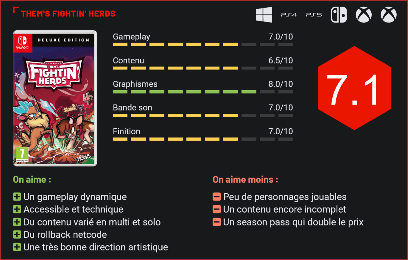 Le 18 octobre dernier marquait l’arrivée de Them’s Fightin’ Herds sur toutes les consoles. Il s’agit là de la version définitive d’un jeu de combat abordable et aux origines intéressantes. Il y a quelques semaines débarquait sur consoles un jeu de combat sorti il y a un petit moment sur PC. Si vous êtes amateurs de dessins animés, le style vous sera peut-être familier puisque ce jeu était à la base un tout autre projet. Il y a plus de dix ans, une petite équipe nommée Mane6 s’est lancée dans la création d’un jeu de combat non-officiel basé sur la série “My Little Pony: Friendship is Magic”. Les ayants droits n’ont pas trop apprécié la démarche, Mane6 a décidé de réutiliser leurs idées pour faire un jeu original qui reste un peu inspiré par la licence de Hasbro. Un crowdfunding a permis à l’équipe de financer le projet qui deviendra le sujet du jour : Them’s Fightin’ Herds. Le style visuel du jeu est une réussite. Il s’agit donc d’un jeu de versus en 2D dans lequel on pourra contrôler sept personnages différents. Ceux-ci sont tous des animaux aux capacités uniques. Le titre va proposer un gameplay plutôt classique pour le genre tout en simplifiant un petit peu les choses. Nous retrouvons les coups spéciaux à effectuer avec des quarts de cercles et autres manipulations, nous pouvons attaquer avec trois boutons donnant respectivement des coups faibles, moyens et forts, tandis qu’un autre bouton nous permettra d’utiliser une attaque spéciale propre à notre personnage qui pourra remplir sa jauge de magie. Celle-ci peut ensuite être utilisée pour réaliser des coups spéciaux encore plus forts, et nous possédons également d’autres jauges à dépenser dans des super attaques. Malgré quelques simplifications quand on compare à d’autres jeux de versus, Them’s Fightin’ Herds garde une certaine complexité et un dynamisme très plaisant. Comme on dit : “facile à apprendre, difficile à maîtriser”, le gameplay du titre propose de nombreuses options et possibilités de combos qui en font un système de combat complet et dynamique. De plus, ce dernier se montre accessible grâce à de nombreux tutoriels nous apprenant les bases des mécaniques habituelles des jeux de versus fighting, ainsi que des apprentissages propres à chaque combattant. Dommage cependant que le jeu ne propose que sept personnages jouables, le casting peut vite devenir redondant. Le mode scénario propose une esthétique totalement différente. Côté contenu, le jeu propose son lot d’activités variées. Le traditionnel mode arcade permet de s’échauffer avant de passer sur l’incontournable mode en ligne permettant d’affronter les joueuses et joueurs du monde entier. Un mode qui propose du rollback netcode pour permettre d’offrir une expérience satisfaisante, même à ceux qui possèdent une connexion internet qui laisse à désirer. Them’s Fightin’ Herds propose tout de même un gros mode de jeu en solo, un mode scénario racontant l’histoire des personnages jouables, qui est à ce jour incomplet, mais dont de nouveaux chapitres devraient être proposés dans le futur. Les animaux vivent en société dans un monde où les carnivores ont été scellés dans un monde différent, du moins jusqu’à récemment puisque certains ont été aperçus. Les personnages principaux sont alors choisis pour retrouver les clés du sceau qui pourrait permettre d’empêcher les prédateurs de revenir. Ce mode scénario se présente alors comme un petit RPG à l’ancienne, avec des environnements à explorer, des coffres à trouver qui renferment des pièces d’équipements cosmétiques, des ennemis visibles dans les zones qui lancent des combats si on entre en contact avec eux, et même des boss au challenge relevé. Le mélange fonctionne bien et offre une histoire plus complète qu’il n’y paraît, ce scénario a été réalisé par plusieurs personnes dont Lauren Faust, la créatrice de la série My Little Pony qui a inspiré le jeu. Cette ressemblance avec les RPG old-school se retrouve aussi dans les lobbys en ligne du jeu. Ceux-ci permettent de prendre part à quelques activités et, bien sûr, de trouver d’autres joueurs pour les affronter. Chaque personnage possède son propre style de jeu. Le titre se révèle aussi très fidèle à ses origines dans son aspect visuel. La direction artistique très colorée s’inspire évidemment de l’univers de Hasbro, et propose quelque chose de très efficace. Les personnages sont bien animés, emplis de personnalité et très expressifs, sans parler du doublage en anglais qui leur donne encore plus de vie. Le mode scénario propose des visuels en pixel art efficaces sans pour autant être impressionnants. Côté bande-son, on retrouve des morceaux très sympathiques et qui s’adaptent aux différentes situations. Le titre propose un univers vraiment charmant et une technique sans faille. Si son casting de personnages jouables reste un peu petit, le titre propose tout de même ce mode scénario incomplet, mais plutôt ambitieux pour un jeu du genre. Grâce à ce mode, à son gameplay intéressant et son mode en ligne, le jeu offre de quoi bien rentabiliser les 20€ demandés. Un season pass est également proposé à l’achat pour le même prix. Ce dernier propose divers bonus et quatre nouveaux personnages jouables qui arriveront dans le futur. Le titre devrait se bonifier avec le temps, mais propose déjà un bon jeu de combat pour tous les amateurs du genre. Conclusion Them’s Fightin’ Herds est un jeu de combat qui devait être, à l’origine, un jeu amateur basé sur la série animée “My Little Pony: Friendship is Magic”. Une initiative que Hasbro, l’ayant droit de la licence, ne voyait pas d’un très bon œil. L’équipe Mane6 a alors revu sa copie pour proposer, à la place, un jeu original fortement inspiré de la licence. Ses inspirations se ressentent surtout