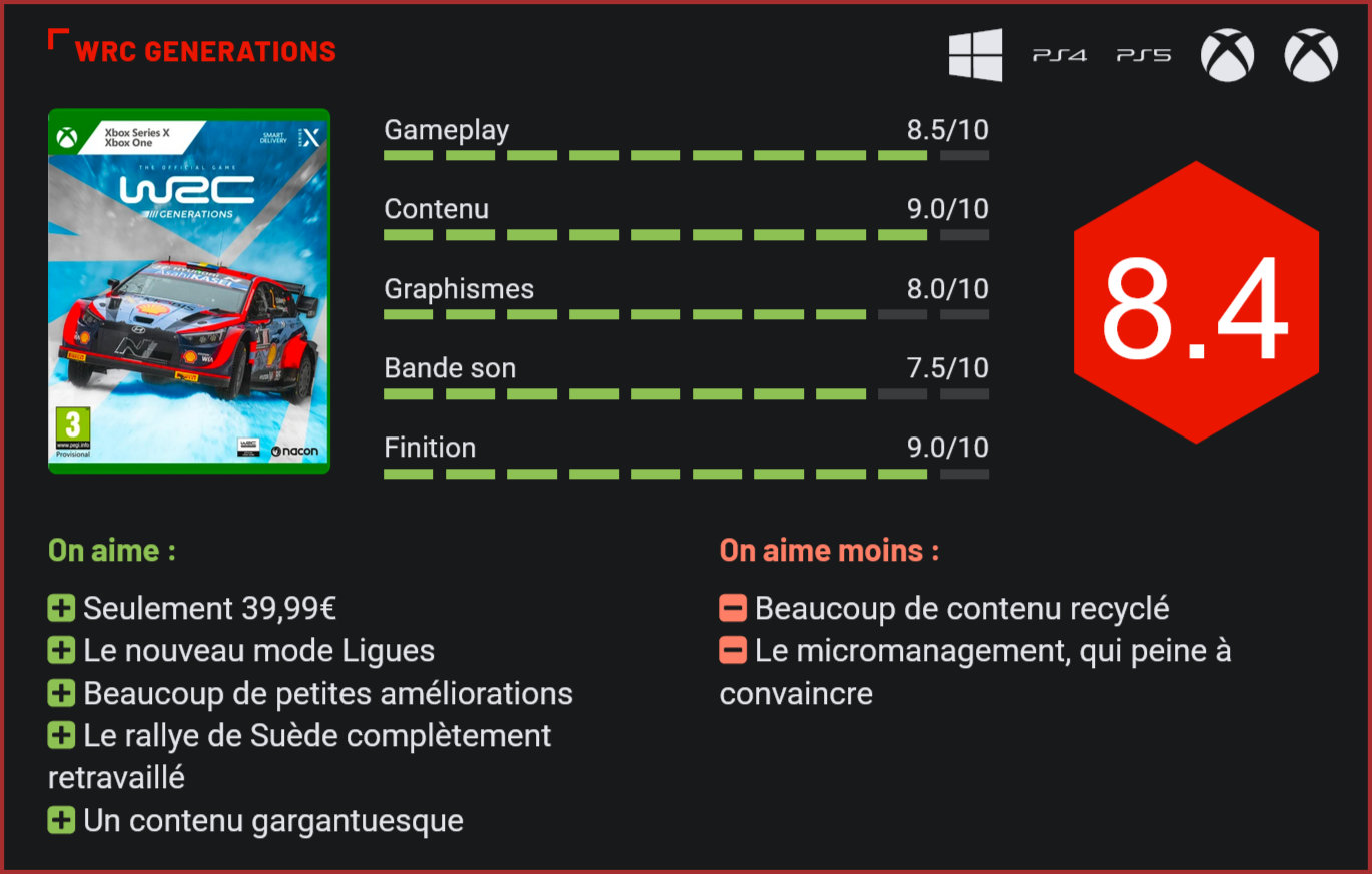 En 2023, la licence WRC passera entre les mains de Codemasters et EA Games. Aux commandes de la série depuis des années, le studio Kylotonn nous offre un dernier tour de piste avec WRC Generations. Le parcours de la série des WRC aura décidément été tumultueux. Les vieux de la vieille s’en souviennent, la série était à l’époque de la PS2 exclusive à la console de Sony. L’éditeur nippon a livré plusieurs simulations de rallye avant de raccrocher. Ensuite, un petit studio italien, Milestone, a récupéré la licence et développé pas moins de cinq volets. Le premier épisode n’avait guère convaincu les joueurs. Avec les années toutefois, le studio est parvenu à améliorer sa recette. Puis, la licence a de nouveau changé de mains et est passée chez Nacon et son studio KT Racing. Après des débuts désastreux, le studio français a rapidement changé de cap et complètement revu le mode carrière. Il aura fallu des années avant que la licence ne prenne réellement son envol. Le dernier épisode en date, WRC 10, était à ce titre et de très loin le plus réussi de la licence. Les courses de nuit sont toujours au programme, et toujours aussi stressantes. En 2023, la licence changera à nouveau de mains. Codemasters et Electronic Arts tenteront de proposer une nouvelle expérience de jeu pour les passionnés de sport automobile. Pour cette raison, Nacon et KT Racing se sont contentés d’un épisode best-of, qui abandonne d’ailleurs la numérotation habituelle, WRC Generations. De facto, il ne faudra pas s’attendre à d’énormes nouveautés avec ce volet, vendu d’ailleurs 39,99€. Le mode Carrière est très similaire à celui de WRC 10. Les joueurs qui avaient parcouru les épisodes 9 et 10 ne seront pas déboussolés et constateront même assez vite qu’une grosse partie du contenu est du contenu recyclé. Les courses historiques sont toujours au programme. Clairement, WRC Generations est un épisode qui se destine aux joueurs qui avaient sauté le dixième volet – le meilleur de la franchise. Son plus gros atout? Il se destine tant aux passionnés de sport automobile à la recherche d’une simu que des amateurs de jeux de course arcade. Car ici, on peut non seulement régler la difficulté selon ses envies, mais personnaliser aussi la conduite en activant et désactivant aides à la conduite, dégâts et abandons. Bref, une expérience de jeu sur mesure. Si Generations n’introduit pas de nouveautés majeures, cela ne veut pas dire pour autant que le titre ne propose pas un tas de plus petites nouveautés. On le sent, KT Racing a encore amélioré l’expérience de conduite en retravaillant la physique des véhicules et des collisions. Le studio introduit également une nouvelle classe de véhicules hybrides, qui n’apportent en soi pas de véritable révolution, mais qui ont le mérite d’être présents. Côté contenu, pas de nouveaux rallyes à l’horizon mais un rallye de Suède entièrement repensé avec six spéciales inédites. Et le résultat est franchement impressionnant, visuellement aussi puisque de nombreux éléments des décors et effets visuels ont été retravaillés. On pense notamment aux tas de neige sur le bord de la route, beaucoup plus réalistes que dans le précédent volet. Des retouches qui font toute la différence. Certains épisodes ont été totalement retravaillés, à l’image du rallye de Suède. Les plus grosses nouveautés concernent toutefois le multijoueur, avec le nouveau mode Ligues qui permet d’enfin affronter des adversaires du même niveau que vous. Pour les passionnés, il y a de quoi faire car il faudra ici décrocher un max de points durant les onze semaines sur lesquelles s’étendent les événements. Les développeurs ont également ajouté quelques petites nouveautés comme la possibilité de partager des livrées et stickers avec les autres joueurs de la communauté. Du tout bon aussi au niveau du mode solo, qui permet désormais de démarrer en WRC 3 ou en WRC 2, avant de passer au championnat WRC. Les deux premières compétitions se bouclent très rapidement. Seul le championnat WRC propose de parcourir toutes les étapes. Comme auparavant le mode Carrière est ultra-costaud avec 165 spéciales au programme des festivités – soit 750 kilomètres de route dans 22 pays -, 49 équipes “officielles” et un tas d’épreuves optionnelles comme des courses dans des conditions extrêmes ou des courses historiques qui vous mettront au volant de véhicules d’anthologie. Bref, c’est costaud, surtout qu’il faudra non seulement concourir mais aussi s’occuper de la gestion de l’équipe : le choix des événements dans l’agenda, le déblocage d’améliorations avec l’XP gagnée, la gestion du budget, le recrutement d’experts qui permettront d’améliorer le fonctionnement de l’équipe, etc. etc. La partie micromanagement n’a que peu d’impact sur vos performances, mais cela reste amusant. Cette fois, la finition est irréprochable, pas de pop-up à l’horizon. Vous l’aurez compris, WRC Generations n’est pas un véritable nouveau volet mais une sorte de best-of de la série. Le contenu du jeu est gargantuesque, la finition est, cette fois, irréprochable et les développeurs ont mis les petits plats dans les grandes pour finir leur tour de piste avec quelques petites améliorations. Visuellement, le jeu se défend également plutôt bien. Il faut toutefois garder à l’esprit qu’on est sur un épisode cross-gen qui ne tire pas encore parti des capacités des consoles next-gen. C’est à priori le même moteur que WRC 10, mais les développeurs ont amélioré pas mal d’éléments graphiques et surtout optimisé l’affichage. Plus d’éléments du décor qui “poppent” à l’horizon donc. On dénombre plus de 150 tracés! En définitive, à qui se destine cet épisode? Tout d’abord, aux fans purs et durs de la licence, qui auront de quoi s’amuser avec 