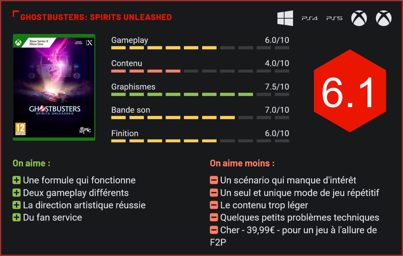 La licence cinématographique SOS Fantômes est de nouveau adaptée dans un format jeux vidéo. C’est cette fois une aventure pensée pour le multijoueur qui est proposée, une expérience proche de ce qu’ont pu offrir les jeux asymétriques tels que Dead by Daylight ou encore Friday the 13th: The Game. On ne présente plus la franchise cinématographique qu’est SOS Fantômes. Nous sommes aujourd’hui plutôt habitués à voir débarquer des adaptations mettant en scène l’équipe des Ghostbusters en jeux vidéo. Ceux-ci débarquent cette fois dans un format qui rencontre un petit succès depuis quelques années. Après Dead by Daylight, Friday the 13th: The Game ou encore le récent Dragon Ball: The Breakers, c’est au tour de SOS Fantômes de proposer un jeu en multijoueur asymétrique. Une idée qui colle bien avec le concept des films, mettant en scène plusieurs chasseurs face à des fantômes. Le titre est d’ailleurs édité et développé par IllFonic, une équipe qui a déjà de l’expérience dans l’élaboration de ce genre de jeux. La vue à la première personne permet un peu d’immersion. Ghostbusters: Spirits Unleashed nous glisse dans la peau d’un personnage original et entièrement customisable qui va rejoindre l’équipe des chasseurs de fantômes en tant que nouvelle recrue. Nous avons l’occasion de rencontrer quelques personnages des films et un court scénario peu intéressant est proposé pour commencer le jeu. Il est alors possible de visiter librement la caserne pour nous préparer à partir en mission avec d’autres personnes. Le cœur du jeu se situe évidemment dans son gameplay. Comme dans les autres jeux du genre, le titre va confronter plusieurs personnes, quatre en l’occurrence, face à un seul ennemi. Les deux camps possèdent des capacités différentes, la personne étant seule ayant un certain avantage. Ici, l’objectif des chasseurs sera évidemment de capturer le fantôme en liberté, et celui du fantôme sera de hanter assez longtemps le bâtiment dans lequel prend place la partie. Les chasseurs ont à leur disposition le psychotensiomètre permettant de détecter les anomalies, le lanceur de particule qui peut attirer le fantôme, et finalement un piège qui permet de le capturer. Le but va alors être de réaliser quelques objectifs, dont le plus important est de retrouver le fantôme et de l’attirer vers le piège grâce à ces outils, tout ça sans causer trop de dommages dans les environs. Les fantômes ne sont pas toujours évidents à attraper. De son côté, le fantôme pourra voler et se déplacer librement dans la zone, et devra effectuer différentes actions pour gagner la partie. Effrayer des innocents qui se trouvent dans les environs, attaquer les chasseurs ou encore prendre possession d’objets pour ne pas se faire repérer. Il existe plusieurs types de fantômes aux capacités distinctes qu’il sera possible d’incarner une fois débloqués. Force est de constater que la formule est réussie. Ghostbusters: Spirits Unleashed propose un gameplay agréable, en particulier lorsqu’on incarne le fantôme qui nous offre une totale liberté. Dans l’autre camp, il est préférable de privilégier les parties entre amis, puisqu’il sera bien plus efficace de communiquer, sans quoi le fantôme aura un avantage démesuré. Il est cependant dommage de voir qu’il s’agit là du seul et unique mode de jeu qu’il faudra répéter ad nauseam pour débloquer quelques récompenses, telles que des améliorations pour notre équipement, des nouveaux fantômes à contrôler et des options cosmétiques pour notre personnage. Un contenu assez léger pour un jeu proposé à un prix variant entre 30 et 40 euros dépendant de la plate-forme, l’addition est plutôt salée. Les personnages non-joueurs peuvent être calmés avec une petite discussion. Le titre est tout de même plutôt convaincant visuellement, adoptant un style un peu cartoon pour représenter ses personnages. Les différentes zones où se déroulent les parties sont aussi très bien réalisées, même s’il faut souligner que l’on rencontre parfois quelques petits problèmes techniques et visuels. Les musiques sont aussi réussies, elles donnent une ambiance un peu mystérieuse et très légèrement effrayante. S’il est plutôt réussi, Spirits Unleashed possède tout de même de sacrés défauts qui le rendent difficile à recommander pour son prix de base. L’expérience vaut définitivement le coup à plusieurs mais il se montre très avare en contenu, et très vite répétitif. Il a tout de même le bon goût de proposer plusieurs options d’accessibilité ainsi qu’un peu de fan service pour les amoureux de la licence. Conclusion La licence SOS Fantômes a déjà maintes fois été déclinée en jeux vidéo. C’est cette fois le studio IllFonic, déjà responsable de l’adaptation de Vendredi 13 en jeu, de s’attaquer à l’adaptation de ces succès cinématographiques. Leur expérience passée a été un atout dans la conception de ce Ghostbusters: Spirits Unleashed puisqu’il s’agit également d’un jeu multijoueur asymétrique. Ce nouveau titre propose des parties en quatre contre un, quatre chasseurs contre un seul fantôme. Dans la peau des chasseurs, nous devrons utiliser les outils iconiques des films pour trouver et capturer le fantôme. Du côté de ce dernier, il devra se défendre, faire peur aux personnages non-joueurs ou encore se cacher en prenant possession d’objets. La formule fonctionne bien, mais se révèle très vite répétitive puisqu’il s’agit du seul et unique mode de jeu, et ce dernier ne se renouvelle pas assez. Son maigre contenu et son scénario court et simpliste donne peu de raison de débourser presque 40 euros dans le titre, qui a, on ne va pas vous mentir, l’allure d’un free-to-play. Des petits soucis techniques apparaissent parfois, mais sont rattrapés par la direction artistique très effica