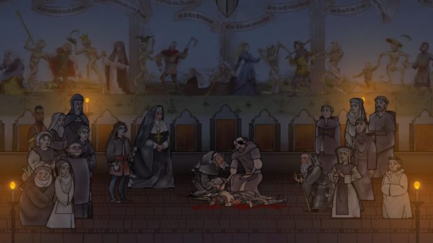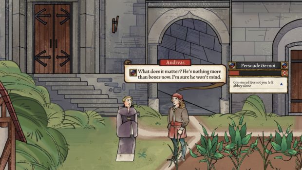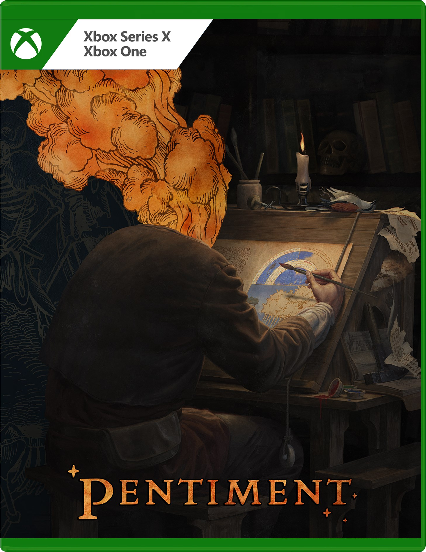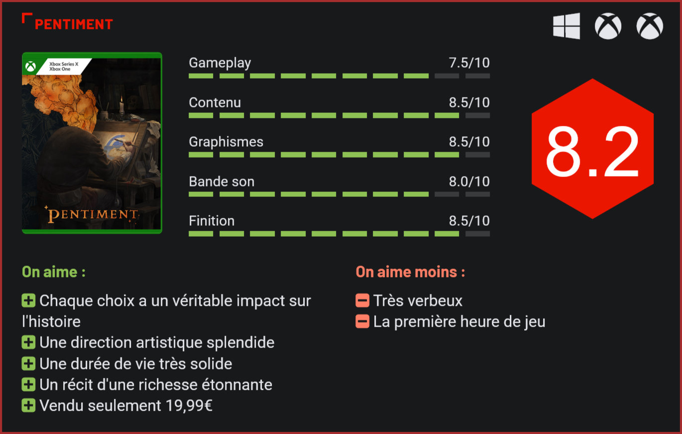 Après The Outer Worlds et Grounded, le studio Obsidian nous livre sa dernière création : un curieux jeu narratif qui mélange enquête criminelle et exploration, en pleine Renaissance. Le studio Obsidian multiplie les succès depuis quelques années. Après l’excellent Pillars of Eternity 2, il nous avait livré un très séduisant The Outer Worlds. Le studio californien a changé de stratégie depuis en divisant ses équipes. Bien qu’il ne compte que 200 employés, Obsidian est capable de développer aujourd’hui quatre jeux en simultané. En 2022, il est ainsi parvenu à nous livrer deux titres. Grounded, incontestablement l’un des meilleurs jeux coop de la décennie, et Pentiment, un curieux jeu à l’allure de petit titre indé qui parvient à agréablement nous surprendre… La direction artistique du jeu est impeccable. Parmi les quatre projets en développement cette année chez Obsidian (The Outer Worlds 2, Avowed, Grounded et Pentiment), Pentiment était sans l’ombre d’un doute le plus petit de la bande. Il n’a jamais été question de livrer un titre triple-A et le prix du jeu en témoigne d’ailleurs puisque Pentiment est vendu 19,99€ – et est bien entendu intégré au Gamepass. Le jeu est en lui-même une curiosité. Tout d’abord, parce qu’il mélange plusieurs genres : enquête criminelle, jeu narratif et point & click – même si les mécanismes diffèrent sensiblement, puisqu’on contrôle ici directement le personnage. Ensuite, parce que le jeu prend place dans un contexte assez particulier. Pentiment nous plonge en pleine Renaissance, dans l’abbaye bénédictine de Keirsau, en Allemagne. Les développeurs du jeu ont choisi de nous immerger dans cet univers avec des musiques médiévales et une direction artistique unique, qui s’inspire des ouvrages liturgiques du 16ème siècle. Esthétiquement, il en résulte un titre étonnant. La direction artistique du titre est absolument superbe et si le style ne plaira pas à tous les joueurs, Pentiment est incontestablement une immense réussite artistique. L’histoire démarre avec un meurtre… Niveau scénario, Obsidian frappe fort également. L’intrigue prend place au cœur d’une abbaye bénédictine, où un noble vient d’être assassiné. Dans la peau d’Andreas Maler, un jeune artiste qui travaille sur un ouvrage liturgique, il faudra tenter de résoudre ce crime en dialoguant avec tous les résidents de l’abbaye et du village voisin. S’il commence très lentement, avec une introduction d’une grosse heure de jeu pas franchement captivante, le scénario décolle assez rapidement. Verbeux, le jeu encourage à entamer des dialogues avec tous les personnages que l’on croise. Les dialogues sont bien écrits mais il faudra se montrer patient pour avancer dans l’intrigue. L’histoire du jeu a d’ailleurs tendance à s’étirer des heures durant. Assez pour poser des fondations solides et s’attacher à certains personnages. Les thèmes traités sont variés : de la position de la femme dans la société à la toute puissance de l’Eglise, les valeurs de la société,… Le jeu parvient à agréablement nous surprendre en peignant un portrait au vitriol d’une société ultra-catholique dans laquelle le moindre mot de travers peut vous coûter très cher. D’ailleurs, on apprendra vite à maîtriser ses propos. Car dans Pentiment, chaque choix de dialogue a un impact sur la trame narrative. Et pas des moindres puisque vos décisions feront de certains personnages vos alliés et d’autres personnages vos ennemis. Très souvent, il est d’ailleurs impossible de deviner l’impact que le choix d’un dialogue aura sur l’intrigue dans la mesure où on ne connait pas l’importance que chaque personnage prendra dans l’histoire… Chaque décision aura un impact sur l’intrigue… L’univers de Pentiment surprend par sa richesse, l’immensité de son casting et la longévité de son scénario, qui s’étend sur plusieurs années (et pourra vous tenir en haleine jusqu’à 20 heures de jeu, si vous prenez votre temps). Pentiment lorgne également doucement du côté des RPG avec quelques choix de classes à réaliser en début de partie. Des choix qui définiront vos connaissances – utiles lors des conversations – et vos capacités par exemple à convaincre un PNJ avec des arguments solides. Le système est brillamment intégré dans le jeu, puisqu’il définit le résultat d’une multitude de quêtes secondaires qui vous faire avancer progressivement la quête principale. A ce sujet, on notera que de nombreux quêtes entrent en contradiction les unes avec les autres, et qu’il faudra souvent faire un choix également au niveau de la temporalité, en choisissant de consacrer son temps à une quête plutôt qu’à l’autre. Autre agréable surprise : vous ne saurez jamais qui est le véritable meurtrier. Vous êtes dans Pentiment LE juge. Vous vous ferez votre propre avis et déciderez ensuite qui est le coupable. La rejouabilité du titre est forcément excellente. Et puis bien sûr il y a les nombreux petits à-côtés, comme quelques mini-jeux et collectibles, que vous pourrez collecter en cours de partie. Rien de vraiment révolutionnaire en soi, mais on le sent, Pentiment a eu droit à de nombreuses attentions. La finition du titre est d’ailleurs irréprochable. Lors de notre walkthrough, nous n’avons pas rencontré un seul bug ni été bloqués par des choix narratifs. Le jeu est jouable en français et en anglais. En définitive, difficile de ne pas être séduit par ce jeu atypique, qui ne plaira certes pas à tous les joueurs, mais qui a le mérite d’oser proposer quelque chose de différent, tant artistiquement qu’au niveau de son gameplay, avec son monde ouvert dans lequel on évolue librement, on dialogue avec les nombreux PNJ, on vaque à ses occupations en prenant soin de respecter scrupuleusement l’horaire qui nous est imposé et dans leque