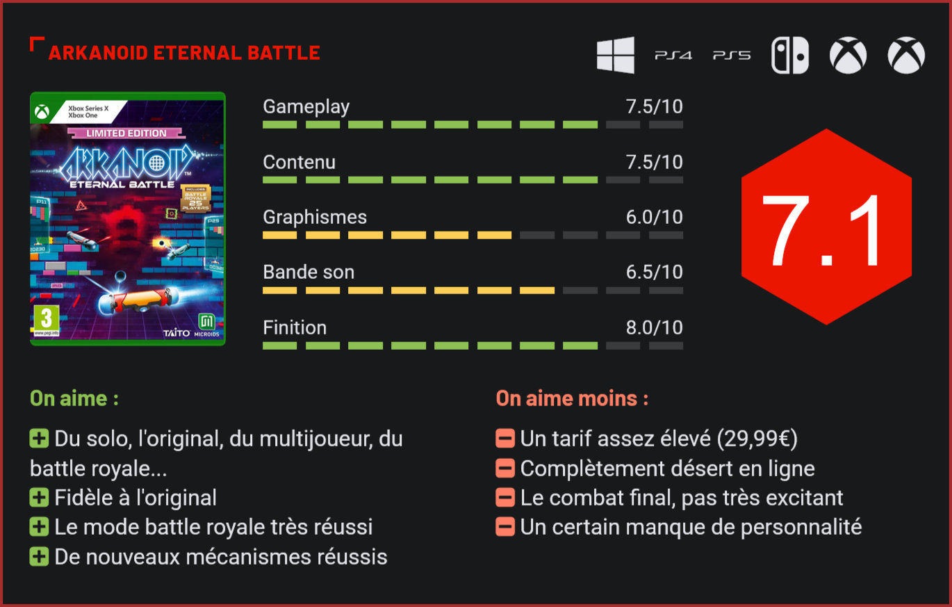 L’éditeur français Microids ressuscite un classique de l’arcade avec Arkanoid Eternal Battle. Sorti en 1986, ce classique de Taito avait marqué une génération complète de joueurs. On ne s’y attendait pas vraiment. L’éditeur français Microids a pourtant signé une collaboration inattendue pour revivre les classiques de l’éditeur nippon Taito. Arkanoid: Eternal Battle resuscite une licence qu’on avait plus vue sur nos écrans depuis plus d’une décennie. Et le moins que l’on puisse dire, c’est que le petit studio français qui a travaillé sur ce projet nous livre un revival très réussi. Garder la première place ne sera pas toujours évident… Avant d’aller plus loin, il convient toutefois de faire un peu le point sur ce reboot. Pastagames a en effet choisi de rester fidèle à l’œuvre originale tout en apportant quelques petites nouveautés au gameplay avec l’intégration de malus que vous pourrez jeter sur vos concurrents. Car l’épine dorsale de ce nouveau volet, c’est son mode battle royale qui se joue à vingt-cinq joueurs. Le concept reste le même : détruire des murs de briques en renvoyant une ou plusieurs boules qui rebondissent sur l’écran et tenter de finir son tableau le plus vite possible sans laisser retomber la boule tout en bas de l’écran. Arkanoid, c’est la genèse des “brick breakers”. L’originalité, ici, c’est qu’on affronte vingt-cinq autres joueurs, qui complètent des tableaux en parallèle. Chacun tente d’emmagasiner un maximum de points. Toutes les x secondes, le joueur qui a le moins de point à son actif est éliminé, jusqu’à ce qu’il n’en reste que quatre. En récupérant divers power-ups, le joueur peut lancer des malus à la figure de ses opposants, par exemple rendre leur palette plus petite ou troubler leur champ de vision. Il doit choisir qui est sa cible, le joueur qui a plus de points que lui ou moins. Tout cela ajoute donc une petite composante stratégique. On retrouve 4 modes de jeu. Et dans la pratique, la formule s’avère rudement efficace, même si comme souvent avec ce type de jeu, votre succès reposera souvent davantage sur la chance que de véritables compétences. Se contenter simplement de renvoyer la boule est souvent la meilleure stratégie, car à chaque fois que celle-ci reviendra en bas de l’écran, vous perdrez des points et chuterez dans le classement. Le vainqueur est défini à la fin, lors d’une confrontation contre un “boss”, durant laquelle il faudra tenter de nouveaux d’emmagasiner un max de points lors de “playoffs”. Ca fonctionne, mais ce n’est pas franchement la partie la plus excitante du défi. Si le mode battle royale fonctionne à merveille, on regrette en revanche que le jeu en ligne soit complètement déserté. Il faudra la plupart du temps affronter 23 à 24 adversaires gérés par l’IA… Celle-ci reste efficace, mais cela reste regrettable. Clairement, le jeu aurait remporté un plus gros succès au format free-to-play. La bonne nouvelle, c’est que son modèle payant a permis de livrer un jeu “premium” avec quantité de contenus, dont un nouveau mode solo, un mode compétitif en local et l’intégration du jeu original. Bref, le contenu est plutôt généreux. Cela ne nous empêche pas de regretter une tarification qui nous parait un poil excessive : 29,99€ tout de même. Le combat final sert à départager les joueurs. Arkanoid: Eternal Battle est une excellente surprise. Le jeu est fun à parcourir, le mode battle royale est une franche réussite et le contenu est généreux. Il lui manque malheureusement une communauté. Ce n’est toutefois pas faute d’effort puisque le jeu est compatible cross-play… Mais la tarification de 29,99€ risque de lui porter fortement préjudice. Car dans la pratique, même si l’IA s’en sort très bien, on regrette de n’affronter un humain que de façon occasionnelle. Côté technique, le jeu se défend sans toutefois impressionner. Les développeurs sont parvenus à rester fidèle à la licence tout en la modernisant. Les visuels sont colorés, les musiques d’accompagnement énergiques, le tout fonctionne, mais le jeu manque quelque peu de personnalité. Que les fans de la licence se rassurent, c’était probablement le plus joli cadeau que l’éditeur Microids pouvait leur livrer. Conclusion Marchant sur les traces d’un Tetris 99, Arkanoid: Eternal Battle parvient à joliment remettre au goût du jour une licence qui était tombée dans l’oubli. L’éditeur français Microids et le studio Pastagames nous livrent un reboot très réussi de la licence de Taito. Tout en restant fidèle à l’original, le jeu introduit quelques jolies nouveautés côté gameplay, avec des malus à envoyer à la figure de ses opposants, et surtout, un nouveau mode de jeu totalement addictif, basé sur le principe des battle royale. Le principe reste le même : faire un max de points dans un jeu de casse-briques, mais vous affrontez ici 24 autres joueurs et à intervalles réguliers, l’un d’eux est éliminé. Fun et addictif, Eternal Battle est une très jolie surprise pour les fans de la licence. On lui reprochera toutefois une tarification un poil élevée (29,99€) et un certain manque de personnalité sur le plan esthétique.