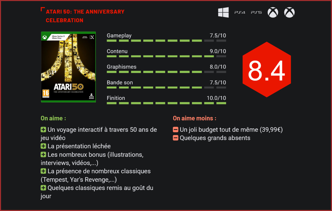 Atari célèbre son cinquantième anniversaire avec une compilation de jeux qui nous propose un voyage interactif à travers l’histoire du prestigieux éditeur… Atari 50, c’est la compilation ultime pour les fans de l’éditeur. Plus très nombreux, il faut bien l’avouer. Car si des licences comme Asteroids, Moon Lander ou Missile Command ont marqué l’histoire du jeu vidéo, Atari n’a plus sorti de jeux marquant depuis des décennies. La présentation est très soignée. Pour les vieux de la vieille et les curieux, Atari 50 offre toutefois un voyage unique dans le temps. La présentation du jeu est extrêmement soignée. L’histoire d’Atari nous est présentée à travers une ligne du temps, sur laquelle on navigue pour lire des bulles d’informations, visualiser des brochures publicitaires, regarder des clips vidéos et pas moins de 60 minutes d’interviews exclusives. Mine de rien, c’est une petite mine d’or qui attend les fans. On le sent, beaucoup d’amour a été versé dans cette compilation. Entre les différents “bonus” on retrouve également les jeux originaux, et quelques remakes pour des titres emblématiques comme Pong, qui a été modernisé et est jouable à deux. On retrouve pas moins de 60 minutes d’interviews exclusives, avec sous-titres! Vous pourrez ainsi redécouvrir tous les classiques d’Atari : Tempest, Missile Command, Pong, Asteroids, Warlords, Yar’s Revenge, mais aussi une panoplie impressionnante de jeux moins connus comme la série complète des “RealSports”, Ninja Golf ou Malibu Bikini Volleyball. Tout un programme. Globalement, le line-up est très convaincant, même si on regrette l’absence de quelques titres emblématiques. “E.T.” est mentionné mais n’est pas jouable. Ne boudons pas notre plaisir, il y a tout de même de quoi faire avec les 103 jeux proposés, qui sont tirés de plusieurs catalogues de consoles (7 en tout!), dont la Jaguar. On retrouve également quelques jeux du catalogue de la Jaguar. Mine de rien, le contenu est donc très généreux. Il s’agit de l’une des compilations les plus exhaustives que l’on ait pu tester ces dernières années. Un énorme travail de documentation a été réalisé et la présentation ultra-soignée des menus fait de cette compilation un véritable musée interactif. Autrement dit, un must-have pour les fans de rétrogaming. La compilation introduit également quelques inédits. Les “remakes” de classiques comme Neo Breakout, Yar’s Revenge, Vctr Sctr, Haunted House ou Pong, qui ont droit à une jolie modernisation et sont pour la plupart jouables à plusieurs en local. Les fans retrouveront également un inédit : Airworld, un jeu qui n’avait jamais été terminé. Bref, il y a là quelques véritables pépites pour les rétrogamers. Tous les classiques sont là. La compilation d’Atari parvient même à convaincre les joueurs plus jeunes, qui pourront découvrir tout un pan de l’histoire de façon interactive. Comme on l’a déjà dit, la présentation du jeu est soignée, les infos sont intéressantes, les documentaires proposés sont passionnants et le fait que certains titres aient été modernisés n’est pas anecdotique. Cela permettra surtout de faire redécouvrir quelques classiques aux plus jeunes ou aux familles des rétrogamers dans des conditions “un peu plus acceptables”. Alors oui, le tarif est un poil élevé. Mais vu le contenu proposé, difficile de trouver quoi que ce soit à redire sur cette compilation qui frôle, une fois n’est pas coutume, la perfection. Conclusion 103 jeux, 60 minutes d’interviews inédites, des reportages, des bonus en pagaille, la compilation Atari 50 The Anniversary Celebration voit les choses en grand. Atari célèbre de la plus belle des façons son cinquantième anniversaire avec une compilation copieuse et admirablement présentée. Atari 50, c’est sans l’ombre d’un doute LA meilleure compilation de ces dernières années. L’histoire d’Atari nous est contée à travers des bulles informatives, vidéos, illustrations et interviews. Tous les classiques sont là : Tempest, Missile Command, Breakout, Pong… Et certains d’entre eux ont même eu droit à une refonte graphique. Que vous soyez un joueur nostalgique ou un simple curieux, Atari 50 est un véritable incontournable pour les passionnés d’histoire de gaming.