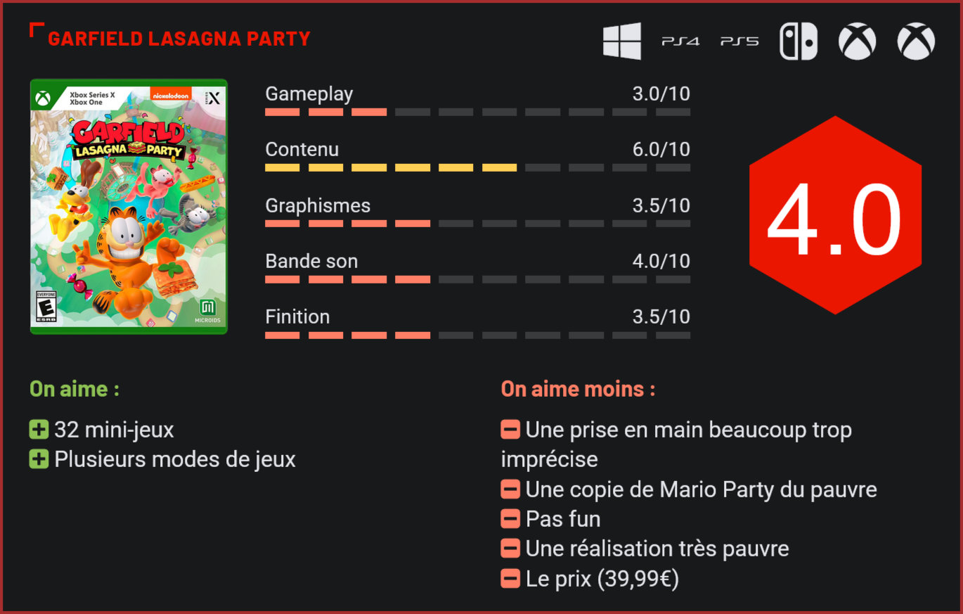 Après un Garfield Kart Racer plutôt réussi, Microids signe une seconde adaptation de la licence en jeu vidéo. Lasagna Party s’inspire cette fois de l’incontournable Mario Party. Microids multiplie les adaptations de cartoons et bandes-dessinées en jeux vidéo. Après Marsupilami et Astérix & Obélix, c’est une nouvelle fois au tour de Garfield d’avoir droit à son adaptation en jeu vidéo. Garfield Lasagna Party n’est toutefois pas l’adaptation d’un ouvrage en particulier. Microids a opté pour une formule qui marche en nous livrant un party-game calqué sur l’étendard de Nintendo. Garfield Lasagna Party n’est ni plus ni moins qu’une copie de Mario Party dans l’univers de Garfield. Le mode de jeu principal copie la formule des Mario Party. Le mode de jeu principal reprend le plateau emblématique de Mario Party. Les joueurs doivent lancer un dé à tour de rôle pour progresser sur un plateau parsemé de défis, qui leur permettra d’acquérir des points. La formule est efficace. Dans la pratique toutefois, on se rend très vite compte que si les défis proposés sont nombreux (32 tout de même!), la qualité n’est pas vraiment au rendez-vous. Chaque mini-jeu est une réplique d’un mini jeu de Mario Party. Il faudra en vrac se livrer à une bataille de boules de neige, participer à un parcours d’obstacles, aspirer des araignées dans toutes les pièces de la maison, envoyer des pizzas dans un four,… Dans la pratique, tout cela aurait pu être très amusant si les contrôles n’étaient pas aussi imprécis et si un petit temps de latence ne venait pas tout gâcher. Dans ce mini-jeu, il faut capturer un max d’araignées. Si le jeu est coloré, fidèle à l’esprit de Garfield et propose un contenu plutôt riche, on s’ennuie malheureusement ferme dans les défis, la faute à un manque de sensations. Face à l’IA, impossible de perdre ou presque tant le niveau est bas. Face à des joueurs humains, le défi est là mais on ne s’ennuie pas moins, la faute encore une fois à des contrôles imprécis et à un manque de sensations. Lasagna Party est bel et bien un clone de Mario Party, mais un clone raté. Et c’est bien dommage car le potentiel était bien là et Microids était parvenu à livrer quelques compilations de mini-jeux réussis par le passé. Les mini-jeux sont calqués sur ceux de Mario Party. On le sent : le budget n’était tout simplement pas là. Visuellement, le jeu est coloré, mais extrêmement basique. Les modélisations sont simplistes, les animations d’un autre âge. La bande son reste dans l’esprit de Garfield, mais est elle aussi atrocement pauvre. Durant nos parties, on a également repéré quelques jolis bugs. Notre personnage est resté bloqué une fois dans les décors et il n’a pas été rare de voir apparaître des bugs graphiques. Bref, ça sent bon le jeu à licence développé en quelques mois. On le sent pourtant, le cahier des charges était ambitieux. 32 mini-jeux, ce n’est pas rien. En plus du mode plateau, on retrouve de surcroit un mode tournoi qui propose d’enchainer les mini-jeux à plusieurs et d’accumuler ainsi les points pour sacrer un gagnant en fin de partie et un mode challenge dans lequel on peut s’entrainer sur chaque mini jeu. Le jeu est jouable jusqu’à quatre, mais là aussi le casting est limité à seulement quatre personnages iconiques de la série, ce qui est un peu léger. On retrouve en tout 32 mini jeux. Clone à petit budget de Mario Party, Lasagna Party avait les bases pour accomplir son objectif, mais c’est au niveau de la finition que cela coince, et c’est bien dommage car l’univers de Garfield est assez riche pour développer un chouette party-game. En l’état, difficile malheureusement de le conseille, sauf peut-être aux fans purs et durs de la licence. Le fun n’est simplement pas là et à l’exception d’un très jeune public peu regardant, difficile d’imaginer le titre séduire un gamer avisé. Conclusion Avec Microids, on tire souvent à la courte paille. Si plusieurs adaptations de bandes-dessinées en jeu sont de franches réussites, à l’image de Marsupilami, d’autres frôlent le fiasco. C’est le cas de ce Garfield: Lasagna Party. Coloré, fidèle à l’univers de Garfield et proposant un contenu très correct (32 mini jeux et 3 modes de jeu), ce party-game ne parvient toutefois pas à séduire, la faute à un manque de fun. Il s’agit pourtant d’une réplique presque complète de Mario Party. Mais les déplacements et contrôles très imprécis, les animations d’un autre temps et les nombreux bugs font de cette adaptation une petite déception. Dommage, car le potentiel était là.