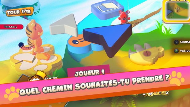 Après un Garfield Kart Racer plutôt réussi, Microids signe une seconde adaptation de la licence en jeu vidéo. Lasagna Party s’inspire cette fois de l’incontournable Mario Party. Microids multiplie les adaptations de cartoons et bandes-dessinées en jeux vidéo. Après Marsupilami et Astérix & Obélix, c’est une nouvelle fois au tour de Garfield d’avoir droit à son adaptation en jeu vidéo. Garfield Lasagna Party n’est toutefois pas l’adaptation d’un ouvrage en particulier. Microids a opté pour une formule qui marche en nous livrant un party-game calqué sur l’étendard de Nintendo. Garfield Lasagna Party n’est ni plus ni moins qu’une copie de Mario Party dans l’univers de Garfield. Le mode de jeu principal copie la formule des Mario Party. Le mode de jeu principal reprend le plateau emblématique de Mario Party. Les joueurs doivent lancer un dé à tour de rôle pour progresser sur un plateau parsemé de défis, qui leur permettra d’acquérir des points. La formule est efficace. Dans la pratique toutefois, on se rend très vite compte que si les défis proposés sont nombreux (32 tout de même!), la qualité n’est pas vraiment au rendez-vous. Chaque mini-jeu est une réplique d’un mini jeu de Mario Party. Il faudra en vrac se livrer à une bataille de boules de neige, participer à un parcours d’obstacles, aspirer des araignées dans toutes les pièces de la maison, envoyer des pizzas dans un four,… Dans la pratique, tout cela aurait pu être très amusant si les contrôles n’étaient pas aussi imprécis et si un petit temps de latence ne venait pas tout gâcher. Dans ce mini-jeu, il faut capturer un max d’araignées. Si le jeu est coloré, fidèle à l’esprit de Garfield et propose un contenu plutôt riche, on s’ennuie malheureusement ferme dans les défis, la faute à un manque de sensations. Face à l’IA, impossible de perdre ou presque tant le niveau est bas. Face à des joueurs humains, le défi est là mais on ne s’ennuie pas moins, la faute encore une fois à des contrôles imprécis et à un manque de sensations. Lasagna Party est bel et bien un clone de Mario Party, mais un clone raté. Et c’est bien dommage car le potentiel était bien là et Microids était parvenu à livrer quelques compilations de mini-jeux réussis par le passé. Les mini-jeux sont calqués sur ceux de Mario Party. On le sent : le budget n’était tout simplement pas là. Visuellement, le jeu est coloré, mais extrêmement basique. Les modélisations sont simplistes, les animations d’un autre âge. La bande son reste dans l’esprit de Garfield, mais est elle aussi atrocement pauvre. Durant nos parties, on a également repéré quelques jolis bugs. Notre personnage est resté bloqué une fois dans les décors et il n’a pas été rare de voir apparaître des bugs graphiques. Bref, ça sent bon le jeu à licence développé en quelques mois. On le sent pourtant, le cahier des charges était ambitieux. 32 mini-jeux, ce n’est pas rien. En plus du mode plateau, on retrouve de surcroit un mode tournoi qui propose d’enchainer les mini-jeux à plusieurs et d’accumuler ainsi les points pour sacrer un gagnant en fin de partie et un mode challenge dans lequel on peut s’entrainer sur chaque mini jeu. Le jeu est jouable jusqu’à quatre, mais là aussi le casting est limité à seulement quatre personnages iconiques de la série, ce qui est un peu léger. On retrouve en tout 32 mini jeux. Clone à petit budget de Mario Party, Lasagna Party avait les bases pour accomplir son objectif, mais c’est au niveau de la finition que cela coince, et c’est bien dommage car l’univers de Garfield est assez riche pour développer un chouette party-game. En l’état, difficile malheureusement de le conseille, sauf peut-être aux fans purs et durs de la licence. Le fun n’est simplement pas là et à l’exception d’un très jeune public peu regardant, difficile d’imaginer le titre séduire un gamer avisé. Conclusion Avec Microids, on tire souvent à la courte paille. Si plusieurs adaptations de bandes-dessinées en jeu sont de franches réussites, à l’image de Marsupilami, d’autres frôlent le fiasco. C’est le cas de ce Garfield: Lasagna Party. Coloré, fidèle à l’univers de Garfield et proposant un contenu très correct (32 mini jeux et 3 modes de jeu), ce party-game ne parvient toutefois pas à séduire, la faute à un manque de fun. Il s’agit pourtant d’une réplique presque complète de Mario Party. Mais les déplacements et contrôles très imprécis, les animations d’un autre temps et les nombreux bugs font de cette adaptation une petite déception. Dommage, car le potentiel était là.