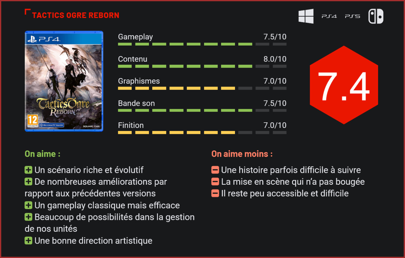 Sorti à l’origine en 1995 sur les Super Nintendo japonaises, Tactics Ogre nous revient dans une toute nouvelle édition retravaillée. Le titre devenu culte pour les fans de Tactical-RPG est toujours aussi convaincant, mais reste impitoyable. Il y a un peu plus de 27 ans sortait un certain Tactics Ogre, un Tactical-RPG japonais qui a largement contribué à l’évolution du genre. On doit ce projet à un studio nommé Quest Corporation, aujourd’hui englouti par le géant Square Enix, mais aussi par un certain Yasumi Matsuno. Un nom que les fans de JRPG de longue date reconnaîtront peut-être, le monsieur étant la tête pensante de l’univers d’Ivalice dans lequel se déroulent quelques jeux de Square (Final Fantasy XII et Tactics, entre autres). L’éditeur nous livre cette fois une toute nouvelle remasterisation du titre, avec quelques changements au programme. Tactics Ogre nous raconte une grande fresque politique, se déroulant dans l’archipel de Valeria. Ces terres ont été longtemps en guerre, puis unifiées par un Roi qui a instauré la paix, mais celle-ci fut rompue à la mort du souverain. La lutte pour sa succession a opposé trois clans, celui des Bakrams qui formaient la noblesse, des Galgastans composant la population et le clan des Walisters. Les camps Bakrams et Galgastans ont accaparé une moitié chacun de l’archipel, menant à une période de calme, qui est sur le point de se rompre. On incarne alors Denam, un jeune homme de la résistance des Walisters, qui va se voir confier la lourde tâche de monter une armée pour survivre face aux deux autres camps. Le gameplay se déroule de manière classique pour le genre. L’aventure nous donnera l’occasion de rencontrer de nombreux personnages, mais il faudra aussi faire des choix moraux qui vont impacter la suite du scénario. Si elle est un peu difficile à suivre à cause de sa mise en scène minimaliste et de sa complexité, cette histoire est pourtant d’une grande qualité. Le titre propose une section dédiée à des résumés de l’histoire et tout un tas d’écrits détaillant l’univers du jeu. Ce scénario se révèle alors peu accessible, mais gratifiant et très profond pour ceux qui feront l’effort de s’y intéresser. Le constat est assez similaire du côté du gameplay. Entre ses très nombreux dialogues, Tactics Ogre propose des batailles au tour par tour qui sont aujourd’hui plutôt classiques. Nous contrôlons de nombreux personnages que nous devons déplacer de case en case pour remplir un objectif précis, généralement de vaincre le chef de l’armée ennemie. Nos combattants ne sont pas toujours des personnages importants du récit, il est nécessaire de recruter des soldats génériques moyennant finance. Un système de classes permet de les différencier, et le titre nous laisse beaucoup de liberté dans la conception de notre armée. Les classes donnent des compétences uniques aux personnages. Il faut en fait passer pas mal de temps dans les menus pour équiper nos personnages et bien se préparer. Tactics Ogre offre de nombreuses possibilités et se montre souvent très corsé. Le titre nous demande de faire très attention au placement de nos unités durant les batailles, histoire de ne pas blesser nos propres coéquipiers s’ils sont dans la trajectoire de nos attaques. Il n’est pas toujours possible de s’en sortir par des moyens détournés, le scénario nous imposant un niveau maximum selon notre progression. Les batailles sont aussi assez longues et laisser nos personnages morts durant trois tours mène à leur mort définitive. Le titre nous donne tout de même la capacité de revenir quelques tours en arrière si nécessaire. Cette nouvelle édition du jeu se base beaucoup sur la version PSP de Tactics Ogre, mais propose tout de même quelques ajustements et nouveautés. Une plus grande liberté dans la construction de nos personnages est possible, de même que quelques nouveautés dans les combats tels qu’un mode permettant d’accélérer la vitesse du jeu ainsi que des cartes qui apparaissent sur le terrain et qui octroient des bonus de statistique une fois récupérés. Cette version Reborn ne propose pas de très gros changements, mais plutôt tout un tas d’ajustements qui rendent l’expérience plus agréable. Évidemment, on retrouve aussi un travail sur les visuels du jeu. Les batailles sont parfois longues et complexes. Tactics Ogre Reborn reste relativement proche des versions précédentes visuellement, mais cette fois en haute définition. On peut cependant remarquer le lissage des personnages et des décors, il est probable que ces changements visuels ne plaisent pas à tout le monde. Pourtant, le rendu est tout de même très convaincant, amenant un entre deux (entre pixel art old-school et un style dessiné plus moderne) qui est satisfaisant. Le scénario est accompagné de doublage en anglais ou en japonais qui donne plus de vie, ainsi que d’une bande-son de Hitoshi Sakimoto qui est toujours aussi prenante et qui a été enregistrée avec de vrais instruments pour l’occasion. S’il n’en a plus trop l’air aujourd’hui, Tactics Ogre était un jeu vidéo très ambitieux à l’époque de sa sortie, qui avait pour but de nous raconter une histoire politique complexe dès 1995. Une longue histoire et le contenu qui va avec puisqu’il faut pas loin d’une cinquantaine d’heures pour en voir le bout, et du contenu secondaire vient alimenter cette durée de vie déjà conséquente. Force est de constater que cette histoire n’a rien perdu de son efficacité, même si le reste a un peu vieilli. Le travail fourni sur ce remaster permet tout de même de proposer une expérience plus fluide pour un titre qui demande toujours un peu d’investissement de notre part. Conclusion Il y a 27 ans débarquait un Tactical-RPG qui va fortement influencer le genre. Tactics Ogre est de retour sur PC et sur les consoles actuelles dans une toute nou
