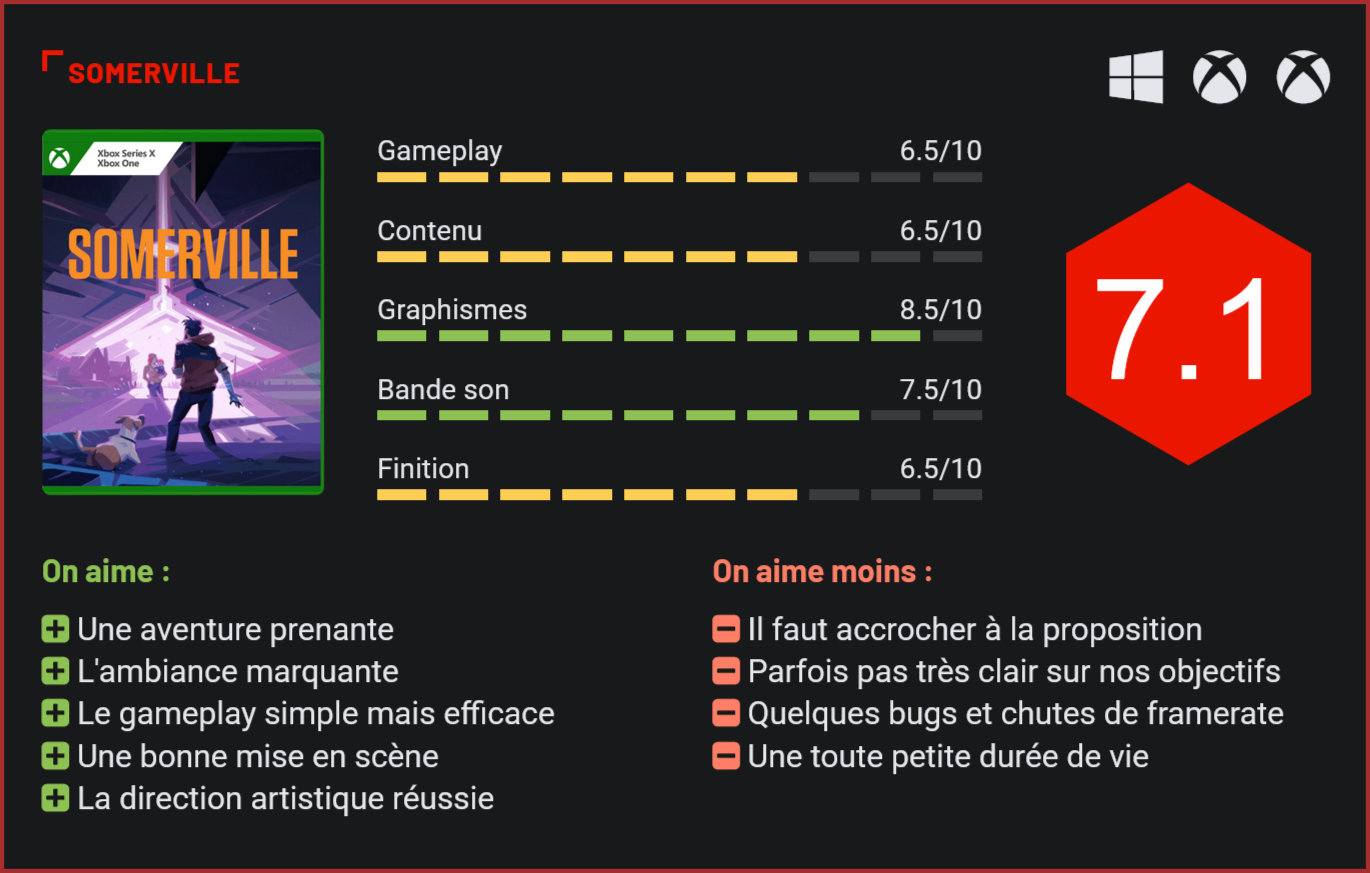 Un nouveau studio du nom de Jumpship a récemment publié son premier jeu. Somerville est une aventure qui mise tout sur sa direction artistique et son ambiance. Si le studio Jumpship est un nouveau nom dans l’industrie, ses origines sont pourtant notables. La boite a été fondée par un certain Chris Olsen en compagnie de Dino Patti, l’un des cofondateurs et l’ancien PDG de Playdead. Ce dernier est le studio connu pour avoir réalisé les jeux Limbo et Inside, des titres qui ont une certaine importance dans la sphère des jeux indépendants. Une filiation qui a beaucoup de sens avec le jeu qui nous intéresse aujourd’hui, Somerville, puisque celui-ci s’inspire énormément des jeux de Playdead et propose le même type d’expérience. Le titre est disponible depuis peu sur PC et consoles Xbox, ainsi que via le Game Pass. Le point de départ de l’aventure se situe dans le confort familial. Dans Somerville, nous suivons l’histoire d’un père de famille qui vit avec sa compagne et son enfant dans une petite maison à la campagne. Si tout se déroule bien dans un premier temps, la vie des trois membres de la famille sera vite chamboulée par un événement mystérieux. Une sorte de monolithe étrange s’écrase dans le jardin de la famille, et ceux-ci sont témoins de ce qui semble être une invasion extra-terrestre, ou un conflit entre des peuples à la technologie avancée. Le personnage principal meurt dans des circonstances étranges, avant de reprendre connaissance quelque temps plus tard grâce à son nouveau pouvoir, lui aussi très mystérieux. Il doit alors retrouver sa famille dans un monde ravagé. Sans aucun mot ni dialogues, cette aventure va se dérouler de manière très cryptique. Nous sommes plongés dans le quotidien de gens ordinaires qui vivent une invasion tout droit tirée d’une histoire de science-fiction. Il s’agit d’un jeu entièrement linéaire et au gameplay très léger, à la manière de Limbo et Inside. Et tout comme ses deux prédécesseurs, Somerville arrive très vite à instaurer une ambiance particulièrement efficace, et ses nombreux mystères donnent véritablement envie de continuer l’aventure. Nos pouvoirs permettent de désintégrer les structures extraterrestres. Le titre se révèle très léger au niveau de son gameplay et n’est qu’une ligne droite qui continue le scénario. Un bouton d’action sert à faire un peu tout, notamment pousser ou attraper des objets, et d’autres boutons permettent d’activer notre pouvoir. Ce dernier permet d’interagir avec la matière extraterrestre et de transformer les sources de lumières, qui peuvent ainsi désintégrer certains éléments dont il faut se débarrasser pour progresser. Somerville n’indique pas très clairement quels sont les objets avec lesquels on peut interagir, mais propose tout de même quelques très légères énigmes qui viennent rythmer le jeu. L’aventure n’hésite pas à mettre quelques coups de pression en mettant notre personnage dans des situations délicates. On doit alors se faufiler pour ne pas être repéré par des sentinelles extra-terrestres, ou tout simplement fuir nos poursuivants. Nous sommes souvent traqués au cours du jeu. Somerville est prenant et vraiment bien mis en scène. Sa direction artistique originale est très efficace et permet de voir de beaux panoramas et des scènes assez mémorables. La bande-son n’est pas en reste et propose de jolis morceaux qui viennent renforcer l’ambiance pesante du titre. Là où le jeu déçoit un peu, c’est sur le plan technique puisqu’on croise quelques petits bugs et soucis de framerate sur console. Sa durée de vie est également un point noir. Somerville se termine en à peine trois ou quatre heures, un constat décevant lorsqu’on sait qu’il coûte environ 25 euros pour ceux qui ne veulent pas passer par le Game Pass. La qualité de l’aventure est tout de même au rendez-vous, avec un style très marqué, mais il ne faut pas s’attendre à une longue épopée aux systèmes de gameplay complexes. Il n’empêche que Somerville reste un bon titre, si vous aimez les expériences du genre. Conclusion Le nouveau studio Jumpship a récemment publié son premier jeu : Somerville. Il s’agit d’un successeur légitime de Limbo et Inside tant par sa démarche artistique que par sa parenté avec Dino Patti, l’un des cofondateurs et l’ancien PDG de Playdead. Disponible sur consoles Xbox, PC et via le Game Pass, Somerville est un jeu d’aventure narratif dans lequel nous incarnons un père de famille. Si tout se déroule bien dans un premier temps, la vie des trois membres de la famille sera vite chamboulée par une attaque extraterrestre. Notre personnage se retrouve séparé de sa famille et possède désormais des pouvoirs mystérieux qu’il va utiliser pour retrouver les siens. Il s’agit d’un titre au gameplay très léger, qui nous demande occasionnellement de résoudre de très légers puzzles, mais l’aventure est très prenante grâce à sa mise en scène et ses nombreux mystères. Sa direction artistique est une belle réussite, mais le titre souffre de quelques soucis techniques et petits bugs. Son plus gros problème est sans doute sa durée de vie qui s’élève à seulement quelques heures. Il ne faut donc pas s’attendre à une longue aventure, mais il n’empêche que Somerville reste un bon titre pour les amateurs de ce genre d’expériences.