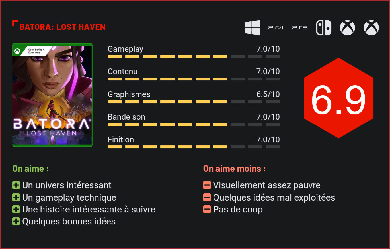 Edité par la Team17 et développé par un petit studio indépendant, Batora Lost Haven est un curieux mélange de hack & slash et de twin stick shooter dans un univers futuriste. Et, potentiellement, l’une des bonnes surprises de cette fin d’année. Développé par le petit studio Stormind Games, Batora est un jeu d’aventure en vue isométrique qui s’inspire assez ouvertement de Diablo et d’autres hack & slash modernes. L’originalité ici, vient de l’univers SF post-apocalyptique. Vous ne combattrez pas ici des trolls et zombies mais des monstruosités du fin fond de l’espace. Dans la peau d’Avril, l’une des rares survivantes d’un désastre qui a frappé la planète Terre, le joueur devra tenter de sauver la galaxie en s’embarquant dans une quête aux confins de la galaxie. Les combats sont intenses. Avec son univers très mystérieux, le jeu parvient à agréablement nous surprendre dès les premières minutes. Et ce, malgré une mise en scène assez basique et une réalisation très sobre. Batora n’hésite pas à jouer des coudes pour se distinguer des autres action-RPG avec notamment un concept de morale unique. Dans le jeu, le joueur sera amené à prendre des décisions qui auront un impact sur le scénario du jeu et la destin de certains protagonistes. Batora n’hésite pas non plus à jouer avec les codes du genre en mixant les genres justement. S’il s’agit à la base d’un action-RPG aux allures de hack & slash, le jeu intègre quelques éléments propres aux twin stick shooters. Côté gameplay, le tout repose sur un système de polarité. L’héroine est capable de se transformer en maîtrisant les pouvoirs de la lune et du soleil. Ce qui induit deux jauges de vie différentes et deux types d’ennemis différents également à affronter. Donc, des combats multidimensionnels. Concrètement, il faudra continuellement transformer son corps pour affronter deux types de créatures différentes. Chaque type de créature ne subira en effet des dégâts que lorsque vous vous serez transformé. Technique, le jeu se montre également très intense dans ses combats. Il ne sera pas rare de s’emmêler les pinceaux avec ce système et de devoir recommencer une séquence après être mort… Quelques énigmes ponctuent la progression. Très addictif, le gameplay du jeu a toutefois tendance à vite tourner en rond. Batora n’est d’ailleurs pas le premier jeu à reposer sur ce principe. Là où le titre se distingue des autres hack & slash proposant un gameplay similaire, c’est que le jeu propose également des petites énigmes qui reposent sur l’utilisation de ces états multidimensionnels et permettent d’apporter un peu de diversité au gameplay. Le tout fonctionne plutôt bien, même s’il faut avouer encore une fois que sur la longueur, le jeu a un peu de mal à se renouveler. Plaisant de parcourir de bout en bout, Batora Lost Haven peine toutefois à marquer le coup, la faute en grande partie à une héroïne qui manque quelque peu de charisme, une réalisation qui reste très (trop!) sobre dans l’ensemble et une patte graphique qui joue souvent les cache misère. Oui, le jeu a son charme, mais difficile de ne pas se rendre compte des limites techniques. L’univers a son charme. De façon générale, on reprochera sans doute le plus au jeu de ne pas se donner les moyens de nous en mettre plein les yeux, avec une présentation très sobre, des cinématiques fadasses, et des personnages centraux très plats. L’univers du jeu a un réel potentiel, mais on le sent, l’écriture manque de maturité et l’auteur a clairement tenté de cocher un paquet de cases feel-good et inclusives. Les amateurs de hack & slash découvriront toutefois avec ce Batora un joli divertissement, plaisant à parcourir de bout en bout et qui a le mérite d’être proposé à un prix sympa (24,99€). Il faut l’avouer toutefois, en cette fin d’année, Batora aura sans doute du mal à se faire une place parmi les grands noms… Conclusion Avec son univers charmant et ses idées originales, Batora se présente comme un hack & slash très original et plaisant à parcourir de bout en bout. On le dit souvent : l’enfer est pavé de bonnes intentions. Si les idées étaient géniales sur le papier, elles peinent toutefois à se concrétiser dans la pratique. Les multidimensions apportent certes de la technicité dans les combats, mais le concept a du mal à se renouveler au cours de l’aventure. Tous les mécanismes du jeu reposent ici sur le changement de dimension du personnage. Un concept sympa, mais extrêmement répétitif. On en a également le sentiment : les développeurs ne se sont pas donnés les moyens de nous impressionner. Trop ambitieux pour une petite équipe, Batora a du mal à nous investir dans son histoire avec ses cinématiques simplistes et ses dialogues assez creux. Reste qu’à 24,99€, voici un petit hack & slash original, qui nous propose un petit vent de fraicheur… pas trop mal donc pour s’occuper ces longs mois d’hiver.
