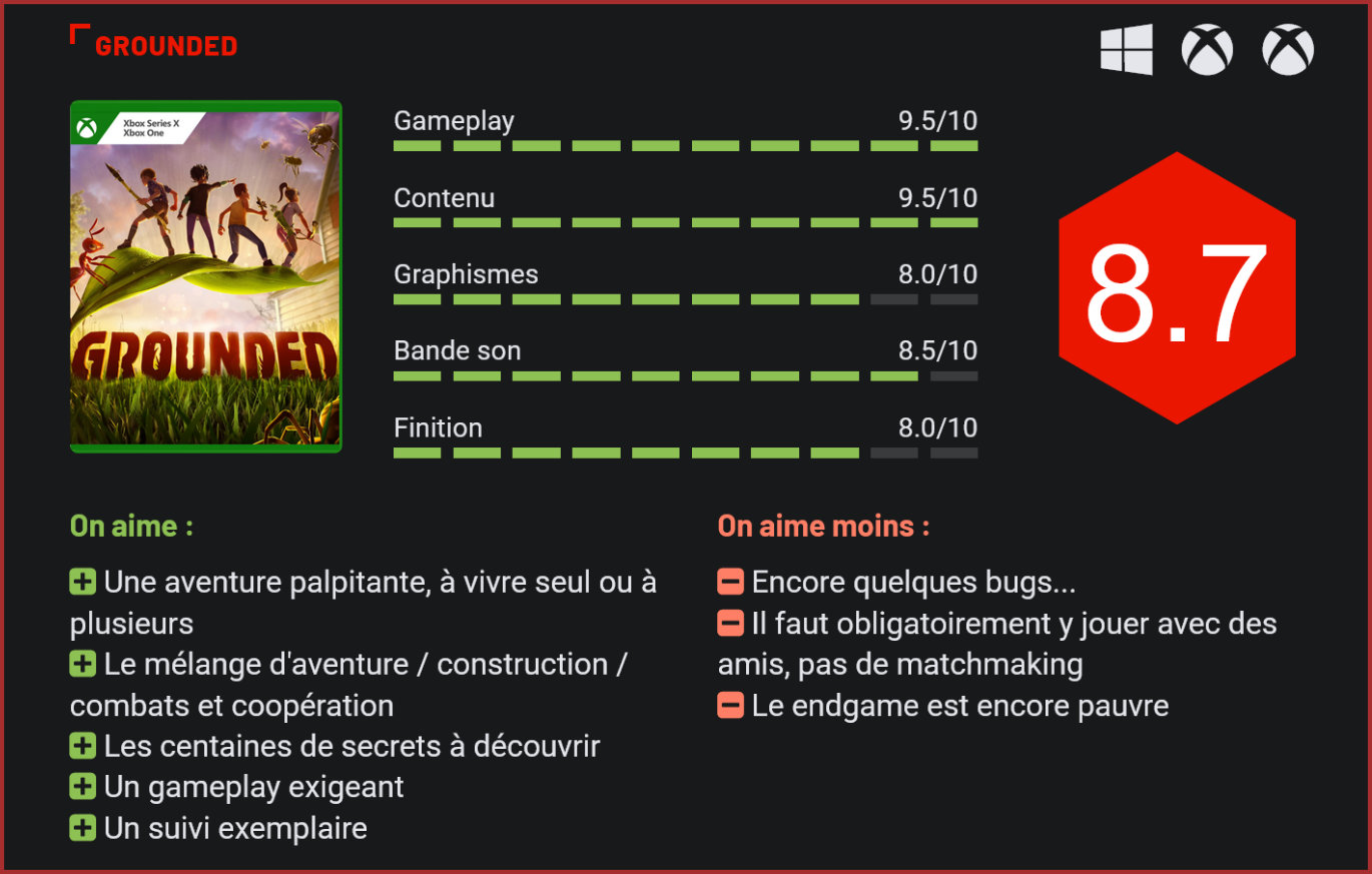 Lancé il y a deux ans à l’état d’early access, Grounded avait été très critiqué pour son contenu famélique. Deux ans plus tard, le studio Obsidian nous livre finalement la version finale de son jeu. Connu pour son travail sur Fallout New-Vegas plus récemment sur The Outer Worlds, le studio Obsidian avait surpris tout le monde en dévoilant en 2020 un curieux nouveau jeu d’aventure coopératif baptisé Grounded. Lancé quasi immédiatement en accès anticipé, le titre était parvenu à trouver son public, malgré un contenu très léger à sa sortie. Porté par le Xbox GamePass, Grounded a depuis lors beaucoup grandi, au fil des mises à jour, jusqu’à la sortie de sa version finale il y a quelques semaines. L’occasion de faire le point sur ce jeu à part. Votre première construction ressemblera à un fortin. Mais Grounded, c’est quoi au juste ? Beaucoup de joueurs ont fait l’erreur de comparer Grounded à Minecraft. Certes, les deux titres permettront de réaliser des constructions en récupérant des matériaux dans le monde qui les entoure. Mais la comparaison s’arrête là. Tout d’abord, parce que contrairement à Minecraft, le monde de Grounded n’est pas généré de façon procédurale – et cela change absolument tout dans la façon d’explorer son univers. Les développeurs ont pris soin de développer différents biomes qui sont connectés les uns aux autres dans un univers étonnamment réaliste. Pas de gros pixels ici, ni d’épouvantails, mais un univers cartoonesque qui s’inspire assez ouvertement du film “Chéri chez rétréci les gosses”. Dans Grounded, vous plongerez en effet dans l’univers de l’infiniment petit. Dans la peau d’un gamin et de sa bande de potes rétrécis, il faudra apprendre à survivre dans un jardin, où chaque insecte devient un potentiel prédateur. Vous pourrez planer pour atteindre une position distante. Grounded se présente donc comme un curieux mélange de jeu de survie/craft à la Minecraft, un jeu d’aventure coopératif à la Halo, dans lequel 2 à 4 joueurs coopèrent pour affronter des ennemis, un RPG en open world, finalement pas si différent d’un Elder Scrolls avec son équipement upgradable, et un FPS, car oui, le jeu se joue principalement à la première personne et s’il comprend des phases de combat au corps à corps, il comprend aussi des séquences de “tir” avec diverses armes longue portée comme un arc ou une arbalète. Vous l’aurez compris, Grounded, c’est avant tout un jeu d’aventure, qui se joue de préférence à plusieurs entre potes – car malheureusement il n’y a pas ici de matchmaking, ce qui est en soi logique car les sessions de jeu sont longues et le concept ne fonctionnerait probablement pas avec des inconnus. Largués dans ce vaste monde ouvert, il faudra se fabriquer un abri, se nourrir, boire, s’armer et partir à l’aventure. La force du jeu, c’est son incroyable monde ouvert qui regorge de biomes à explorer, de secrets et trésors à découvrir, d’aventures inoubliables à vivre et de créatures à affronter. Au début de l’aventure, vous souffrirez certainement. Il faudra comprendre les mécanismes du jeu, accepter la mort, accepter l’échec aussi face à des araignées gigantesques qui ne feront qu’une bouchée de vous… Après quelques heures de jeu, avec un meilleur équipement, vous commencerez à tenir tête à certains ennemis, pour devenir une véritable machine à tuer dans le endgame. Il sera préférable d’y jouer à plusieurs entre amis. S’il y a deux ans, le contenu du jeu était très léger, Grounded propose aujourd’hui un univers très vaste à explorer, avec plus d’une trentaine de créatures différentes à affronter, une demi-douzaine de boss et plus d’une vingtaine de biomes différents. A ce sujet, difficile de ne pas s’emmouracher des micro-environnements parcourus, du “bac à sable” dans lequel il ne faudra pas rester trop exposé au soleil pour éviter de griller – littéralement ! – et il faudra explorer les galeries des fourmillons aux profondeurs du lac, qui regorge de trésors à découvrir, mais également de laboratoires top-secrets. Car dans ce vaste monde ouvert, vous devrez lever progressivement le voile sur ce qui vous est arrivé, en explorant des laboratoires top-secrets _ des simili-donjons – qui regorgent de trésors, documents, ressources et sont généralement également synonymes de combats de boss. Si l’aventure principale peut se boucler en 20 à 30 heures de jeu, il faudra aller bien au-delà des 100 heures de jeu pour finir à 100% l’aventure, en recensant toutes les espèces du jardin, finissant tous les “donjons” et en découvrant surtout les centaines de collectibles cachés aux quatre coins de la carte. Les boss sont particulièrement coriaces. Ici, la “broodmother”, premier boss du jeu. En deux ans, la petite équipe de développeurs qui planchait sur ce projet est parvenue à faire d’un petit jeu de survie indépendant l’un des meilleurs RPG coopératifs jamais créés. Et c’est peu dire, car si Grounded reste un jeu à “petit budget”, il n’a rien à envier à un colosse comme Sea of Thieves ou Fallout. Tout n’est certes pas parfait : comme dans les autres jeux du genre, on retrouve ça et là encore quelques bugs, le système de construction est plus limité que dans d’autres jeux de crafting et le endgame est aujourd’hui encore assez pauvre. Ceci étant dit, le suivi du jeu a été irréprochable depuis le début, avec des mises à jour massives qui ont apporté un paquet de nouveautés à chaque fois. Et bien que le titre soit aujourd’hui sorti d’accès anticipé, les développeurs ont déjà annoncé une première mise à jour qui apportera quelques correctifs et introduira quelques petites nouveautés aussi. Autrement dit, oui le endgame est limité, mais le jeu devrait continuer à évoluer au fil des mois… Ne vous fiez pas 