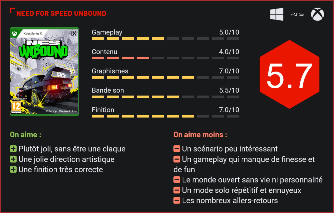 Need for Speed Unbound était attendu au tournant. Tout d’abord, parce qu’il s’agit de l’un des premiers jeux “new-gen” à voir le jour. Ensuite, parce que ce projet de reboot pour la franchise a été confié à un prestigieux studio. Aux manettes, on retrouve en effet le studio Criteron, connu pour son travail sur la série des Burnout et auteur de l’excellent Need for Speed: Hot Pursuit. Les fans avaient toutes les raisons d’être optimistes. Avec Criteron aux commandes du projet, Unbound ne pouvait être qu’une réussite. Après tout, le studio avait déjà brillamment redonné ses lettres de noblesse à la série avec le reboot d’Hot Pursuit en 2010 et l’excellent Most Wanted deux ans plus tard. Restés tapis dans l’ombre depuis lors, le studio a planché sur un projet ambitieux de reboot pour la franchise. Il nous livre aujourd’hui ce Need for Speed Unbound, premier épisode de la franchise à être “new-gen only”. Comprenez par là qu’il faudra obligatoirement une PS5 ou une Xbox Series pour y jouer dans son salon. Un choix audacieux, quand on sait que la plupart des joueurs sont encore sur l’ancienne génération de machines… Visuellement, le jeu nous en met plein les yeux! Qui dit nouvelle génération de consoles dit bien sûr meilleures performances graphiques et de ce point de vue là, en effet, Unbound est plutôt une réussite, sans être une claque complète. Le jeu tient tête à un Forza Horizon 5, mais la map est beaucoup plus petite et moins variée et surtout, contrairement à Forza Horizon 5, Unbound est un jeu new gen, Horizon 5 était un jeu cross-gen. On n’est donc pas forcément impressionné. Côté technique, le jeu reste toutefois très joli avec des modélisations des véhicules soignées, de jolis effets visuels, et surtout une direction artistique “animé” qui lui sied finalement bien. La finition est également très correcte pour un jeu triple-A : peu de bugs rencontrés et surtout une fluidité à toute épreuve. Les courses sont nerveuses, mais courtes. Jusque là, tout va bien. Là où ça commence à caler, c’est au niveau du contenu et en particulier du mode solo, qui adopte une structure très spéciale. Pas de tournois ici mais un monde ouvert dans lequel vous serez amené à faire des allers-retours incessants entre des rallyes urbains illégaux et votre “planque”. Les courses en question permettent de gagner des crédits pour améliorer ses véhicules, mais elles sont finalement très courtes et surtout très répétitives au niveau de leurs parcours, la faute à une carte de taille très modeste pour un open-world… On rejoue sans cesse les mêmes tracés jusqu’à plus soif. Le plus agaçant dans tout ça, c’est que, chaque course se terminera généralement par une course-poursuite avec la police, qui vous obligera à fuir par tous les moyens avant de revenir à votre planque. Les allers-retours sont nombreux et en terme de structure, NFS Unbound est extrêmement répétitif et ” vieux jeu”. Alors oui, l’esprit de la franchise est respecté et par rapport aux précédents volets, il y a du mieux. Vu le niveau des deux derniers en même temps, ce n’était pas forcément compliqué… Mais pour un jeu de course triple-A, Unbound fait mauvaise impression avec son mode solo répétitif, ennuyeux et surtout très peu intéressant à parcourir, la faute à un scénario qui tient sur 3 lignes et ne décollera jamais vraiment… Les effets visuels ne plairont pas à tout le monde. Autre gros défaut du titre : son monde ouvert manque cruellement de vie et de personnalité. Certes, des véhicules y circulent et les courses-poursuites avec la police y sont nombreuses, mais chaque run paraît atrocement similaire au précédent… Très vite, on connait par coeur l’open world à force d’arpenter toujours les mêmes routes. Et aucun événement inattendu ne vient ponctuer les parties. Pas d’hélicoptère à l’horizon, de vols d’oiseau, de traversée de biches. Par rapport à d’autres open world, Unbound est atrocement vide et mort. Et c’est bien dommage puisqu’esthétiquement, le jeu se défendait plutôt bien. Côté gameplay aussi, c’est la douche froide. La prise en main manque atrocement de finesse. On est ici face à un jeu d’arcade pur, mais qui semble avoir également oublié tout le côté fun intrinsèque au genre. La conduite des véhicules est pataude, le système de drift atrocement basique, la physique souvent surréaliste et la difficulté nous a paru très mal dosée. Le système est en tout cas fait pour vous faire rejouer plusieurs fois les mêmes compétitions chaque jour… Car en effet, il faudra acquérir ici un max de crédits. Notons au passage que vous n’aurez droit qu’à un nombre d’essais limité pour chaque course. Un en mode expert, quatre en normal, et jusqu’à 10 en facile… Et vu qu’il n’y a pas de ralenti – surprenant, pour un jeu arcade, non? – la moindre erreur vous forcera ici à tout recommencer… L’univers d’Unbound manque atrocement de vie. S’il fait donc un peu mieux que ses prédécesseurs et se rapproche un peu plus de l’esprit des NFS Undeground de l’époque de la PS2, Unbound aura bien du mal à convaincre face à un Forza Horizon 5. Les deux sont bien entendu sensiblement différents en terme de scope, mais il faut l’avouer, le mode solo sans ambition de ce NFS Unbound, son open-world sans personnalité et sa prise en main un peu pataude (mais où sont les sensations de vitesse???) en font un titre moyen qui ne parlera vraiment qu’aux puristes des épisodes Underground. Conclusion Avec Unbound, Criterion tente un retour aux sources pour la série des Need for Speed. S’il se rapproche des épisodes Underground sortis sur PS2 pour son côté tuning, Unbound tente une approche différente avec un open world dans lequel le joueur devra participer à des courses illégales de jour comme de nuit. Le concep