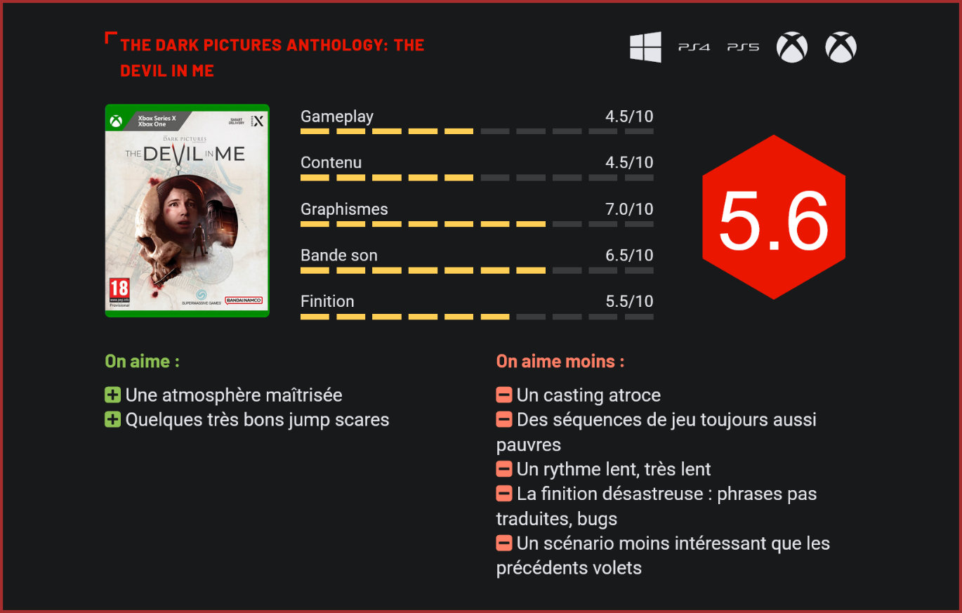 La première saison de l’anthologie de l’horreur “The Dark Pictures” se termine avec “The Devil in Me”, un épisode ambitieux, qui se révèle pourtant être le moins abouti des quatre jeux sortis à ce jour… Après le très sympathique “House of Ashes” et le très maîtrisé “The Quarry”, on s’attendait forcément à une très bonne surprise avec l’ultime chapitre de l’anthologie Dark Pictures de Supermassive Games. Le studio l’avait toutefois annoncé très tôt, “The Devil in Me” serait un épisode très différent de ses dernières productions. Et de facto, il y a du changement dans l’air, tant au niveau du gameplay que de l’univers. Tout d’abord, parce que contrairement aux précédents jeux “Dark Pictures”, The Devil in Me ne sombre pas instantanément dans le paranormal. Le jeu tente une approche plus réaliste de l’horreur en nous faisant découvrir l’histoire du “premier serial-killer de l’histoire des Etats-Unis”, le bien nommé H.H. Holmes. Un parti pris séduisant sur le papier, mais qui peine à convaincre dans la pratique. Car si l’intro nous ramène à l’époque du serial-killer, le reste du jeu prend place des décennies plus tard. Le jeu nous propose ici d’incarner les membres d’une équipe de tournage qui se rendent dans une réplique de l’hôtel où ont été commis les meurtres de H.H. Holmes. Caméras au poing, ils filment chaque recoin des lieux pour tourner LE documentaire qui sera un tournant dans leur carrière. Mais ils sont loin de s’imaginer ce qui les attend… Le casting peine à séduire. Comme nous l’avons dit plus haut, The Devil in Me s’écarte des précédents volets de la série en optant pour un style plus réaliste. L’atmosphère est parfaitement maîtrisée et le jeu réserve son lot de jump scares. Ceci étant dit, le rythme en prend un coup. The Devil in Me prend beaucoup plus de temps à installer son scénario que ses prédécesseurs et les séquences d’action sont également beaucoup moins nombreuses que par le passé. De façon générale, on reprochera au jeu un scénario qui peine à décoller et son casting qui n’est qu’une succession de clichés sans aucun charme. Difficile de s’attacher pour le moindre personnage. Tous ont des têtes à claques et surtout, leurs interactions ne font que renforcer notre désintérêt pour leurs sorts… Or, dans un film d’horreur, il est essentiel de s’attacher aux personnages pour se sentir immergé dans le scénario. Dans The Devil in Me, les personnages sont si agaçants qu’on a qu’une envie : en finir au plus vite avec eux. Les statistiques parlent par elles-mêmes : presque la moitié des joueurs qui ont terminé le jeu l’ont fini sans aucun personnage encore en vie à la fin de l’histoire… Côté gameplay, la recette reste globalement la même : un mélange de cut-scenes, de QTE, quelques rares puzzles peu intéressants, et un peu d’exploration du manoir, en temps réel. Seulement voilà, comme dans les précédents jeux, si l’on dirige bien le personnage comme dans un survival-horror, on n’est jamais réellement inquiété par son environnement puisque le jeu n’intègre aucune séquence de course-poursuite ou d’affrontements durant les séquences in-game, tout cela n’est intégré que par le biais de QTE. On est donc là face, encore une fois, à un simple walking-simulator. Ce nouvel épisode introduit toutefois une petite nouveauté : chaque personnage a ici une capacité qui lui est propre. L’un pourra utiliser son appareil photo pour capturer des images, l’autre remettre le courant… Dans la pratique, cela ne change toutefois pas grand chose puisqu’on est amené naturellement à utiliser leurs compétences lors de sortes de mini-jeux pour la résolution d’énigme. Le gameplay reste globalement très pauvre et clairement, on en attendait beaucoup plus à ce niveau. L’atmosphère du jeu reste maîtrisée. Difficile donc de ne pas être déçu par ce nouvel épisode, qui rate le coche niveau scénario, casting et rythme. The Devil in Me n’est certes pas un mauvais jeu, mais la formule a cette fois beaucoup plus de mal à prendre. Et surtout, les deux précédents jeux du studio faisaient beaucoup mieux d’un point de vue narratif. Visuellement, les environnements très lumineux de ce nouveau volet ont également tendance à moins flatter la rétine que les environnements très sombres de House of Ashes. Cerise sur le gâteau, la finition du jeu est désastreuse avec des bugs en pagaille, des animations d’un autre âge, de gros problèmes de synchronisation labiale et, même, pour la première fois dans la série, des phrases qui n’ont pas été traduites en français. On le sent, la sortie du jeu a été rushée pour coller à l’agenda et c’est bien dommage. On l’espère, pour sa seconde saison, The Dark Pictures reviendra avec quelque chose de plus consistant et surtout des mécanismes de gameplay revus. La formule narrative est certes séduisante, mais côté gameplay il faut l’avouer, la série n’a pas beaucoup progressé en quatre épisodes… Conclusion Si la qualité n’avait cessé de grimper avec les trois premiers volets de la série, “The Devil in Me” fait retomber le soufflé. L’ultime épisode de l’anthologie de l’horreur de Supermassive Games rate le coche à presque tous les niveaux avec un scénario globalement moins intéressant, un casting pénible, un gameplay qui peine à se renouveler et un rythme beaucoup trop lent. Même les amateurs d’horreur auront du mal à apprécier à être séduits par une formule qui a tendance à tourner en rond. De surcroit, cet épisode souffre également d’une finition désastreuse, avec des bugs en pagaille, des phrases qui n’ont même pas été toutes traduites, des problèmes de synchronisation labiale… Si vous voulez à tout prix vous faire peur avec une expérience cinématographique, préfér