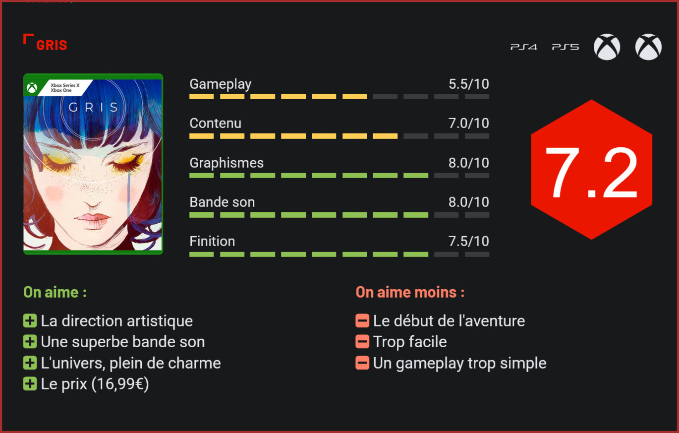 Sorti en 2019 sur Switch et PC, GRIS a enfin droit à son portage sur consoles de salon. Le jeu du petit studio espagnol Nomada mérite le détour… Vous étiez peut-être passé à côté de cette pépite indépendante, en 2019. Il faut dire que le jeu n’était sorti que sur deux plates-formes, et n’avait pas forcément beaucoup fait parler de lui. GRIS revient aujourd’hui sous le feu des projecteurs avec sa sortie sur consoles de salon. Unique en son genre, le jeu de Nomada Studio se rapproche davantage d’une œuvre contemplative que d’un jeu de plate-forme véritablement ludique. Le joueur y incarne Gris, une jeune femme – victime d’une expérience personnelle douloureuse – qui va vivre une expérience transcendante dans un univers féérique. L’aventure débute donc par une chute dans un monde en noir et blanc auquel Gris tentera de redonner ses couleurs à travers un véritable voyage initiatique. Simpliste, le gameplay du jeu se limite à une progression en ligne droite, quelques sauts et acrobaties. Et c’est à peu près tout. Mais l’intérêt de Gris ne réside pas dans son gameplay mais plutôt dans l’expérience – contemplative par nature. Le gameplay simpliste du jeu nous laisse tout le loisir d’admirer les superbes décors traversés – et dessinés à la main. GRIS surprend par sa superbe direction artistique. Une chose est certaine : Gris ne vous laissera pas indifférent de par sa direction artistique exemplaire, son univers charmeur et ses graphismes, à la fois minimalistes et superbes. Tout droit sorti d’une bande dessinée, l’univers de Gris séduit surtout par la richesse de son level-design, qui forcera le joueur à explorer des décors vertigineux et à s’engager dans de longues promenades mélancoliques. Visuellement superbe, le titre parvient à émouvoir par la richesse de son univers, la beauté de ses décors et les explosions de couleurs, qui redonnent progressivement vie au monde de GRIS. Autre élément qui donne une identité unique au jeu : sa formidable bande sonore, mélancolique par nature, qui accompagne merveilleusement le joueur à travers son voyage initiatique. D’autant plus que les développeurs l’utilisent à bon escient pour informer le joueur de plusieurs interactions possibles. Intelligent dans sa conception, séduisant et surtout très bon marché (il ne faudra débourser qu’une quinzaine d’euros pour en faire l’acquisition), GRIS souffre toutefois de quelques petits défauts qui l’empêcheront d’accéder au statut de titre culte – de sa difficulté très faible à sa prise en main trop simpliste, sans oublier les débuts un peu mous du genoux, qui ne donneront pas forcément l’envie au joueur d’aller plus loin dans l’aventure. Et pourtant, quelle terrible erreur cela serait de résumer GRIS à une simple expérimentation artistique tant le titre parvient à décrocher une certaine mélancolie et à raviver la flamme même chez le joueur le plus blasé. Un titre dans la droite lignée des Ori et autres Limbo, qui marquera la mémoire du joueur au fer rouge, à défaut de procurer de solides sensations de gaming. Conclusion Près de 3 ans après sa sortie sur Switch et PC, GRIS a enfin droit à un portage en bonne et due forme sur les consoles de salon. Les joueurs consoles pourront donc jouer aux séances de rattrapage avec cette petite pépite du jeu indépendant. Car GRIS, c’est le genre de jeu qui vous marque par sa direction inspirée, sa bande sonore mélancolique et ses décors stylisés. Un peu trop court, finalement plus contemplatif que ludique, et très facile, ce platformer old school ose une approche intimiste tout en adoptant un style graphique qu’on dirait tout droit inspiré d’une aquarelle. Le voyage n’est pas forcément très excitant sur le plan ludique, mais d’un point de vue contemplatif, le titre marque l’esprit. Le tout, pour une dizaine d’euros…