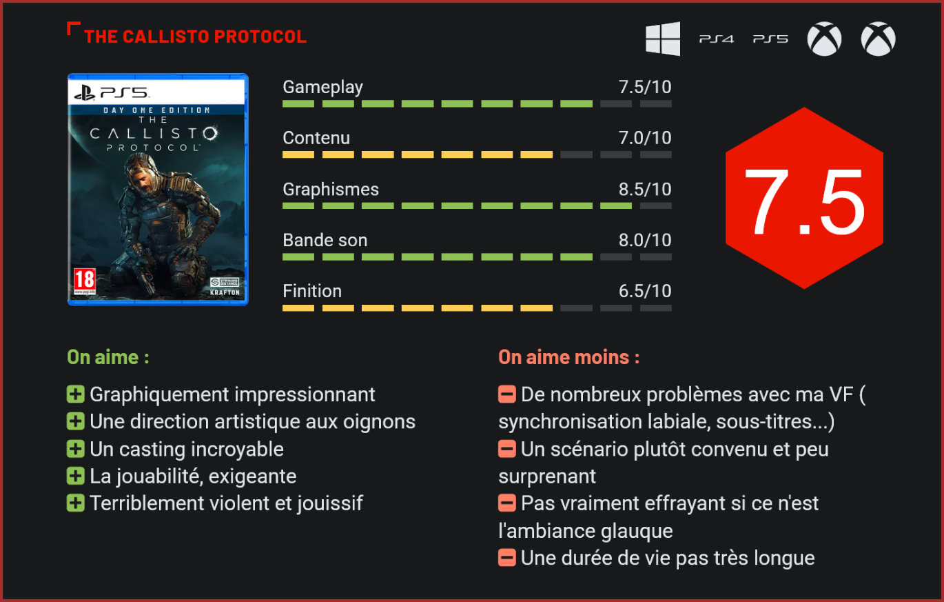 Deux ans après sa première présentation, The Callisto Protocol débarque en grande pompe en cette fin d’année. Attendu comme le messie du jeu d’horreur, le titre a-t-il toutes les armes pour assumer son statut ? Dire que The Callisto Protocol était énormément attendu est un doux euphémisme. C’est aux Game Awards 2020 que le jeu est présenté pour la toute première fois, générant alors une hype rarement rencontrée pour un jeu indépendant. Et pour cause, le titre est le premier de Striking Distance Studios, une filiale des développeurs de PUBG, créée par Glen Schofield, le papa d’un certain… Dead Space. Indéniablement, dès la première présentation, le jeu se présente comme un successeur de la célèbre franchise d’Electronic Arts. Jeu d’horreur à la troisième personne dans l’espace, le pitch de Callisto Protocol fait immanquablement penser à celui de Dead Space. Nous sommes directement propulsés en 2320, lorsque le capitaine Jacob Lee écrase son vaisseau sur la planète Callisto après un abordage mené par un groupe terroriste. Enfermé dans la prison de Black Iron, Lee se réveille un beau jour lorsqu’une étrange maladie infectieuse a transformé et tué l’ensemble de la population carcérale. Jacob doit alors, avec l’aide de la cheffe des terroristes qui l’avait précédemment attaqué, s’échapper de Black Iron et empêcher l’épidémie de se propager au-delà des murs de la prison. Un postulat de départ assez sympathique, qui n’est pas sans rappeler celui de certaines grandes productions holywoodiennes, comme Alien 3 et sa colonie minière pénitentiaire. Mais contrairement à ces films à grand budget, le scénario du jeu ne nous surprend jamais réellement. On suit l’histoire de Jacob sans réelle surprise et les événements s’enchaînent de manière plutôt logique, sans retournement de situation. Néanmoins, on découvre avec Jacob une aventure qui bouge et qui nous fait explorer l’ensemble de la prison et de ses alentours. Le scénario est assez bateau, s’apparentant à celui d’un film de S-F… en moins bien. Mais ce qui a probablement le plus emballé les fans à la présentation du jeu, ce n’est pas son scénario, mais bien son ambiance macabre et terriblement stressante. Callisto Protocol se présente comme un jeu d’horreur d’exploration spatiale dans lequel la mort peut vous surprendre à n’importe quel angle de couloir. Par horreur, entendons-nous bien sur le fait qu’on est, ici, loin d’un Alien Isolation ou d’un Resident Evil VII. Callisto Protocol se démarque surtout pour son ambiance que pour ses jump-scares. Ceux-ci ne dépassent pas la dizaine, et c’est principalement l’excellente direction artistique du titre qui nous met mal à l’aise et nous stresse durant toute notre progression. C’est en revanche dommage que le titre ne soit pas en mesure de réellement nous effrayer par moments, mais là ne semble pas être le principal pour les développeurs. N’ayons pas peur de le dire, le travail des artistes sur Callisto Protocol est titanesque et terriblement réussi. Les environnements au sein de Black Iron sont tous plus creepy les uns que les autres. La prison est rongée par le virus et la mort, qui parait nous attendre à chaque coin de couloir. Une fois sorti de l’environnement lugubre et clos de la prison, c’est à une magnifique lune enneigée que nous avons le droit, avec de splendides panoramas très bien fichus. L’occasion pour nous d’aborder l’excellent travail réalisé par les équipes de Striking Distance sur la technique et les visuels de leur titre. Certes, l’intérieur de la prison est sombre et ne pourrait pas prêter, à première vue, à de l’admiration. Et pourtant, d’incroyables effets de lumière venant des luminaires de la prison ou de notre lampe torche viennent éclairer ces couloirs si bien réalisés. Les environnements extérieurs, comme évoqué plus haut, sont également très réussis. Enfin et non des moindres, les modélisations et animations faciales sont juste époustouflantes. Avec son casting trois étoiles (Josh Duhamel, Sam Witwer ou encore Karen Fukuhara), Callisto Protocol s’apparente tout simplement à un vrai film tant les visages sont criants de réalisme grâce, notamment, à la motion capture. Callisto Protocol possède une ambiance et une direction artistique au poil. Cependant, on regrettera que le titre ne fasse pas suffisamment peur. La direction artistique de Callisto Protocol ayant été abordée, il est désormais temps de s’intéresser à ce qui importe évidemment le plus dans un jeu vidéo : le gameplay. Si vous vous attendiez à un jeu qui bouge dans tous les sens et qui mette en avant l’action et le sensationnalisme, vous risquez d’être déçu. Certes, le sensationnalisme est de la partie lors des affrontements épiques avec les monstres. Mais là où aurait pu avoir de l’action, Glen Schofield et ses hommes ont privilégié un jeu d’exploration dans lequel l’ennemi peut à tout moment nous sauter à la gorge et vouloir notre peau. Nous n’en sommes pas au point du Walking Simulator, mais presque. C’est plutôt lent, et ce, autant dans les déplacements que dans les affrontements. Là où Dead Space est davantage axé sur les combats à distance avec des armes à feu, Callisto Protocol trouve un juste équilibre entre le corps-à-corps et le tir. Les attaques frontales sont même prioritaires avec une matraque électrique volée à un garde mort. Le titre se veut d’ailleurs ultra-exigeant sur ce point. Une attaque rapide et lourde sont disponibles, et le seul moyen de ne pas subir de dégâts sur les attaques est de bouger le joystick gauche au moment où l’ennemi vous attaque. Gauche ou droite pour une esquive, en arrière pour un contre. Le timing pour l’exécuter est très serré, ce qui rend la chose très exigeante et, parfois, frustrante. Même à un niveau de difficulté peu 