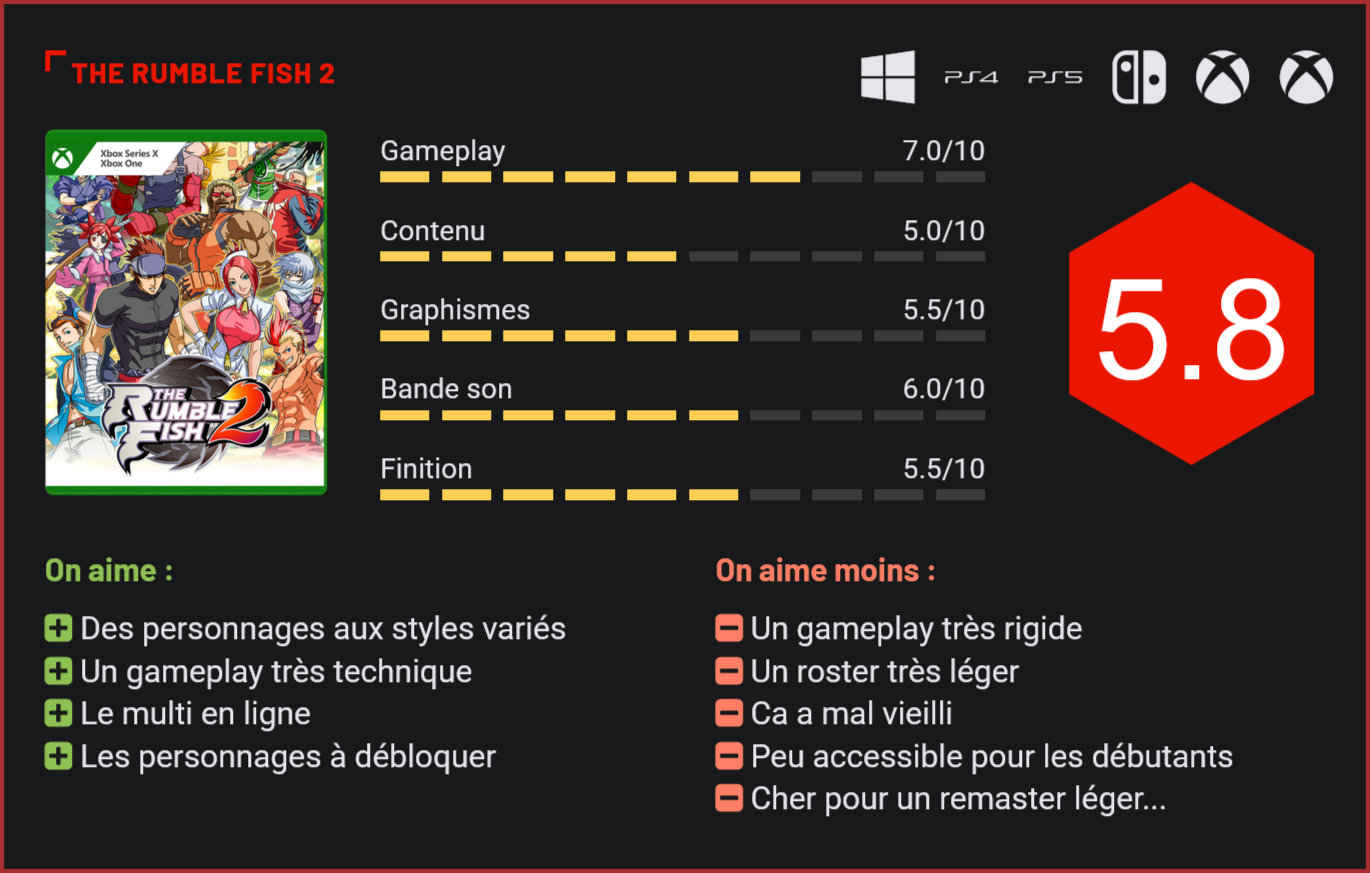 Sorti en arcade en 2005, The Rumble Fish 2 est devenu à travers les années un classique du genre aux yeux des amateurs de baston 2D. Relativement méconnue du grand public, la série débarque aujourd’hui sur consoles de salon avec un remaster de ce second épisode… The Rumble Fish 2 n’est clairement le jeu qui viendra concurrencer un Street Fighter 6 ou un King of Fighters XV. Le jeu de Dimps s’adresse aux puristes, et non pas aux débutants, ni même d’ailleurs aux joueurs confirmés. Pas de tutoriels dignes de ce nom ici pour vous guider dans le gameplay, tout s’apprend sur le tas. D’ailleurs, le titre ne propose pas non plus de vrai mode solo, il faudra se contenter d’un seul mode arcade. Les décors sont très pauvres. Vous l’aurez compris, l’austérité est de rigueur. Coté gameplay d’ailleurs, The Rumble Fish 2 se rapproche davantage d’un Garou Mark of the Wolves de par la technicité de ses combats et la rigidité de ses combattants, que d’un Tekken ou d’un Dead or Alive. Un jeu de baston 2D pur jus donc, qui s’adresse avant tout aux connaisseurs. La prise en main n’est pas évidente pour un débutant. On retrouve ici quatre boutons d’attaques qui correspondent chacun à un membre, et un bouton d’esquive. Ca paraît simple au premier abord, mais quelques éléments viennent ajouter de la complexité au gameplay. Tout d’abord, il est possible de se mettre en garde même dans les airs. Les contres ont donc la priorité dans le jeu. Ensuite, on retrouve une petite originalité avec deux jauges de puissance. La première se remplit au fil de vos attaques, la seconde au fil des coups encaissés. Elles comprennent toutes les deux plusieurs portions. Vous l’aurez donc compris, le jeu fait la part belle aux attaques spéciales et le joueur qui est en train de perdre peut revenir dans la partie assez facilement avec une attaque spéciale lancée au bon moment. Autre spécificité du jeu d’ailleurs : quelques coups seulement suffisent pour mettre un adversaire au tapis. Il faut donc être prudent, parfaitement maîtriser son personnage et jouer avec le timing pour remporter la partie, et autant vous dire qu’on n’avait plus vraiment l’habitude d’un gameplay aussi technique! Clairement, The Rumble Fish 2 est donc un jeu qui s’adresse avant tout aux puristes, et qui pourrait en ce sens trouver son public. Le casting est composé d’une dizaine de personnages seulement. L’ennui, c’est que niveau contenu, cela paraît très léger. On dénombre une dizaine de personnages seulement (qui disposent toutefois tous de leur propre style!), un seul mode solo, pas de tutoriel… Et côté technique, le jeu a très mal vieilli. Certes, les personnages ont un style réussi, mais les décors sont pauvres et les animations extrêmement rigides. Le remaster n’offre guère de vrai upgrade au niveau de l’esthétique, qui reste très sobre. Clairement, l’intérêt du remaster réside dans le mode multi en ligne, qui permettra aux fans de s’affronter. La communauté est toutefois toute petite et surtout les fonctionnalités sont peu nombreuses. On peut toutefois compter sur un rollback netcode qui garantit des affrontements très stables. A 29,99€, l’ardoise n’en reste pas moins salée pour un jeu de baston 2D relativement méconnu, qui aurait gagné à être rendu plus accessible et à gagner en contenu pour son retour sous le feu des projecteurs… Conclusion Sorti en 2005 en arcade, The Rumble Fish 2 est un jeu de baston 2D qui s’adresse avant tout aux puristes du genre. Extrêmement technique, le titre sait tirer parti de quelques spécificités pour se distinguer des classiques du genre. Il compense également son casting un peu léger par des personnages aux styles très différents. S’il est plaisant à jouer, The Rumble Fish 2 n’est toutefois pas un jeu très accessible et ce remaster n’apporte que très peu de nouveautés (principalement, un mode en ligne). Visuellement, le jeu a très mal vieilli et niveau contenu, il est très difficile de justifier les 29,99€ auxquels le titre est vendu. Vu l’absence de mode tutoriel, mieux vaut donc passer votre tour si vous n’êtes pas du genre à maîtriser parfaitement tous vos combos.