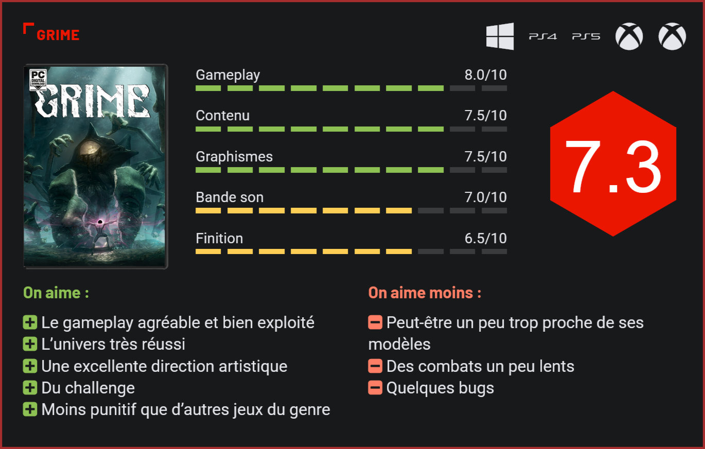 À l’occasion de la sortie du DLC “Colors of Rot” ainsi que du déploiement du titre sur plusieurs consoles, nous jetons un œil à Grime, un jeu d’action “Souls-like” en 2D. Le studio israélien Clover Bite prouve son savoir-faire avec ce titre aux nombreuses qualités, malgré une formule désormais habituelle dans de nombreux jeux indépendants. Le studio israélien Clover Bite est à l’origine de ce Grime. Il s’agit d’un jeu d’action, d’aventure avec quelques touches de plate-forme en 2D, un Metroidvania plutôt réussi. Réalisé en collaboration avec Akupara Games, le titre nous propose d’explorer un univers sombre inspiré de nombreux titres du genre des Souls-like. S’il est sorti il y a plus d’un an sur PC, le titre est disponible depuis peu sur les consoles Xbox et Playstation. Une version Switch est bien prévue pour une date encore non précisée. L’ambiance du titre reste très mystérieuse. Grime est un titre qui tente, lui aussi, d’utiliser la formule du Souls-like en 2D sur fond d’environnements labyrinthiques à explorer et de scénario cryptique. Nous incarnons un être fait de pierre avec un trou noir à la place de la tête. À peine né, celui-ci explore cet univers rempli de créatures aux proportions imparfaites. Une bonne partie du scénario est très mystérieux et laissé à notre interprétation. Comme beaucoup de jeux du genre, Grime possède une direction artistique sombre et propose de croiser des créatures au design grotesque. Sans pour autant être techniquement impressionnante, la production de Clover Bite arrive tout de même à proposer un univers original et captivant. Si le titre propose généralement des environnements aux ambiances plutôt habituelles pour le genre, l’aventure va tout de même nous emmener dans des endroits beaucoup plus originaux. Ces décors sont habilement mis en scène et proposent une ambiance tout à fait réussie, ambiance renforcée par une bande-son et un sound design qui colle parfaitement au ton. L’aventure va nous emmener dans tout un tas d’endroits étranges. Pour explorer ces environnements sereinement, nous devons également nous débarrasser de très nombreux ennemis. Notre personnage peut être équipé de plusieurs pièces d’armures, de nombreux objets aux fonctions diverses ainsi que de deux armes différentes. Malgré les différences de poids dépendant des armes, les combats sont assez lents et demandent de la précision. Battre des ennemis et casser des éléments de décors permet de récolter de la masse, une monnaie qui servira notamment à augmenter le niveau et les statistiques de notre personnage. S’il n’y a rien de très original dans son concept, Grime est un jeu qui applique tout le même très efficacement des codes du genre auquel il appartient. Le gameplay est très agréable et répond bien, tandis que les mécaniques sont utilisées intelligemment. Par exemple, le titre encourage beaucoup l’utilisation de la parade, notre capacité à contrer une attaque ennemie en appuyant sur le bouton assigné au bon moment. Les mouvements des ennemis sont souvent faciles à comprendre, une aubaine tant la parade, ou “l’absorption” telle qu’elle est appelée ici, est un outil primordial. Celle-ci est d’abord un outil de combat non négligeable, puisqu’une fois la vie d’un ennemi amenée à un certain seuil, lui faire une parade va le détruire en un coup. Ensuite, détruire les différents types d’ennemis de la sorte permet à notre personnage de débloquer des compétences passives très utiles. Finalement, la parade permet de remplir une jauge de souffle, qui peut être dépensée pour nous soigner. Grime préconise donc la patience avant tout pour s’en sortir. Les boss sont visuellement impressionnants. Grime est également un Souls-like qui n’est pas d’une difficulté insurmontable. Le titre sait se montrer corsé, et nous pose quelques petits pièges de temps à autre. Cependant, passer du temps à explorer pour trouver les différents objets ainsi que combattre beaucoup d’ennemis permet de s’en sortir convenablement. La mort est aussi moins punitive que dans les jeux du genre puisque nous ne perdons pas de masse dans le processus. À la place, nous perdons de l’ardeur, accumulée en battant des ennemis et qui permet de gagner plus de masse. Grime propose du challenge sans pour autant être impitoyable. Le titre est désormais fourni avec un DLC gratuit, intitulé “Colors of Rot”, qui apporte de nombreux ajustements à l’expérience ainsi que du nouveau contenu bienvenu (de nouveaux endroits à visiter, de nouvelles armes et boss à combattre…). L’aventure prend un peu plus d’une dizaine d’heures pour être complétée, et malgré une formule aujourd’hui bien connue ainsi que la présence de quelques bugs, le titre arrive à exploiter ses mécaniques intelligemment. Le résultat est très convaincant. Conclusion Sorti originellement l’année dernière sur PC, Grime refait parler de lui puisqu’il a débarqué sur consoles Playstation et Xbox il y a quelques jours. Il s’agit d’un jeu d’action et d’aventure en 2D reprenant la formule des Souls-like ainsi que des Metroidvania. Nous incarnons un être fait de pierre avec un trou noir à la place de la tête. À peine né, celui-ci explore cet univers sombre et peuplé de créatures grotesques. Tout comme une bonne partie des jeux du genre, Grime repose sur un scénario très cryptique ainsi qu’une bonne difficulté. Les combats sont parfois assez lents, mais restent agréables à prendre en main et bien pensés, exploitant les différentes mécaniques intelligemment. Le titre ne propose pas non plus une difficulté insurmontable, et se montre même moins punitif que d’autres jeux du genre. Cette nouvelle sortie sur consoles est également accompagnée d’un DLC gratuit disponible sur toutes les plateformes. Intitulée “Colors of Rot”, l’extension