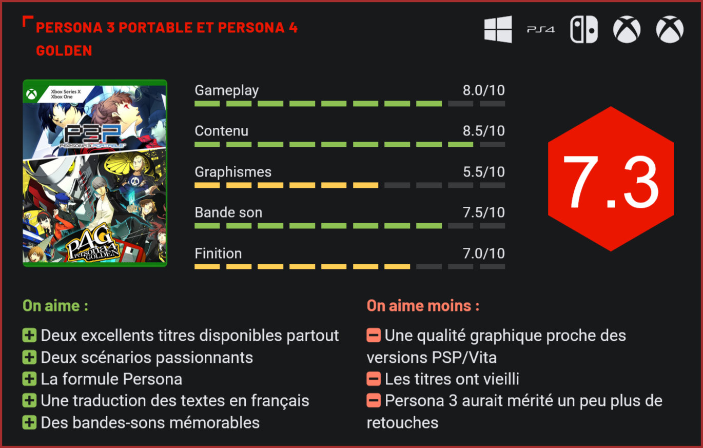 Après Persona 5 Royal ressorti sur toutes les machines actuelles il y a quelques mois, Atlus nous propose de nouvelles versions de Persona 3 et Persona 4. Les deux titres originellement sortis sur Playstation 2 sont de retour dans des éditions améliorées. Après le succès retentissant de Persona 5 et de sa version “Royal”, il est logique de voir débarquer de nouvelles versions des précédents jeux dans le but de les faire découvrir à ce nouveau public naissant. Depuis quelques jours, Persona 3 et 4 sont tous deux disponibles sur toutes les consoles et PC actuels. Pour être précis, il s’agit spécifiquement des versions “Portable” et “Golden” des deux titres, des versions améliorées sorties respectivement sur PSP et PSVita. Persona 3 et 4 sont des JRPG longs et bavards. Persona 3 se déroule dans un endroit fictionnel du Japon nommé Tatsumi Port Island. Nous prenons alors le contrôle d’un lycéen ou d’une lycéenne, qui va découvrir que cet endroit cache de très lourds secrets. En effet, un phénomène paranormal a lieu toutes les nuits. “L’heure sombre” commence à minuit et se déroule entre les deux jours. Durant cette période, les gens se transforment en cercueils et des “ombres” (des créatures qui attaquent l’esprit des vivants) rôdent dans toute la ville. Notre protagoniste a la capacité de rester lui-même durant l’heure sombre, et va alors rejoindre un groupe qui combat les ombres grâce à des entités qu’ils peuvent invoquer : les Personæ. De son côté, Persona 4 nous plonge dans le quotidien d’un lycéen qui débarque dans la petite bourgade fictionnelle de Inaba. Une suite inexpliquée de meurtres et des phénomènes étranges poussent notre protagoniste et ses nouveaux camarades de classe à enquêter. Le héros prend alors conscience de son étrange pouvoir lui permettant de rentrer dans les postes de télévision. Cette compétence lui donne la possibilité de pénétrer dans un autre monde étrange calqué sur les émotions des humains. Ici aussi, cette réalité est remplie d’ombres, que nos personnages peuvent combattre en utilisant leur Persona. Le système de combat est simple, mais très efficace. Les deux titres racontent des histoires plutôt sombres et aux thématiques lourdes, mais savent apporter un peu de légèreté quand c’est nécessaire. Atlus nous ressort deux histoires très réussies et passionnantes à parcourir. Malgré tout, les deux jeux ont des directions artistiques qui contrastent beaucoup avec ces thématiques plus sérieuses. Persona 3 et 4 proposent des touches très colorées qui semblent aujourd’hui être les premiers pas de ce qui sera accompli avec Persona 5. Les deux titres proposent également des bandes-sons uniques et très mémorables. Dommage que les décors et les modèles 3D restent les mêmes que dans leurs dernières versions sur consoles portables. Côté gameplay, les deux jeux se ressemblent beaucoup et proposent des mécaniques très efficaces. Les titres alternent entre des phases plus narratives (qui incluent la gestion des activités de notre personnage et des relations qu’il tisse avec les autres membres du groupe) ainsi que des phases d’explorations de donjons. Ces dernières occasionnent évidemment des combats qui se déroulent au tour par tour. Les deux titres proposent un système de jeu classique, mais avec quelques bonnes idées. Exploiter les faiblesses des différents ennemis permet de les étourdir et d’obtenir une action supplémentaire, un outil qu’il faut prendre en compte pour s’en sortir face à deux jeux qui se révèlent parfois corsés. Nous sommes également amenés à utiliser différents Personæ, des créatures qui possèdent diverses compétences à utiliser en combat. Persona 3 Portable est présenté comme un point & click. S’il est très plaisant de revoir ces deux excellents titres qui étaient peu accessibles auparavant, il faut souligner que ces nouvelles versions ne proposent presque pas de nouveautés. Pas de grandes retouches graphiques, à l’exception d’un passage en haute définition, Persona 3 Portable et Persona 4 Golden restent très fidèles à leurs versions sur PSP et PSVita. Les deux titres ont cependant droit à plusieurs modes de difficultés réglables à tout moment ainsi qu’à un ajout significatif puisqu’ils sont proposés, pour la première fois, avec une traduction des textes en français. Une nouveauté très appréciable tant ces deux épisodes peuvent être bavards. Les jeux gardent évidemment leur structure qui peut se révéler un peu vieillotte. Persona 3 Portable souffre particulièrement de cet aspect puisqu’il alterne entre ses phases de narration présentées tel un visual novel et l’exploration de donjons peu détaillés. Les deux portages sont néanmoins propres sur tous les supports, et conformes à leurs versions précédentes. Dans les deux cas, nous parlons ici de titres particulièrement longs et à la rejouabilité élevée. Chacun d’entre eux est proposé pour le tarif abordable de 19,99€, mais ils sont également disponibles via le game pass. Conclusion Après le succès de Persona 5 et de sa version “Royal”, Atlus nous propose de redécouvrir les deux précédents épisodes de ces spin-offs de Shin Megami Tensei. Persona 3 Portable et Persona 4 Golden sont tous deux disponibles sur toutes les machines actuelles. Ces deux nouvelles moutures sont peu ou prou des ressorties des versions améliorées déjà parues sur PSP et PSVita. Dans Persona 3, nous incarnons un lycéen ou une lycéenne qui part étudier à Tatsumi Port Island. Notre personnage va vite découvrir qu’un phénomène paranormal affecte cet endroit toutes les nuits et va devoir combattre à l’aide de ses Personæ. De la même manière, le protagoniste de Persona 4 va débarquer dans la petite ville d’Inaba où se déroulent des meurtres et disparitions mystérieuses. Le héros va découvrir